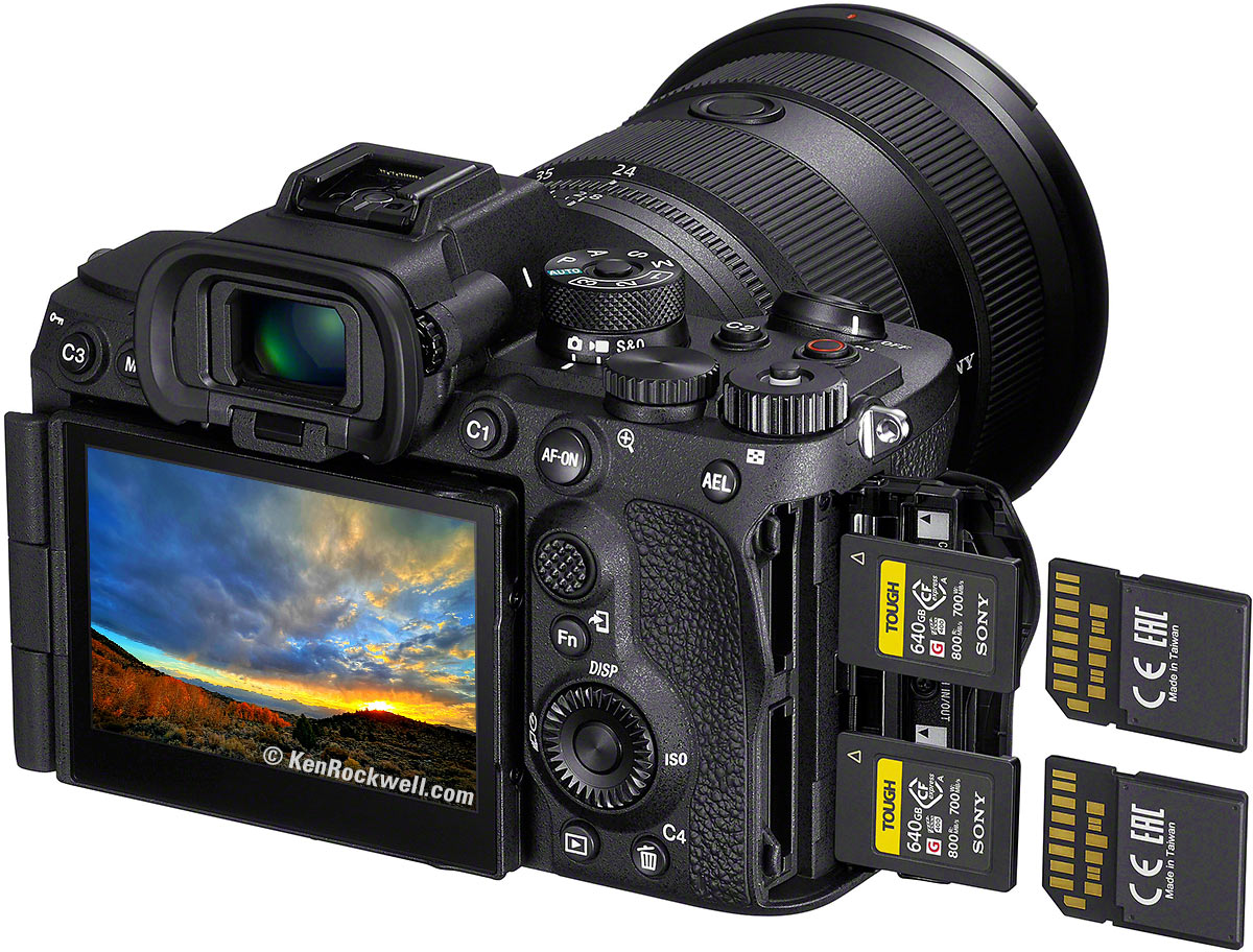 Takes standard SD cards, but only also takes Sony's very expensive CFexpress type A cards, not the more popular and much less expensive CFexpress type B cards.