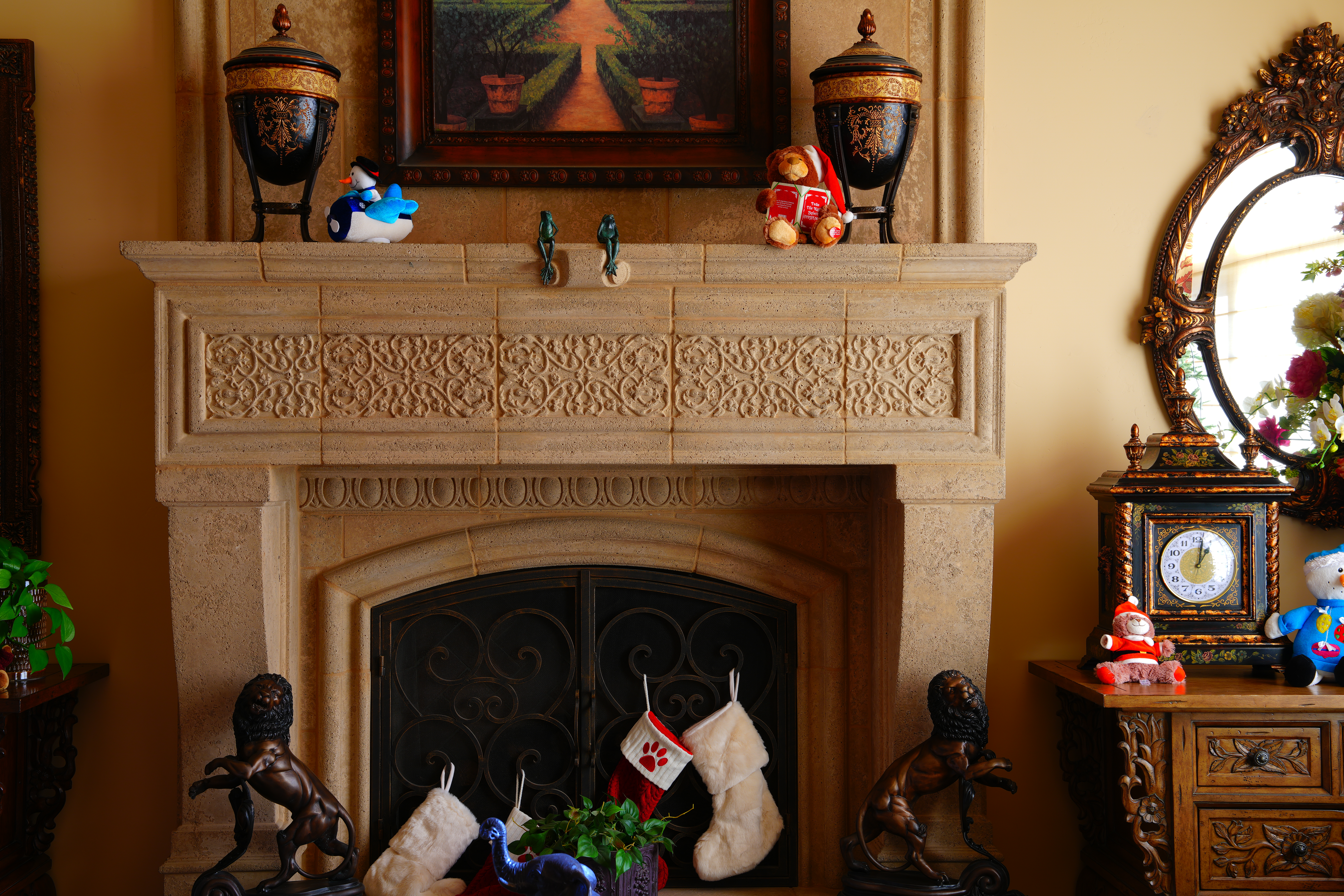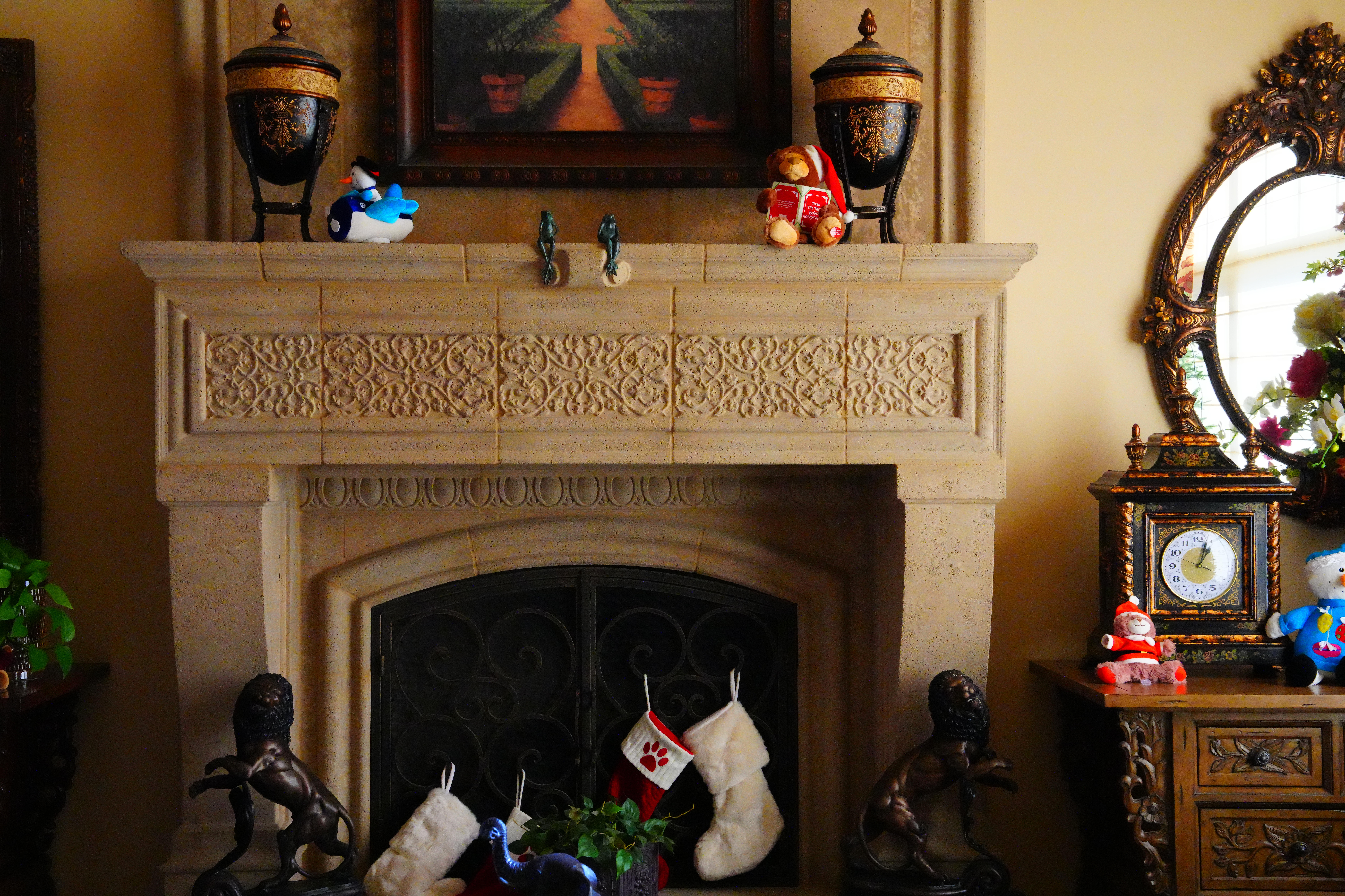 Here are different crops from the same images as above, now showing the dark grillwork of the fireplace.