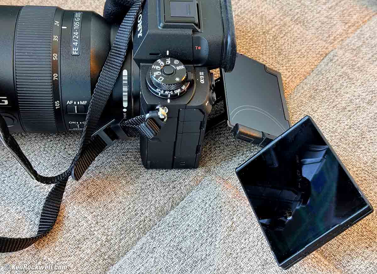 LCD Monitor specifications top3.2" (80 mm) diagonal, 2,095,104 dot touch-screen LCD on an unusually flippy mechanism. It rotates 98º up and 40º down. It flips out 180º horizontally: Sony A9 Mk III and Sony FE 24-105mm f4 G OSS. bigger. When flipped out as shown, flips around 270º. It can do all sorts of crazy things like this below, and even flips forwards. Sony A9 Mk III and Sony FE 16-35mm f/2.8 GM II. bigger.