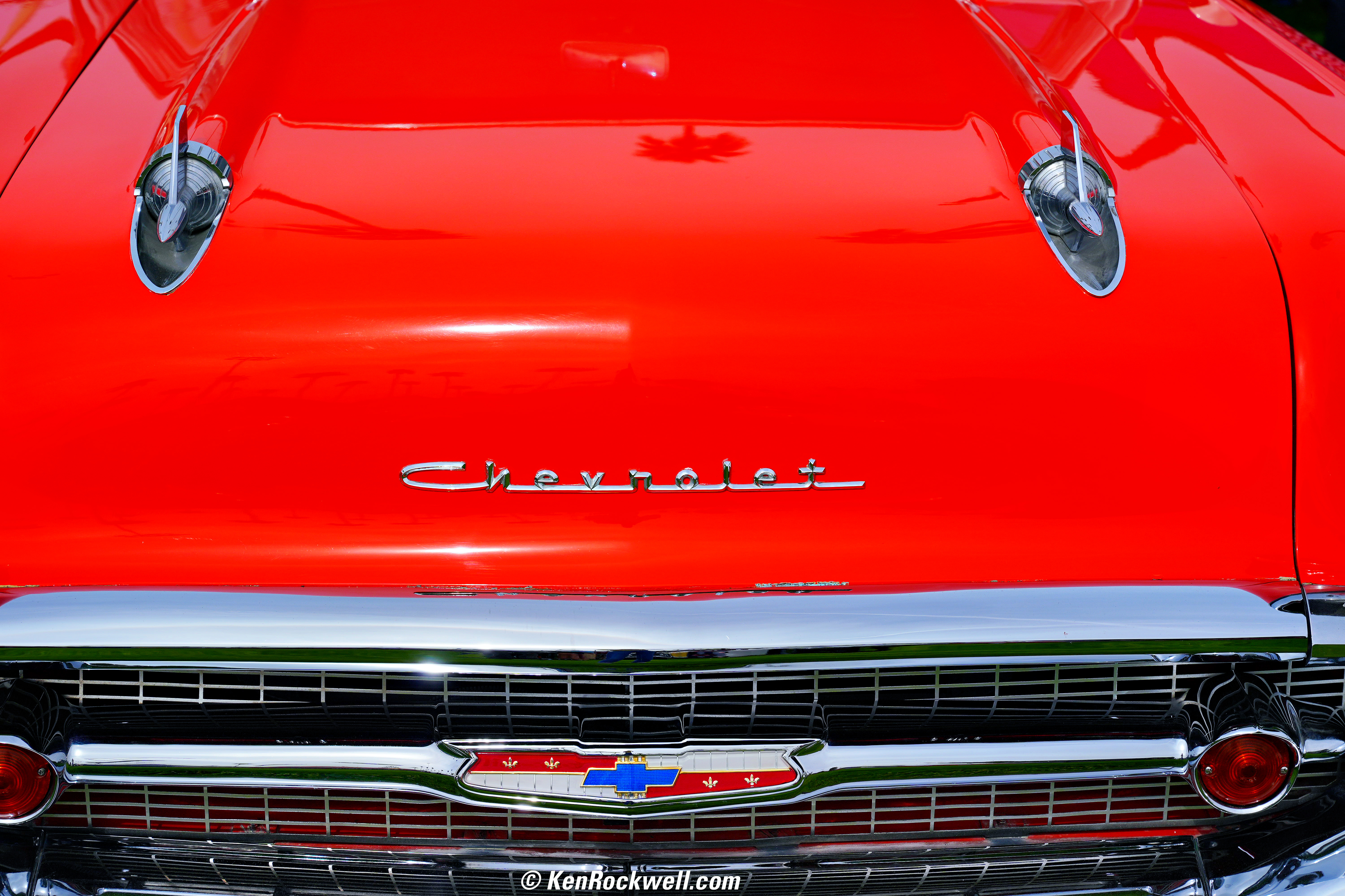 Matador Red 1957 Chevrolet Bel Air, La Quinta Car Show, La Quinta, California, 10:43 AM, Saturday, 24 February 2024. Sony A9 Mk III VIVID image with +9 Saturation, Sony FE 20-70mm f/4 G at 70mm at f/8 at 1/1,250 at Auto ISO 250 (LV 15.0), Radiant Photo software. bigger or full-resolution 24 MP, 5 MB JPG file.