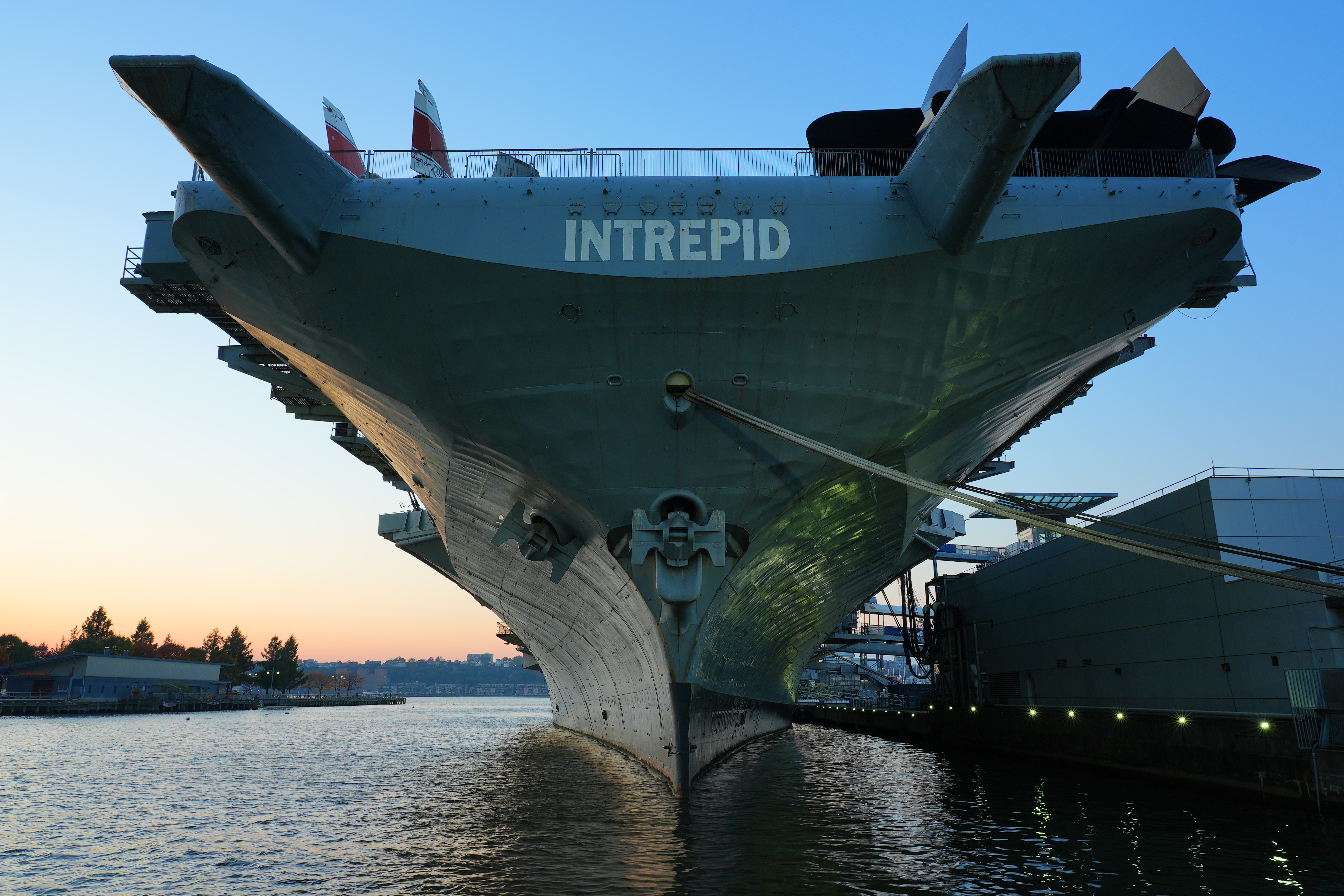 The Intrepid, Chelsea at Dusk, Pier 86, Manhattan, 4:43 PM, Tuesday, 07 November 2023. Sony A9 Mk III at +9 Saturation, Sony FE 24-105mm f4 G OSS at 24mm at f/11 at 1/15 at Auto ISO 250, -0.7 stops exposure compensation (LV 9.5), color and deliberate vignetting and contrast added in Photoshop CS6 (from 2012). bigger or camera-original © file.