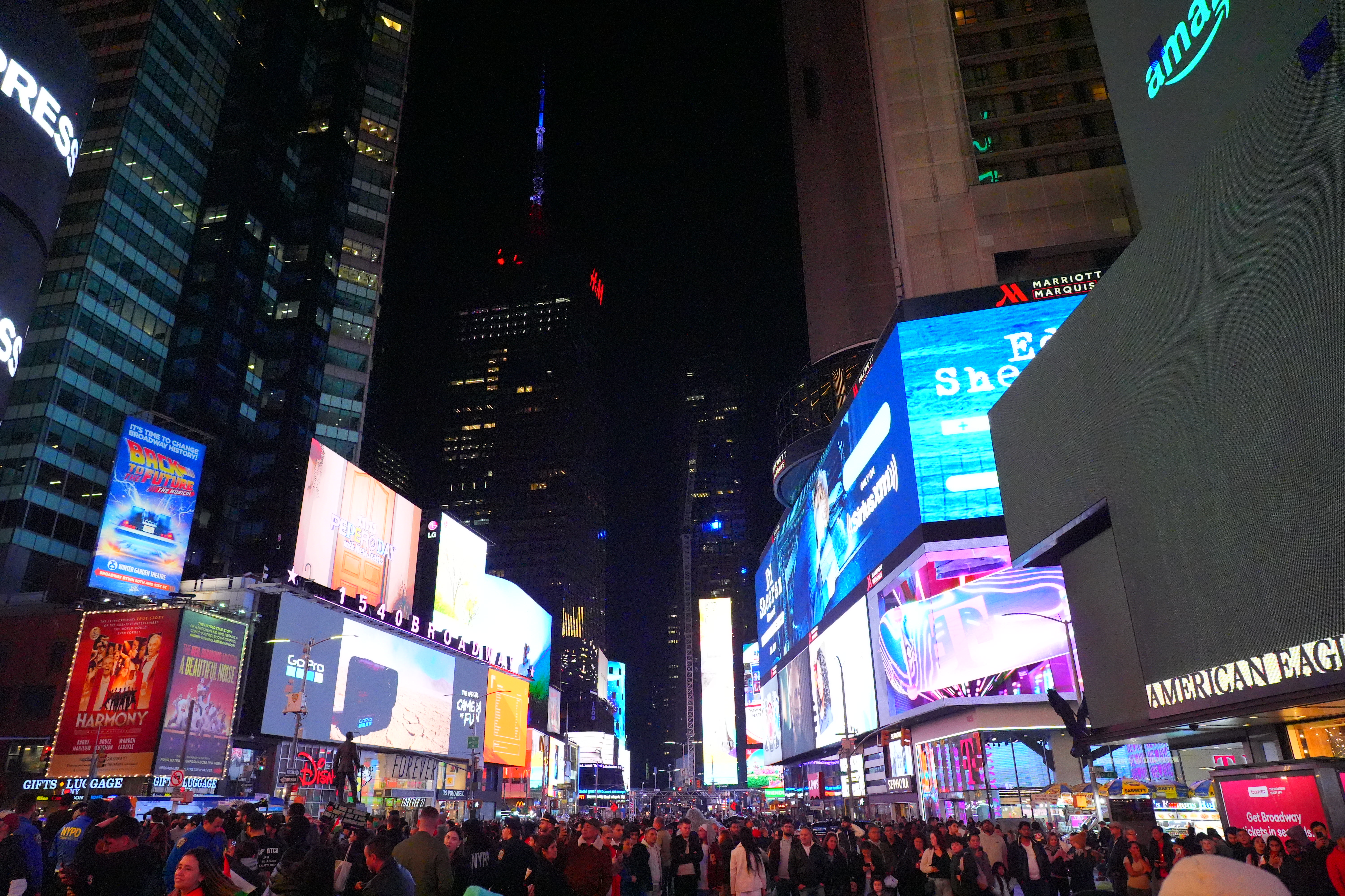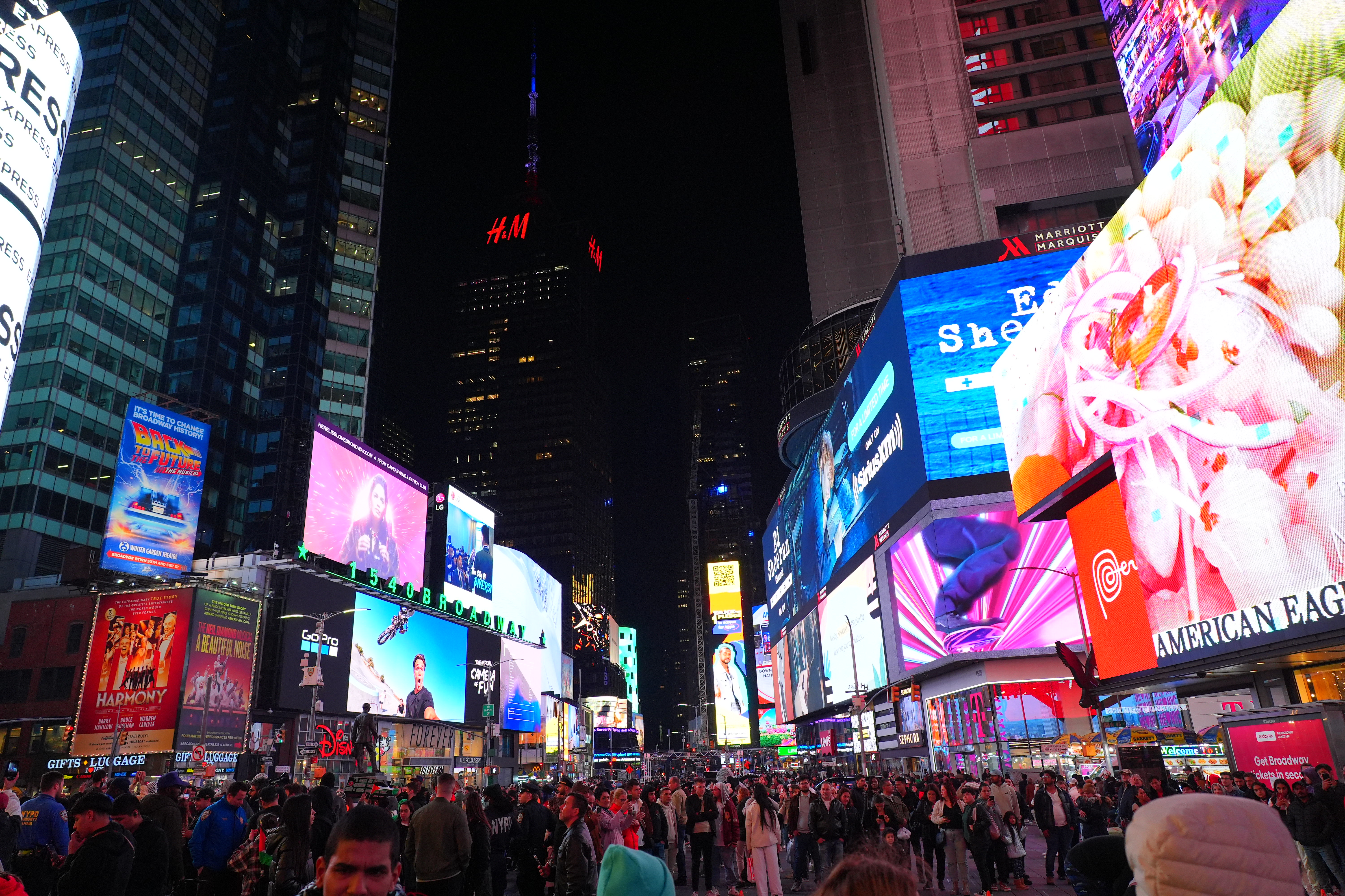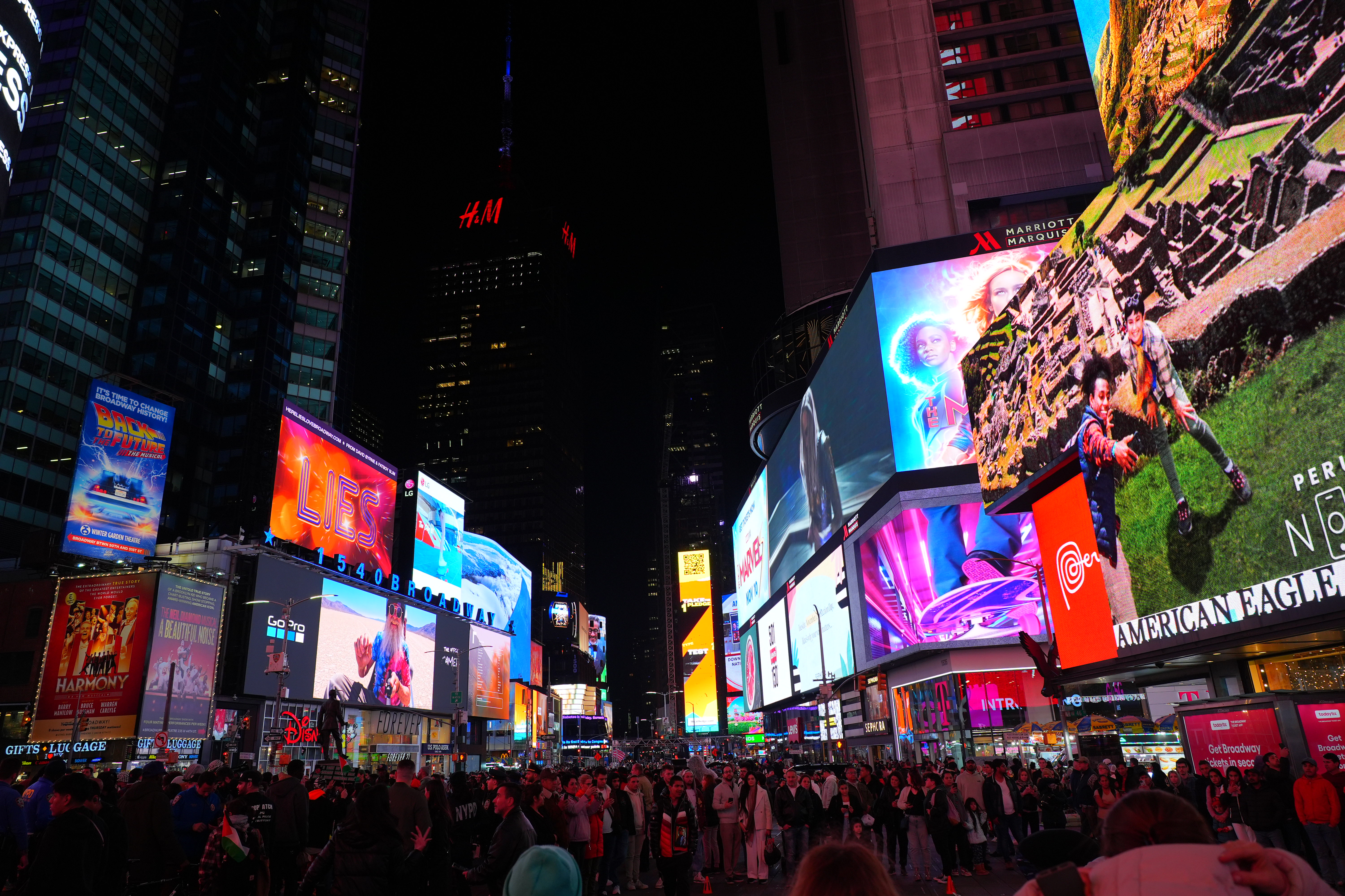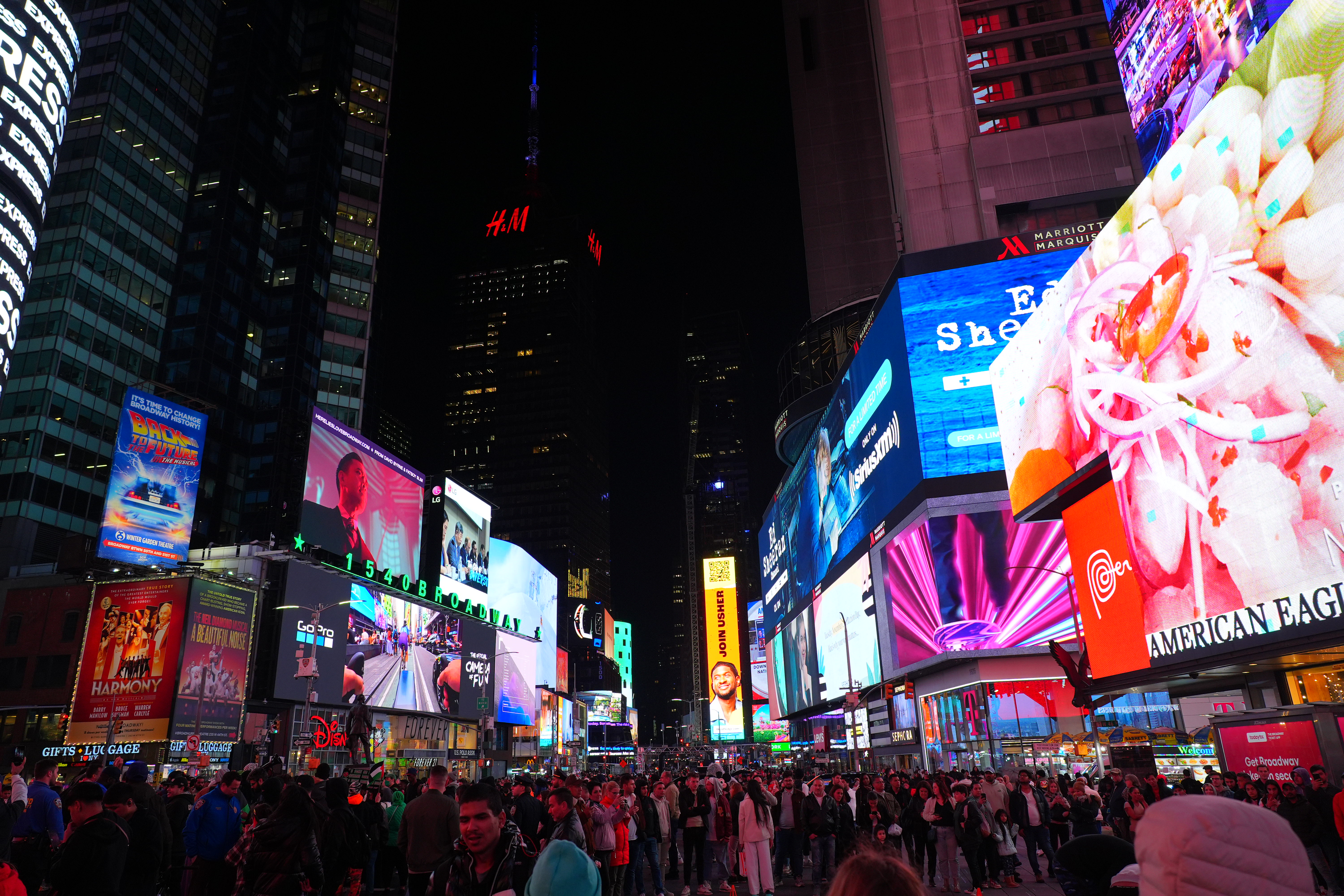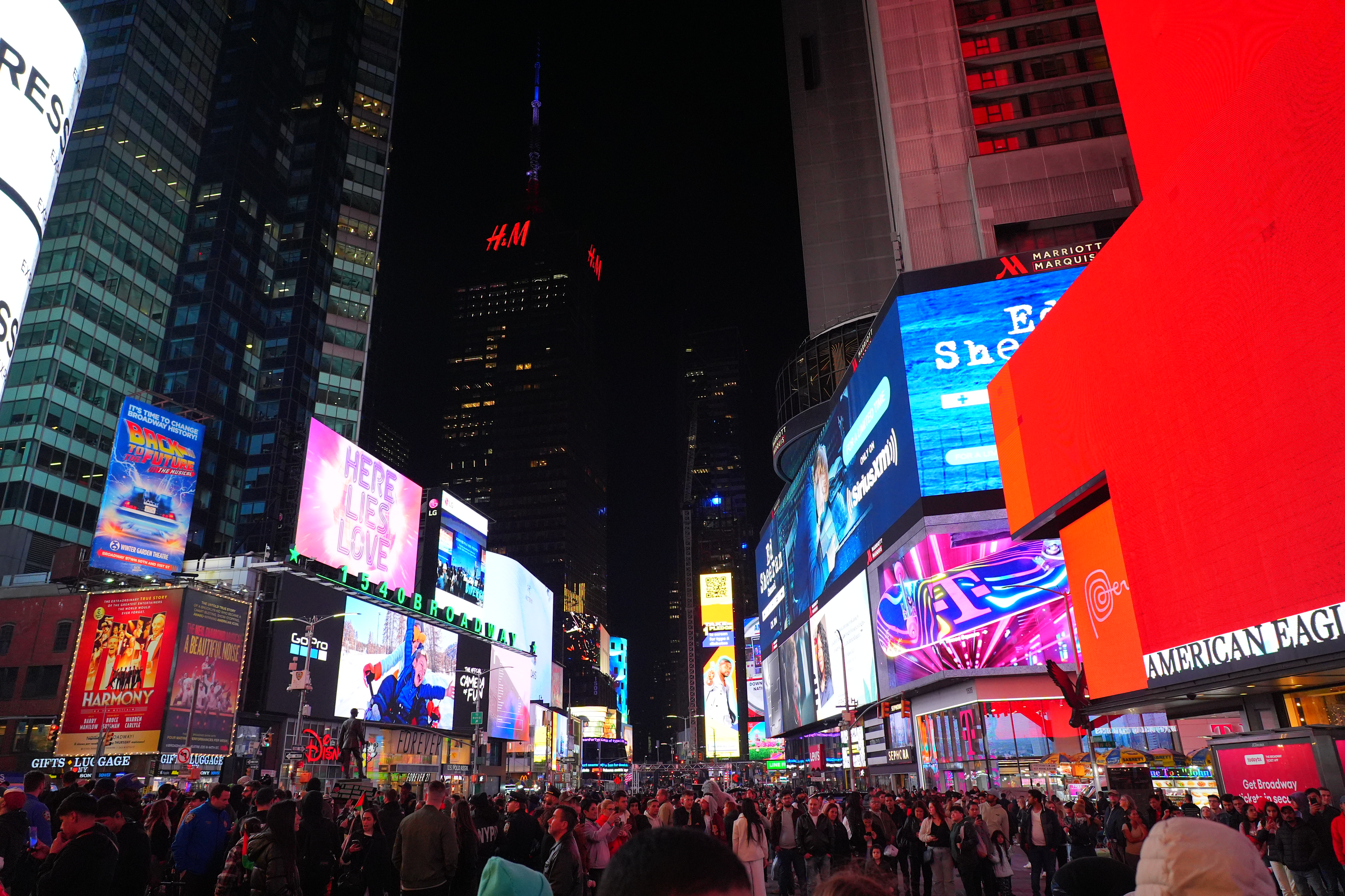 New York's Theater District High ISOs performance topAs seen at normal image sizes below, the A9 III pretty much makes the same images from ISO 125 (L) to ISO 25,600. ISO 51,200 (Hi 1.0) gets a little blotchier or noisy, but it's no big deal unless you're enlarging it, at which point the ISO 51,200 images are softer, noisier and blotchier. While ISO 51,200 (H) doesn't look that great, it doesn't look much different on other models that provide higher ISO settings! In other words, while the A9 III doesn't go any higher than ISO 51,200, it doesn't look any worse than other cameras like the older A9 II or A7 III at ISO 51,200. The other cameras can be set higher, but look worse and worse at higher settings. This suggests that the A9 III simply ran out of the processing power needed to process the greater noise reduction needed for higher ISOs at its insane 120 FPS while it's busy processing focus and exposure and everything else going on. This suggests that more efficient firmware in the future may unlock higher ISOs, and we might see higher ISOs in production models in February 2024. Only time will tell. This is no big deal because higher ISOs are silly. No one needs ISOs above 10,000 unless they're doing something wrong. For instance, all these images below were easy to get hand-held at ISO 125 with an f/4 lens; no one would shoot any of this above ISO 250. Even shooting in pitch black on city streets or well-lit sports indoors, ISO 1,000 is all I need; not even ISO 1,600 or ISO 3,200. Five-digit ISOs and above are mostly for people who spend more time comparing printed specifications than shooting for a living. Even before stabilization I had no problem shooting hand-held under full moonlight at ISO 6,400 with a 28mm f/1.4 lens. High ISOs are mostly a sales feature; if this is all you worry about, look other cameras like even the A7 III for better stupid-high ISO performance. At the ISOs pros need for shooting properly-lit subjects, the A9 III is more than good enough. Don't read too much into these snaps below. They're hand-held with autofocus, and the focus will drift from shot to shot depending on where the AF system felt like focussing. Likewise, half the signs are active LED screens changing colors and images each frame. The A9 III does a great job capturing everything without banding, but each shot is different because everything is changing so fast. Click any for the camera-original © 24 MP JPG LIGHT files (about 5 MB each): Click any for the camera-original © 24 MP JPG LIGHT files (about 5 MB each).