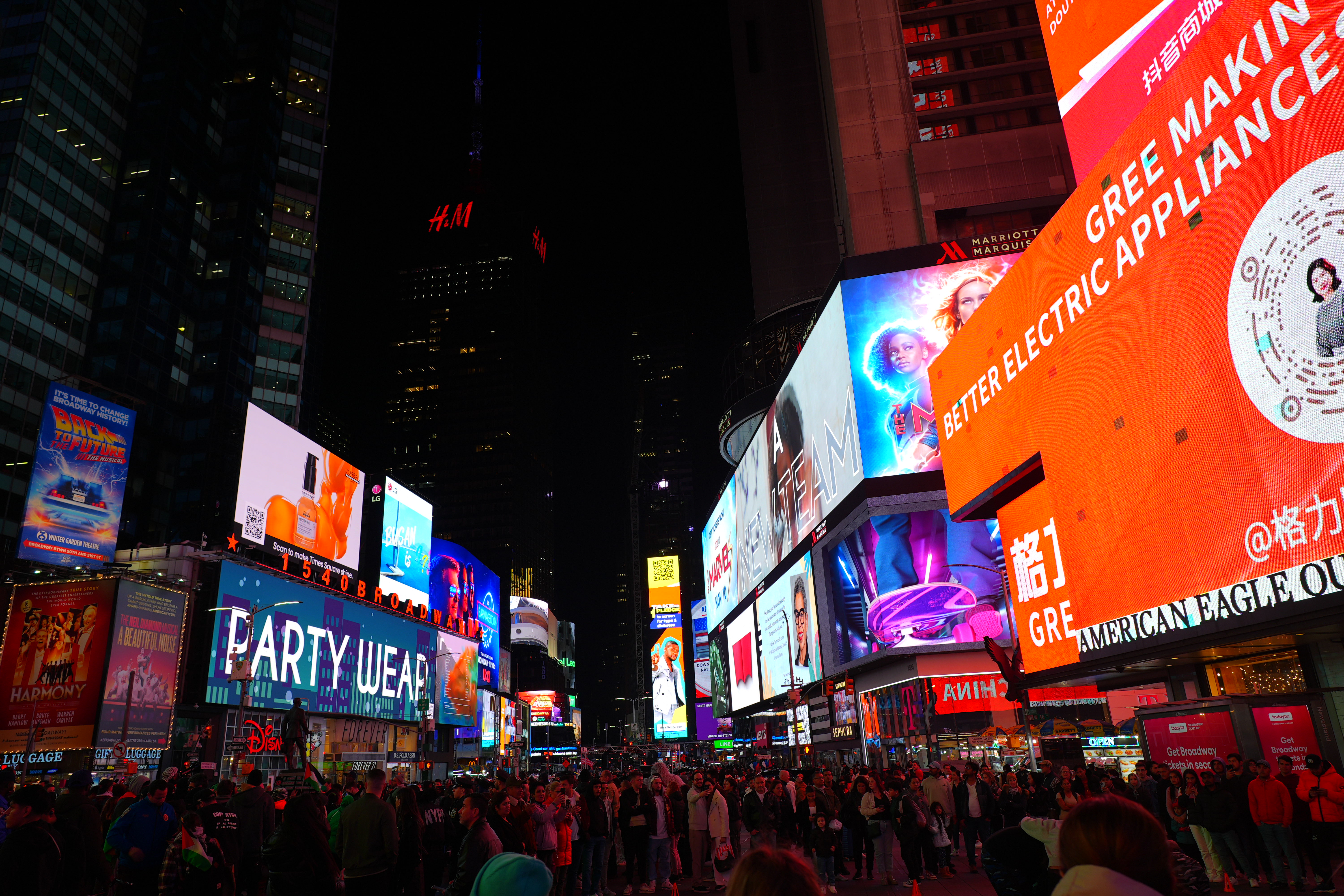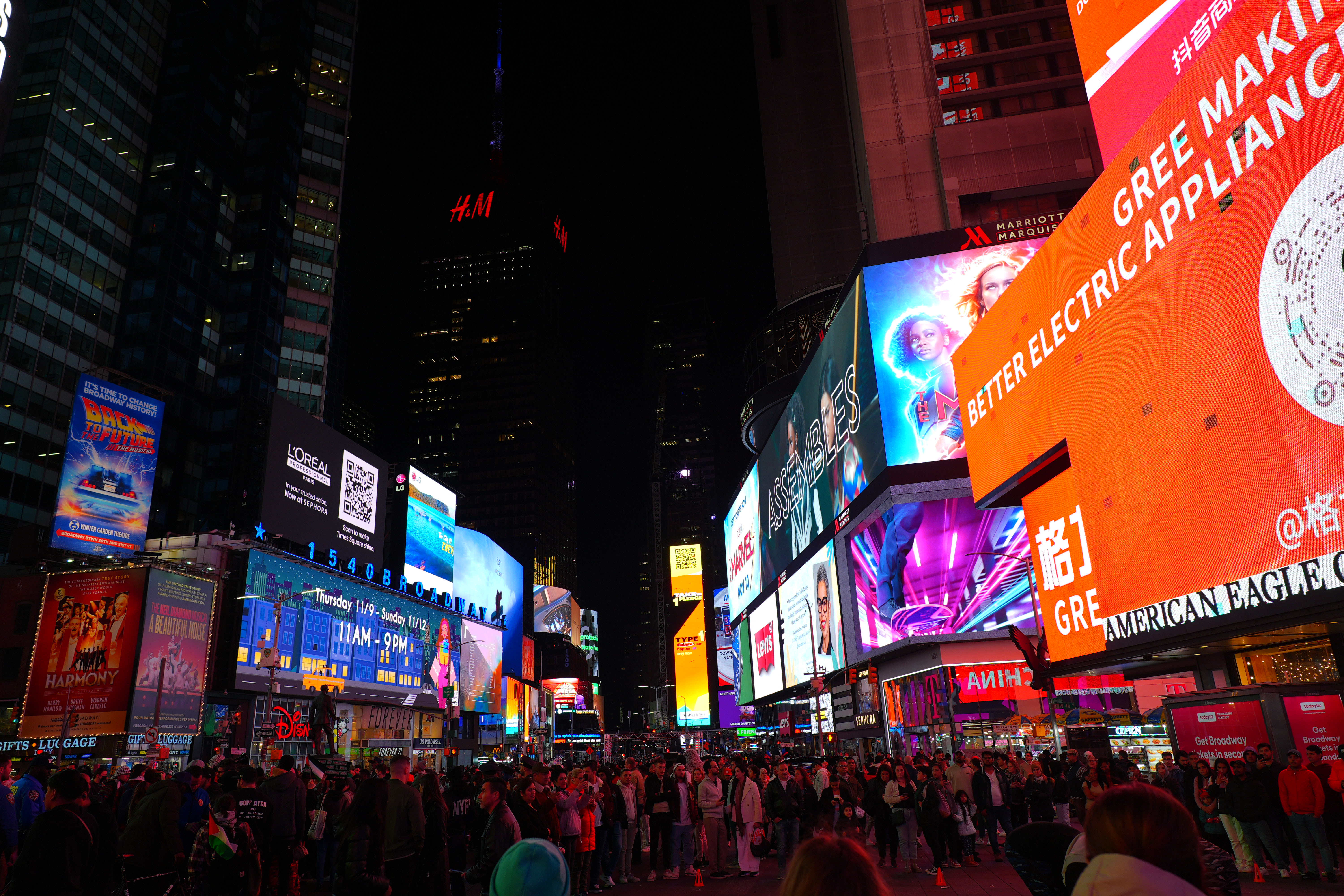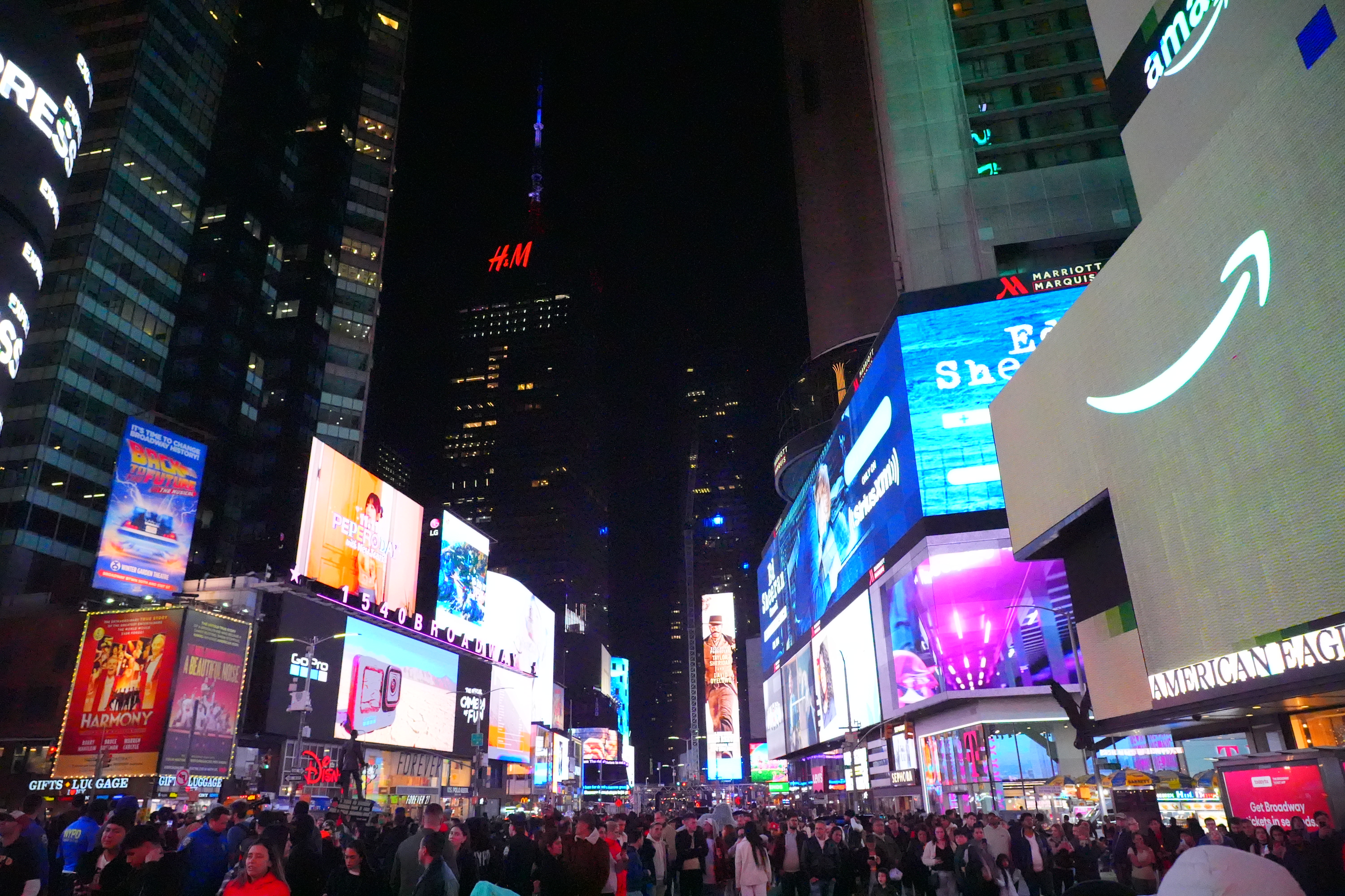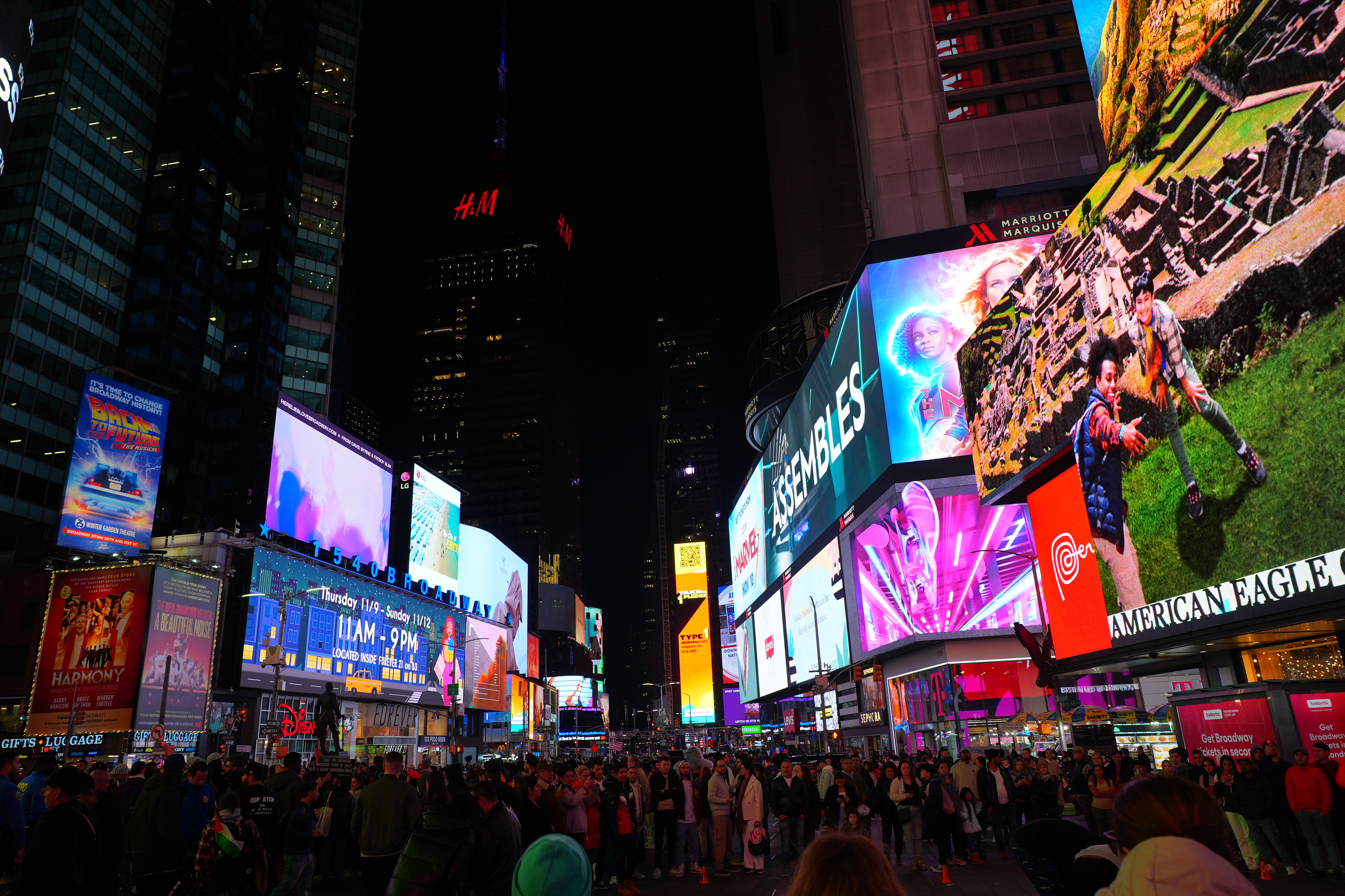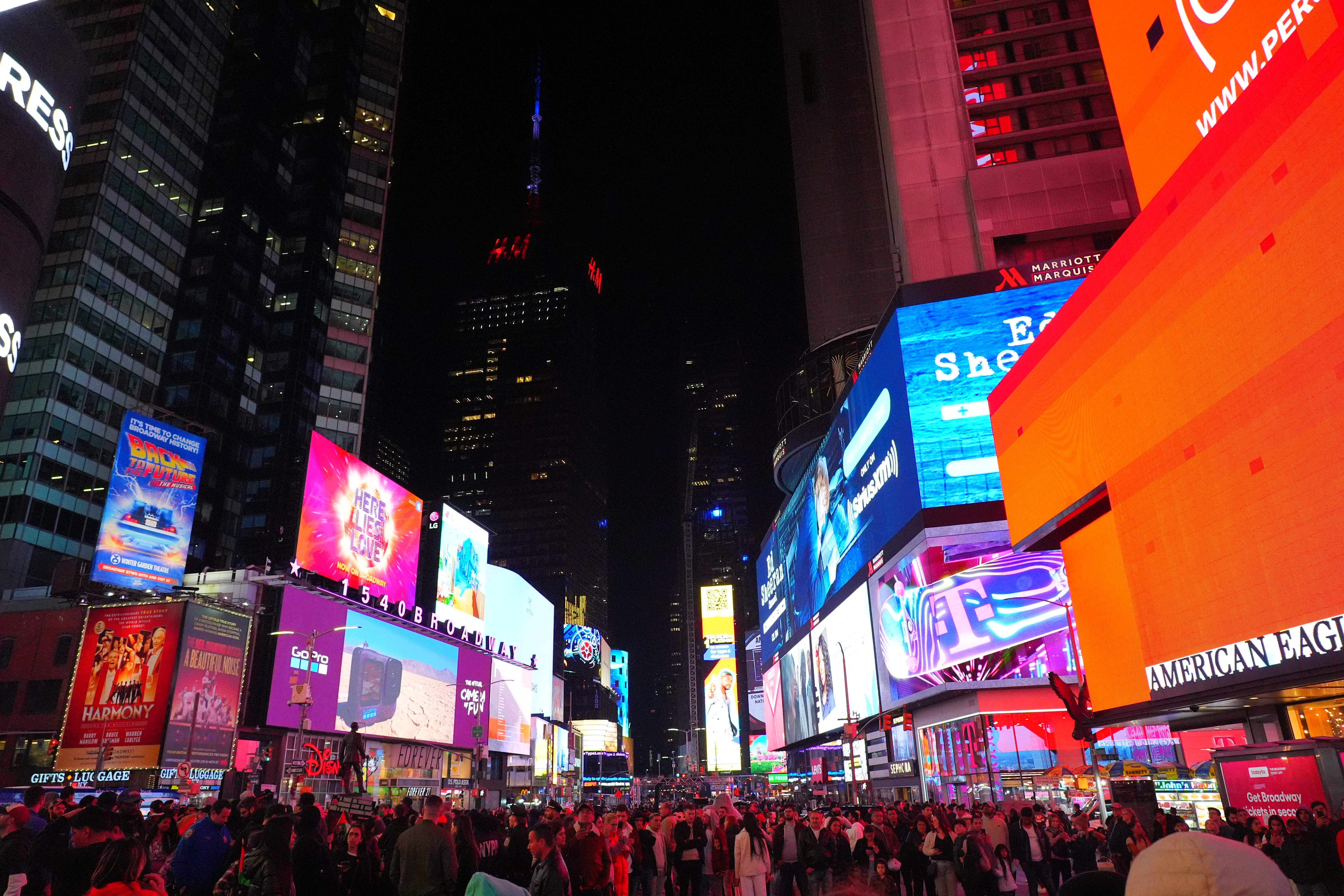 New York's Theater District High ISOs performance topAs seen at normal image sizes below, the A9 III pretty much makes the same images from ISO 125 (L) to ISO 25,600. ISO 51,200 (Hi 1.0) gets a little blotchier or noisy, but it's no big deal unless you're enlarging it, at which point the ISO 51,200 images are softer, noisier and blotchier. While ISO 51,200 (H) doesn't look that great, it doesn't look much different on other models that provide higher ISO settings! In other words, while the A9 III doesn't go any higher than ISO 51,200, it doesn't look any worse than other cameras like the older A9 II or A7 III at ISO 51,200. The other cameras can be set higher, but look worse and worse at higher settings. This suggests that the A9 III simply ran out of the processing power needed to process the greater noise reduction needed for higher ISOs at its insane 120 FPS while it's busy processing focus and exposure and everything else going on. This suggests that more efficient firmware in the future may unlock higher ISOs, and we might see higher ISOs in production models in February 2024. Only time will tell. This is no big deal because higher ISOs are silly. No one needs ISOs above 10,000 unless they're doing something wrong. For instance, all these images below were easy to get hand-held at ISO 125 with an f/4 lens; no one would shoot any of this above ISO 250. Even shooting in pitch black on city streets or well-lit sports indoors, ISO 1,000 is all I need; not even ISO 1,600 or ISO 3,200. Five-digit ISOs and above are mostly for people who spend more time comparing printed specifications than shooting for a living. Even before stabilization I had no problem shooting hand-held under full moonlight at ISO 6,400 with a 28mm f/1.4 lens. High ISOs are mostly a sales feature; if this is all you worry about, look other cameras like even the A7 III for better stupid-high ISO performance. At the ISOs pros need for shooting properly-lit subjects, the A9 III is more than good enough. Don't read too much into these snaps below. They're hand-held with autofocus, and the focus will drift from shot to shot depending on where the AF system felt like focussing. Likewise, half the signs are active LED screens changing colors and images each frame. The A9 III does a great job capturing everything without banding, but each shot is different because everything is changing so fast. Click any for the camera-original © 24 MP JPG LIGHT files (about 5 MB each): Click any for the camera-original © 24 MP JPG LIGHT files (about 5 MB each).