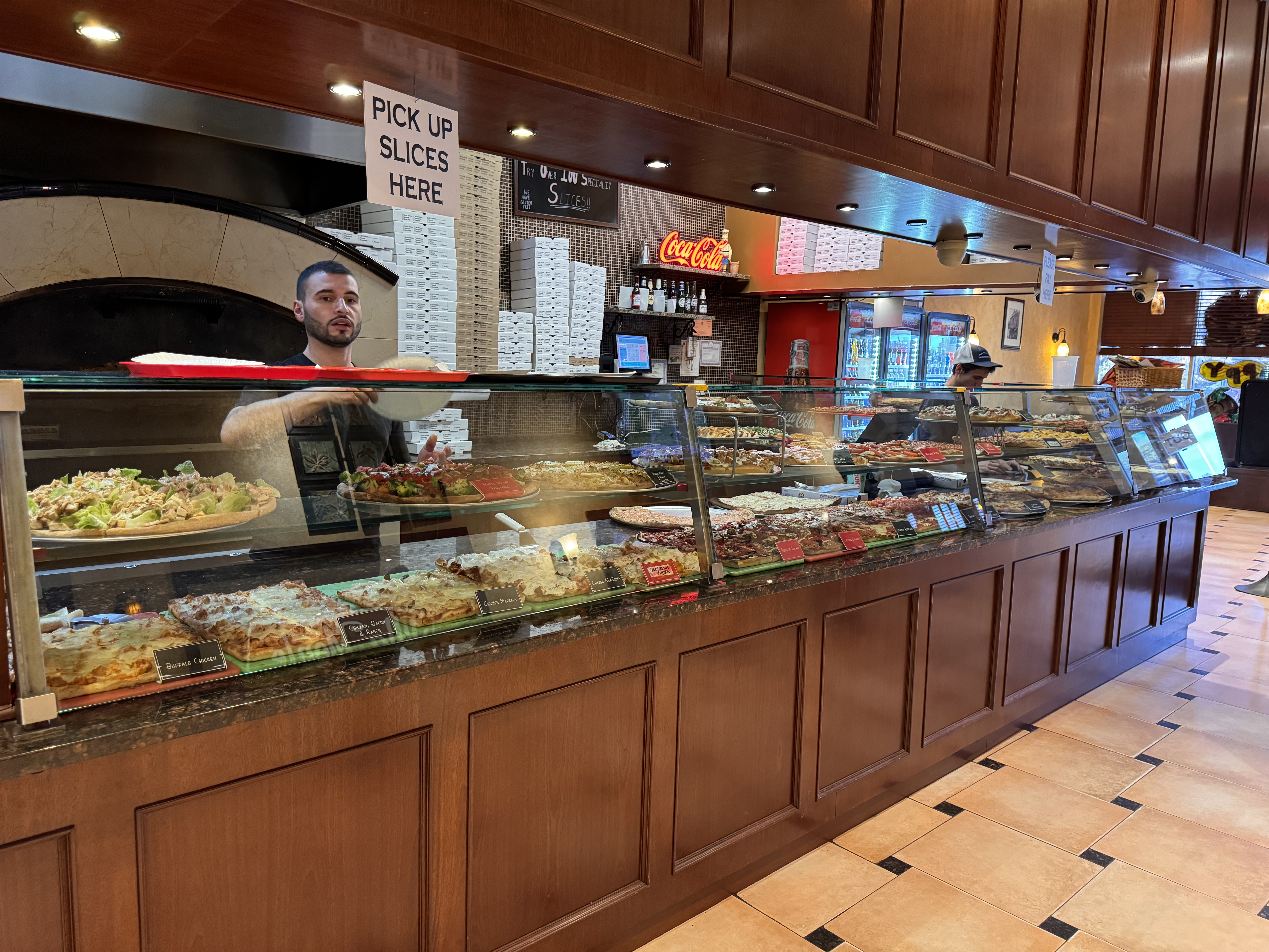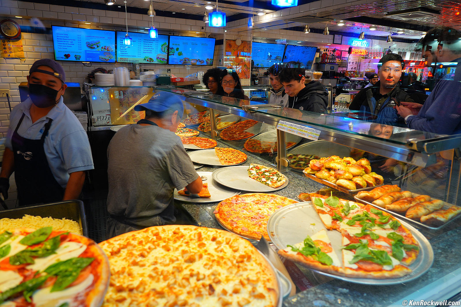 Ho-Hum Pizzeria, 46th Street, Manhattan, 8:53 PM, Tuesday, 07 November 2023. Sony A9 Mk III shot through a window at +9 Saturation, Sony FE 24-105mm f4 G OSS at 24mm at f/4 at 1/40 at Auto ISO 250 (LV 8.0), Perfectly Clear (now sold as Radiant Photo). bigger. Long Island's famous Villa Monte, run by a couple from Napoli (Naples), blows the place above out of the water. Tell them Rockwell sent you. Monte's puts out dozens and dozens of different pies from which you can order slices for lunch, with everything from regular pizza as you see above to Baked Ziti, Chicken Marsala or Veal Parmesan on a slice. Sorry, we fourth-generation native New Yorkers get personal about our favorite pizzerias (Monte photos with my iPhone 15 Pro Max).