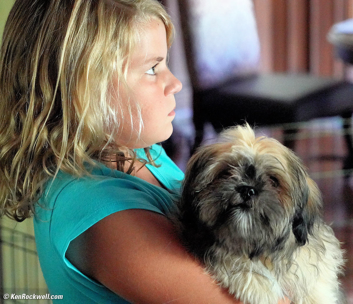 Katie and Zoey, 07 June 2017. Sony A9 with Sony 24-70/2.8 GM at 70mm at f/5 at 1/250 at Auto ISO 100. bigger or full-resolution © file. This looks like a posed shot, but look again: Katie is walking very quickly, and this is but one of a long sequence of shots made as I walked backwards following Katie and the A9 and 24-70/2.8 GM automatically figured out where to focus, and then kept everything in flawless focus as we walked along, and after all that, the stabilizers still gave me a crazy-sharp image, even shot at the lowest resolution setting as I usually do for family photos. Every hair and eyelash and piece of fur is perfect, and every one of my shots is like this — except for the facial expressions. Bravissimo! IntroductionTop Sample Images Intro Lenses & Adapters Specifications Accessories USA Version