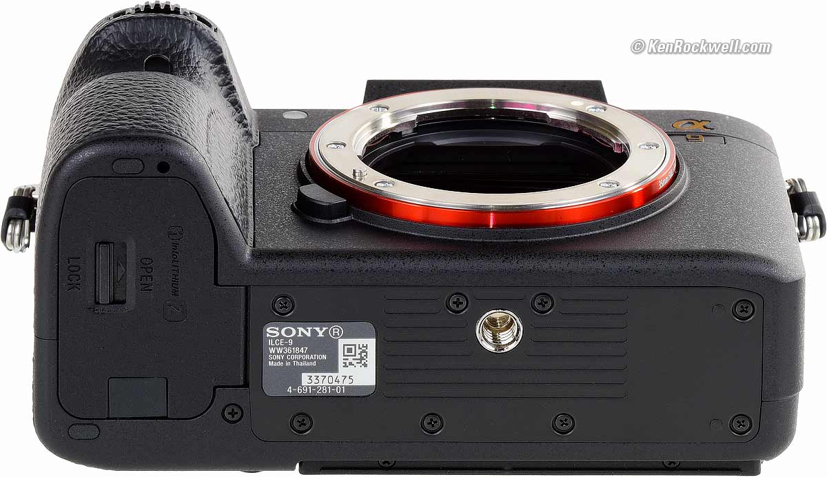 Quality Bottom, Sony A9. bigger. Magnesium alloy top cover, front cover, internal frame and rear cover. The grip area has been reinforced with magnesium alloy. Sony claims weather seals around most of the buttons and dials, but there are no seals on the card and connector covers. Made in Thailand.