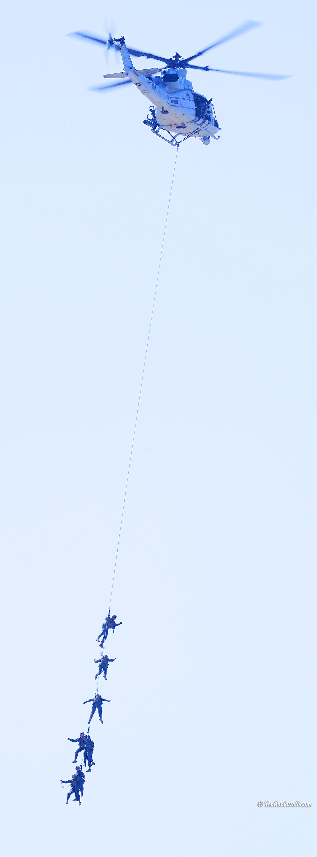 Marines dangling under a helicopter, Miramar Air Show, 28 September 2018. Sony A9, Sony 400/2.8 on Wimberley WH-200, f/2.8 at 1/2,500 at ISO 100. bigger. With a 400mm lens I had to wait until these Marines were about a mile away until I could fit them all in one frame. They were about a thousand feet off the ground.