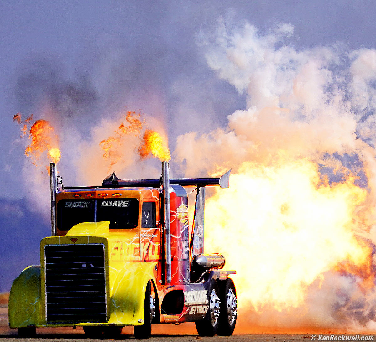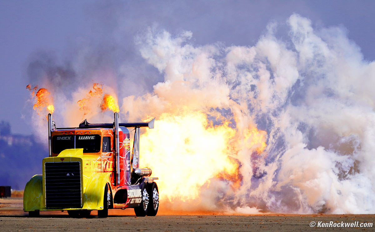 Shockwave Jet Truck, Miramar Air Show, 28 September 2018. Sony A9, Sony 400/2.8 on Wimberley WH-200, f/2.8 at 1/4,000 at ISO 100. bigger or wider. This was a long way away and cropped. You couldn't shoot this on an iPhone because 1.) you'd be so close that you'd get sucked into the jet engine, and 2.) a closer point of view would have made the front of the truck huge and the flame tiny. By getting further away we change the relative rendering so that the truck's grille shrinks and the flames grow huge in the background. How loud is this thing? I'm writing this two days later on Sunday from nine miles away, and I just heard it during today's show!