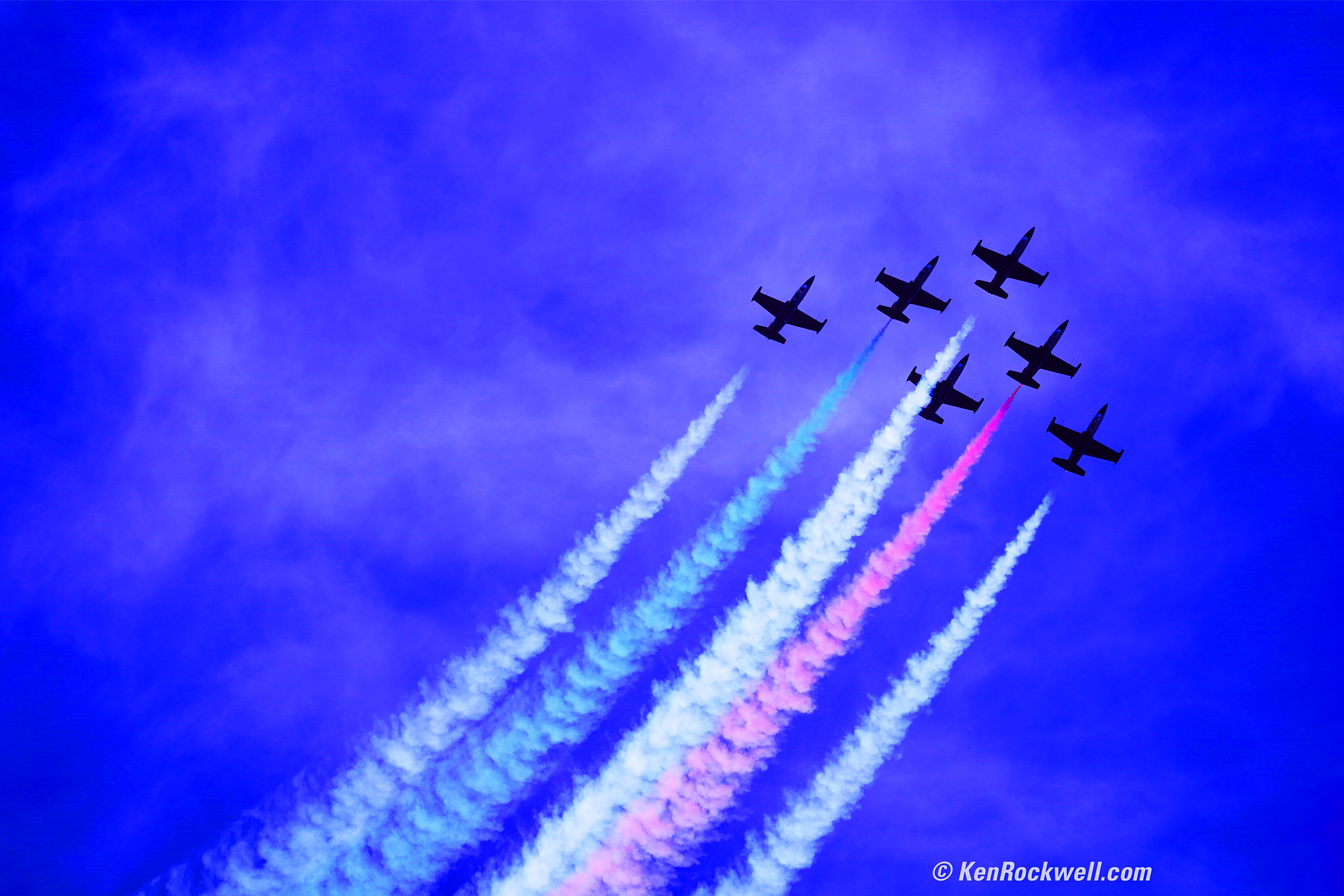 Red, White and Blue Smoke behind Jets, Miramar Air Show, 28 September 2018. Sony A9, Sony 400/2.8 on Wimberley WH-200, f/2.8 at 1/2,500 at ISO 100. bigger or full-resolution. The light was horrible most of this hazy day, and I was almost always shooting into the sun. I flipped this image so they were pointing up; in reality they were flying down.