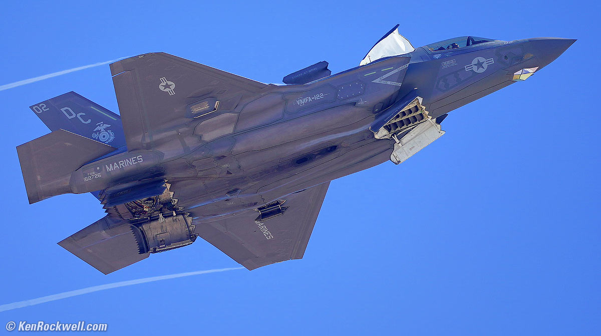 US Marines F-35B, Miramar Air Show, 28 September 2018. Sony A9, Sony 400/2.8 on Wimberley WH-200, f/2.8 at 1/1,600 at ISO 100. bigger.