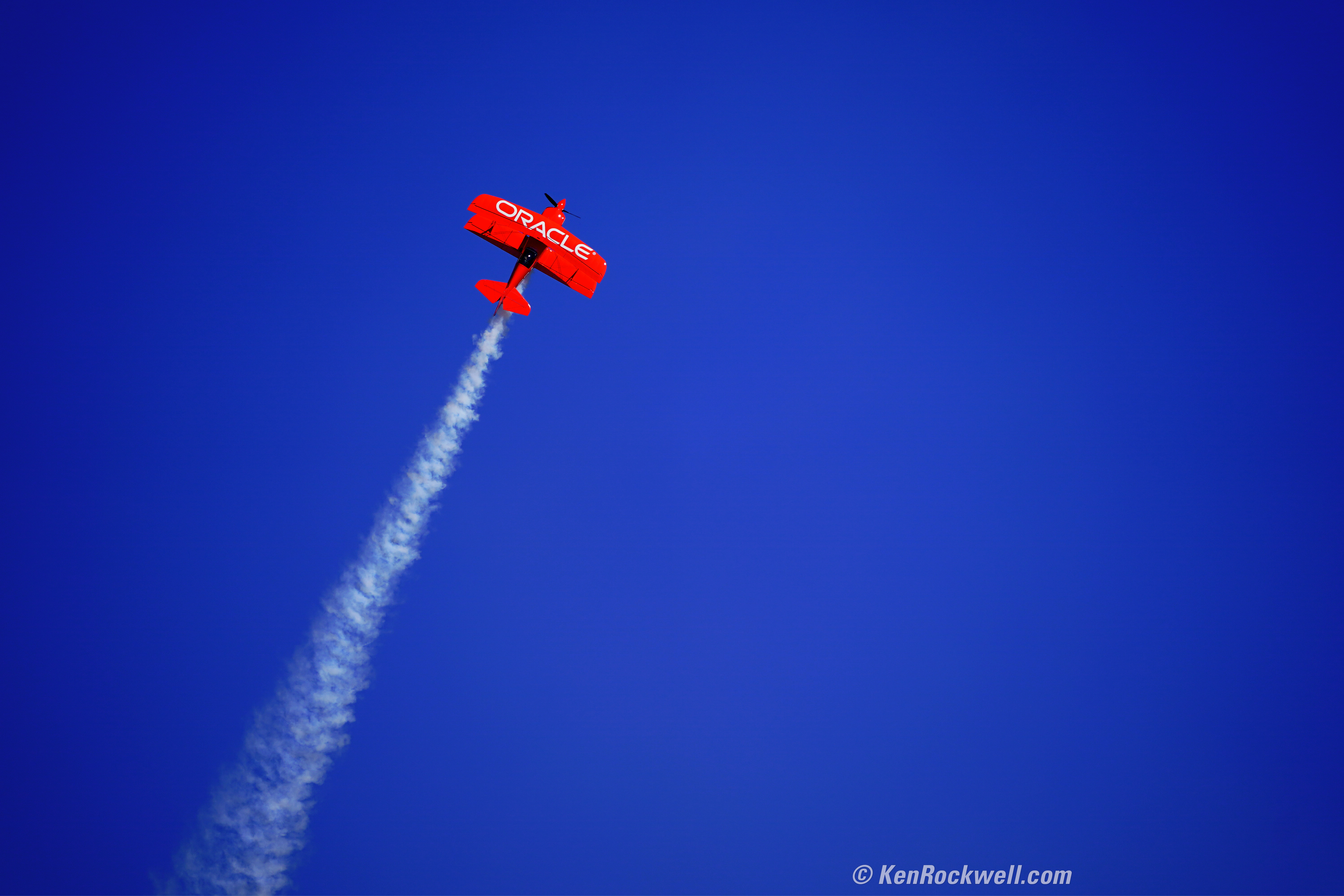 Sample Images(more at High ISOs) Top Sample Images Intro Lenses & Adapters Specifications Accessories USA Version All shot as Standard JPGs; no RAW or FINE JPGs were used or needed. Red Biplane against Blue Sky with Smoke Trail, Miramar Air Show, 28 September 2018. Sony A9, Sony 400/2.8 on Wimberley WH-200, f/2.8 at 1/4,000 at ISO 100. bigger or full-resolution. This guy was about a mile away! This Sony A9, Sony 400/2.8 and Wimberley WH-200 system is so sharp there's no problem cropping as needed at this distance.