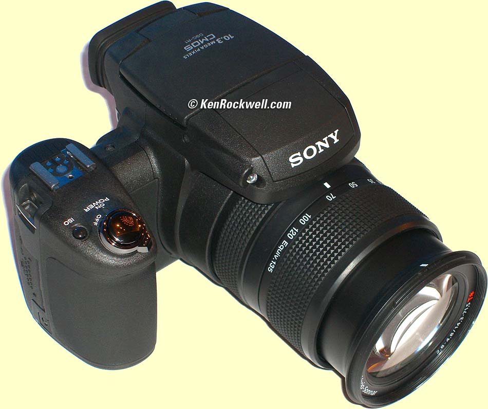 Sony's DSC-R1 is a breakthrough in EVF point-and-shoot cameras because it has a full-sized sensor. By full-sized sensor I mean 21.5 x 14.4 mm, which is full size for digital SLR cameras. It's not as big as the old 35 mm film aperture was. More here on sensor sizes. Canon has a great explanation of why a bigger sensor leads to better images here. Personally I prefer real SLR cameras like the Nikon D50 as I explain at the end, but for people who love EVF cameras this is the one. For the first time you can get real DSLR image quality at full ISO in a fixed lens camera. More about these two classes of cameras here. As an EVF P/S, as opposed to a true DSLR, it's probably not suited for fast action or fast kids. It is very well suited to landscapes and anything that holds reasonably still. Not having a reflex mirror allows lens designers the freedom to place the rear of the lens close to the sensor if they choose. The DSC-R1's lens gets as close as 2 mm to the sensor. Having no flipping mirror it's quieter than an SLR. The full-sized sensor gives the DSC-R1 great sensitivity, depth-of-field control and low noise. The 10 MP spec isn't that significant as you can read at the Megapixel Myth. Few people understand why the big sensor is a big deal. Pixels on a sensor collect photons like buckets collect rain while sitting in a rainstorm. The bigger the bucket, the more rain or photons you collect. When you have a big sensor with big pixels collecting more photons you get much more sensitivity to light. This increased sensitivity gives you higher ISO speeds and lower noise. Higher ISO speeds lead to much sharper photos because you can use faster shutter speeds to eliminate motion and hand-held blur. The DSC-R1 is 5 to 8 times as sensitive as other EVF cameras. The ISO range of the DSC-R1 is 160 - 3,200 and the range of other fixed lens cameras is only 50 - 400. Other fixed-lens cameras that claim higher ISOs deliberately blur the image to blur the effect of noise at ISOs like 800 and 1,600. I see none of that with the prototype DSC-R1; all it's images were sharp even at ISO 3,200! You get less noise because the camera doesn't need to amplify the signal as much as cameras do with the typical tiny sensors. Noise is constant and caused by the random motion of electrons. Greater signal and sensitivity means you see much less of that noise due to the lower levels of amplification required inside the camera. Sony makes a big to-do about the DSC-R1 having "Full-Time Live Preview," exactly like every other point-and-shoot digital camera and unlike a true DSLR. Personally I prefer a real DSLR with a real ground-glass finder over the grainy, jerky image on the DSC-R1's peephole LCD, however for $999 complete with a great lens and stellar image quality the DSC-R1 ought to be the first choice for people in the market for this kind of camera. Unlike a true DSLR the Sony DSC-R1 has a rotating top LCD for live composition regardless of camera position. You can photograph from angles impossible with a true SLR and still see what you're doing.