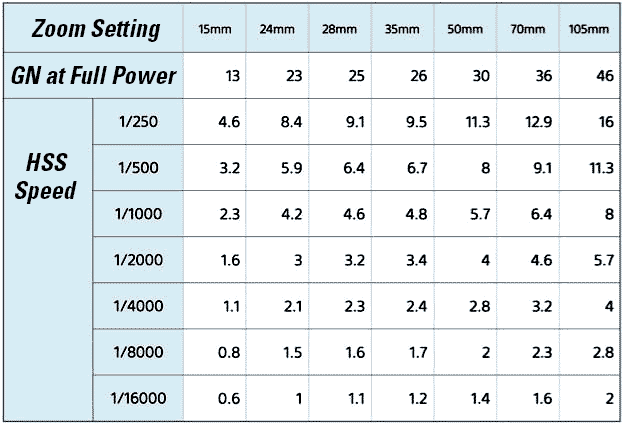 Power specifications topRated Guide Numbers (in meters) at ISO 100.