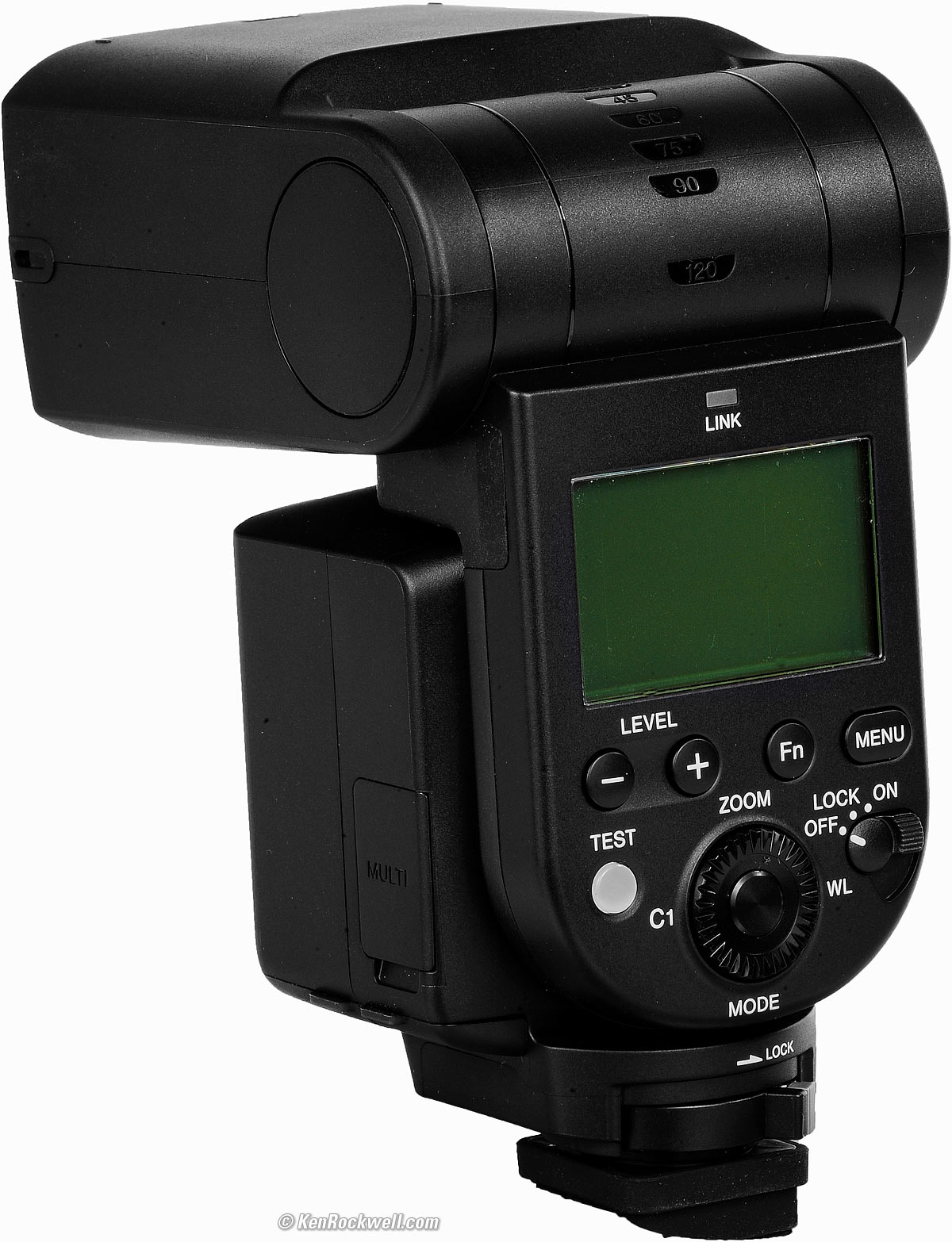 Pivoting Head specifications topSony HVL-F60RM2. bigger. The head moves -8º to +150º (points backwards 60º) relative to the body. The whole body, with head, moves ±90º left or right. As shown above, the body is rotated 45º right and the head is flipped up 150º. This thing looks as crazy as it is. It is designed for vertical shooting, in which case half the flash rotates 90º left or right to remain vertical as you rotate your camera. Rotate the camera as you hold the flash in the same vertical position and you still have the whole -8º to +150º vertical range, a Godsend for people wanting to use bounce flash with vertical shots. That's the good news. The bad news is that the head does not move left or right relative to the control panel, so you can't swing the head left or right easily for horizontal shots. To do that we have to flip the whole thing 90º left or right and then rotate it left or right — but without any vertical bounce ability at the same time. It works OK horizontally and great vertically, but it takes some getting used to horizontally. You can point it in any direction; you just get there differently.