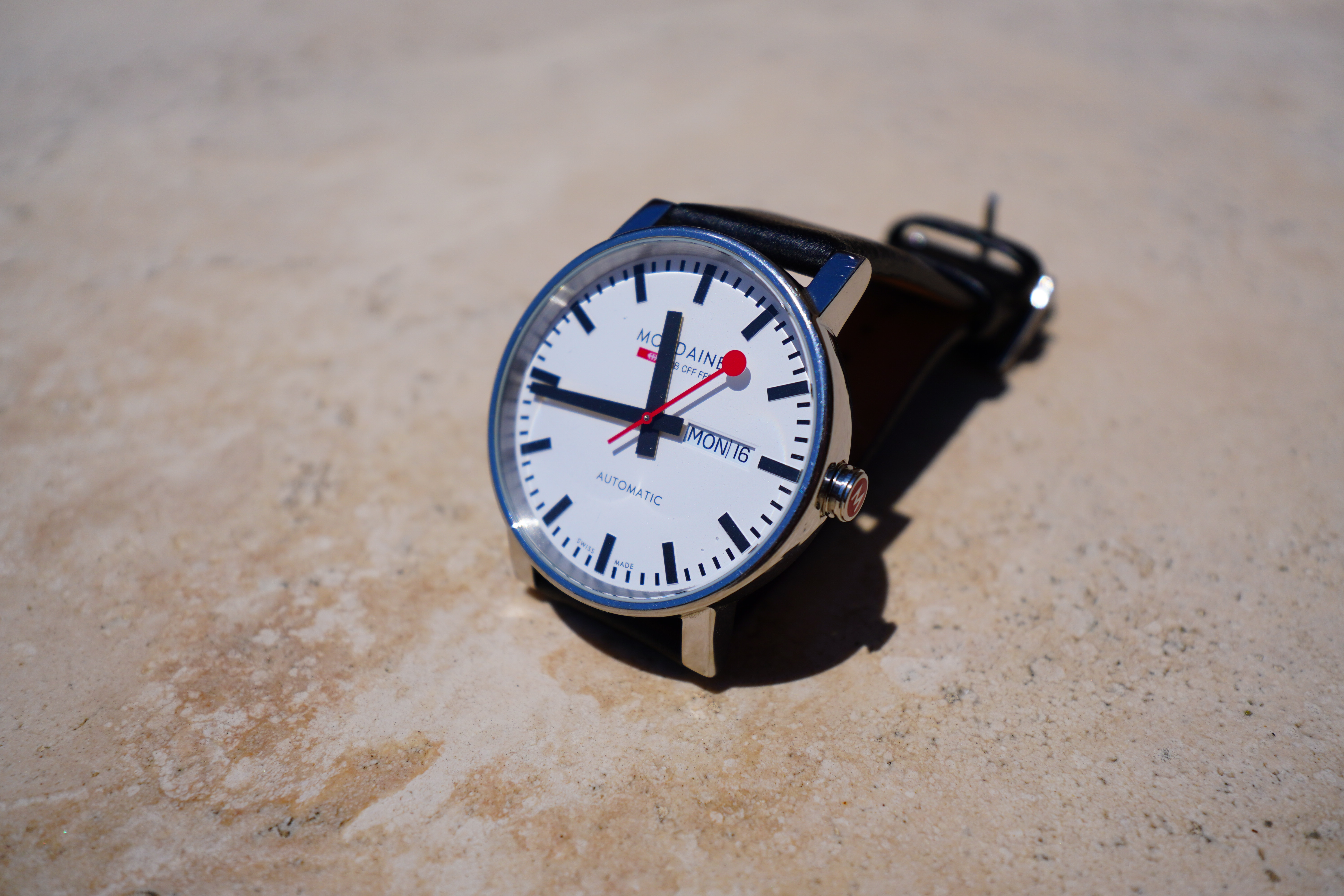Spherochromatism performance topSpherochromatism, also called secondary spherical chromatic aberration or "color bokeh," is an advanced form of spherical and chromatic aberration in a different dimension than lateral chromatic aberration. It happens mostly in fast normal and tele lenses when spherical aberration at the ends of the color spectrum are corrected differently than in the middle of the spectrum. Spherochromatism can cause colored fringes on out-of-focus highlights, usually seen as green fringes on backgrounds and magenta fringes on foregrounds. Spherochromatism is common in fast lenses of moderate focal length when shooting contrasty items at full aperture. It goes away as stopped down. It has just a little spherochromatism, with out-of-focus backgrounds having slight blue fringes and out-of-focus foregrounds having sight amber fringes wide-open at f/4: Mondaine A132.30348.11SBB at close-focus distance at 20mm at f/4, 16 May 2022. Sony ZV-E10 with OWC Atlas Pro 256GB SDXC V90 card, Sony E 10-20mm f/4G PZ wide-open at f/4 at 1/4,000 at Auto ISO 100 (LV 16.0). bigger or camera-original © file.