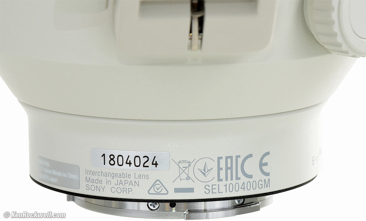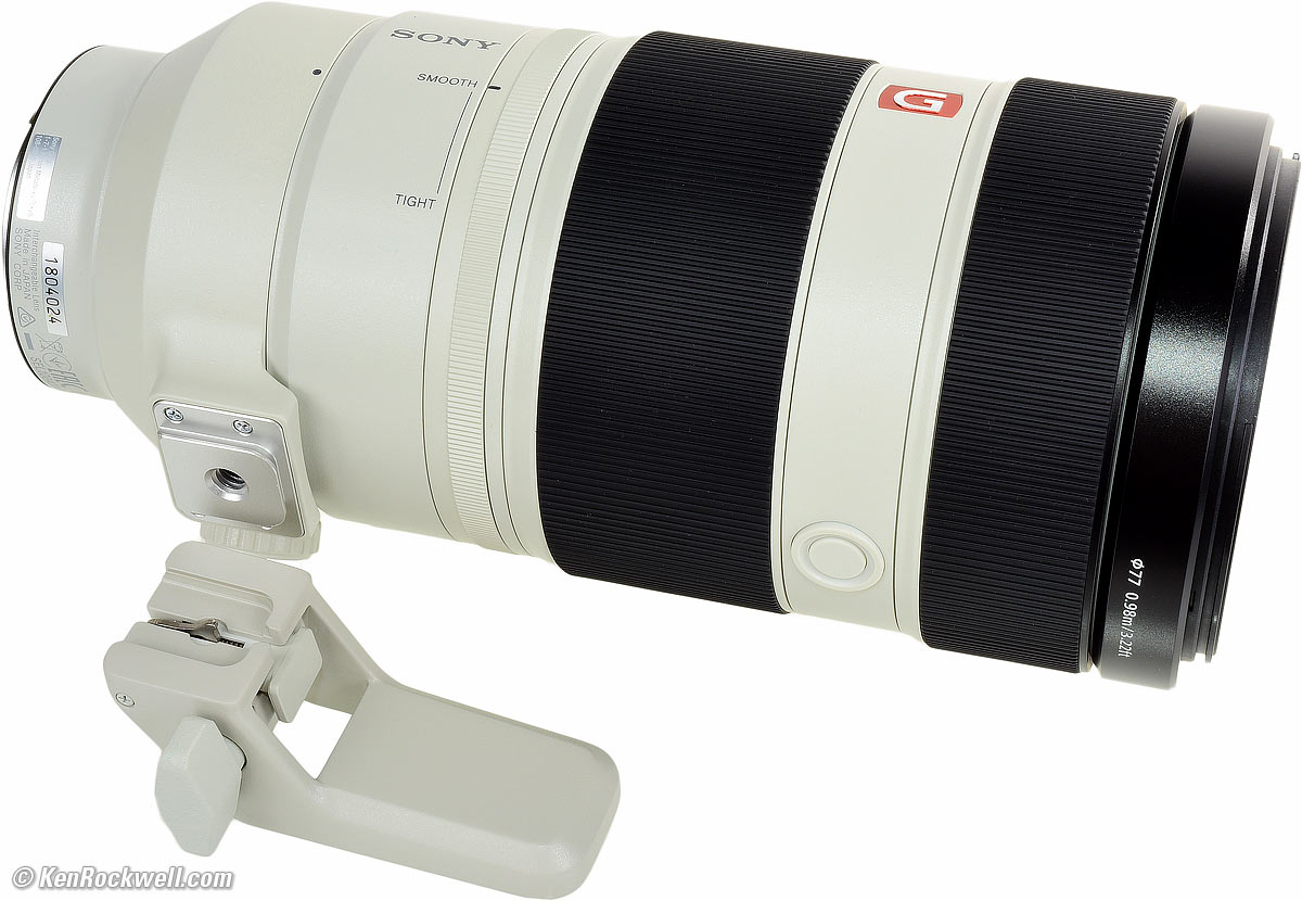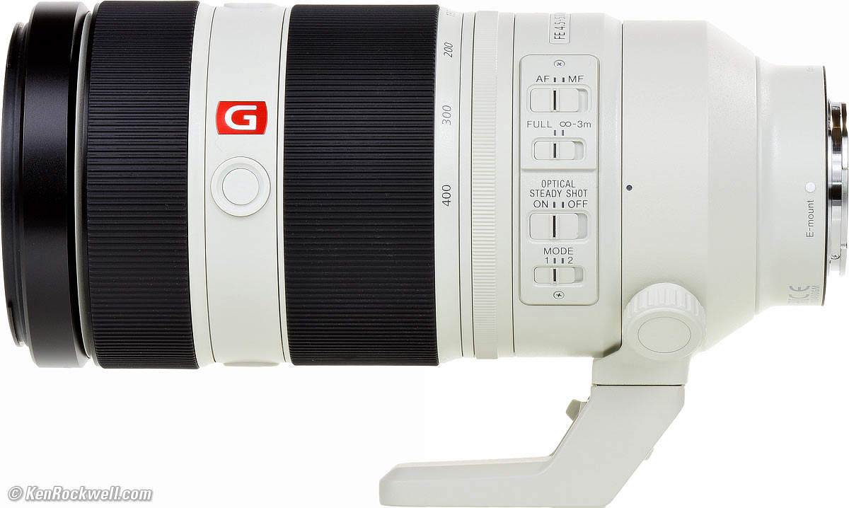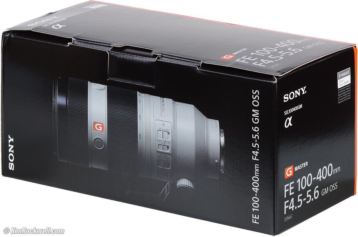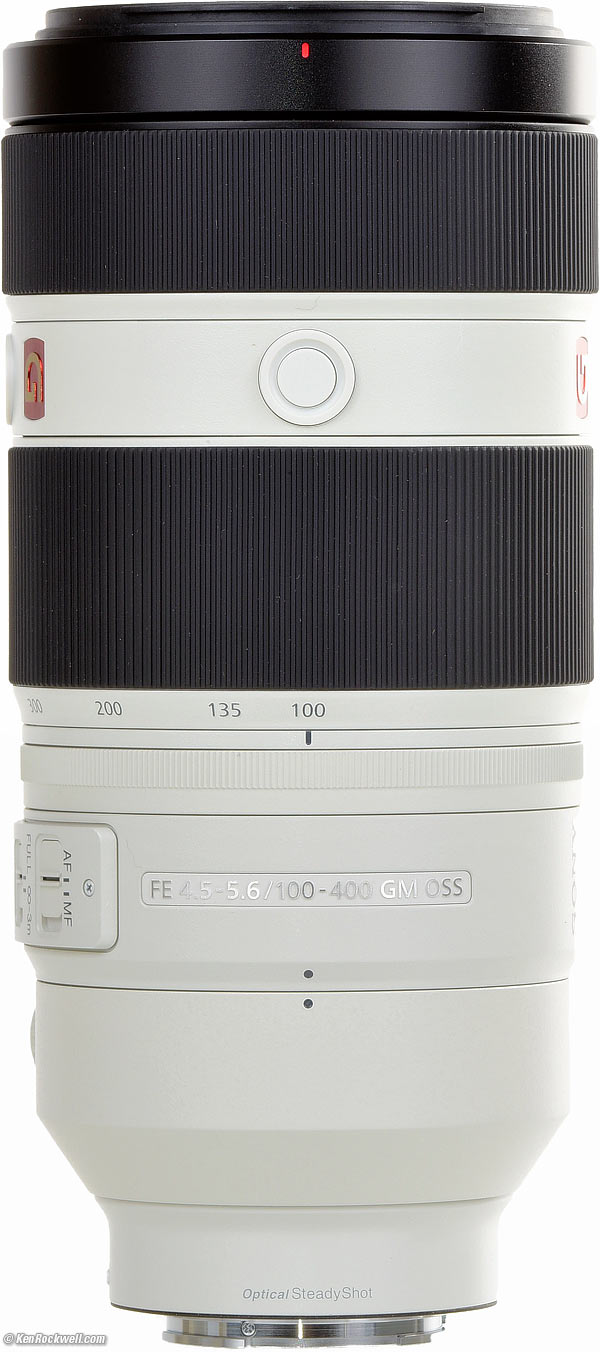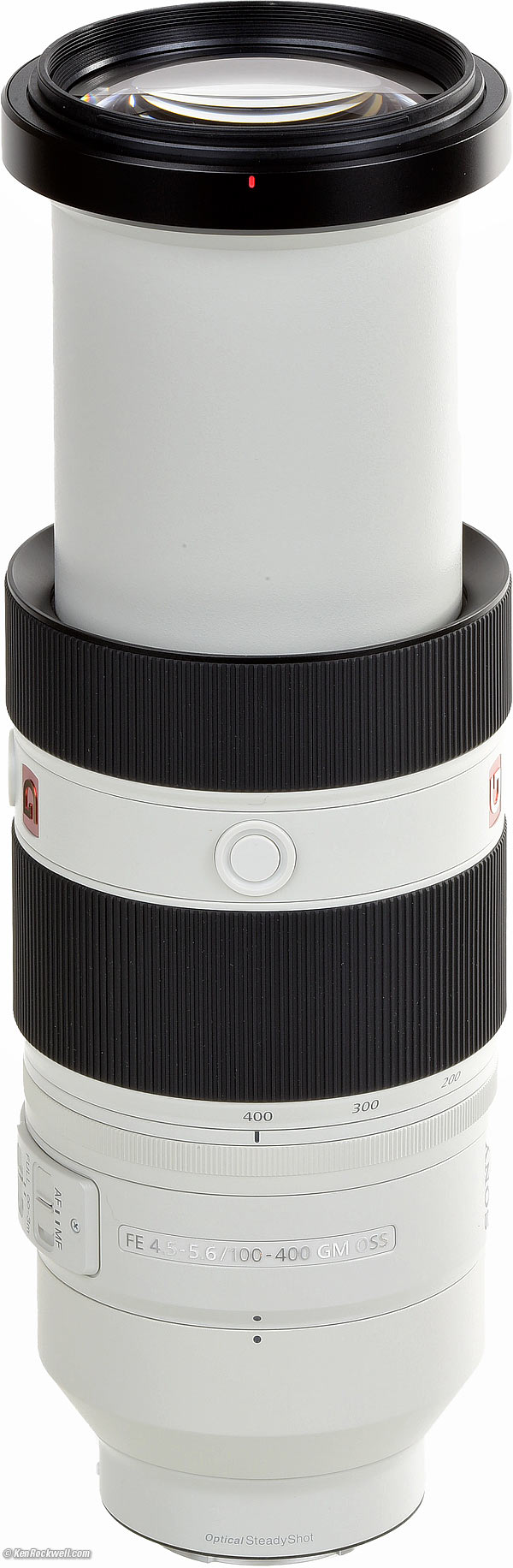 Sony 100-400mmSony's Best Ultra-Telephoto ZoomFull-Frame E-Mount FE GM OSS (2017-)Sample Images Intro Format Compatibility Specs Accessories Performance Compared Sony: A9 III A1 II A1 A9 II A7R V A7R IV A7 V A7 IV A7 III A7S III A7CR A7C II A7c FX3 FX2 ZV-E1 A6700 A6600 A6400 ZV-E10 II ZV-E10 ZV-1 II RX1R III RX10/4 RX100/7 Flash Lenses Sony FE 100-400mm f/4.5-5.6 GM OSS (77mm filters, 51.8 oz./1,470g with foot as shown; 49.1 oz./1,393g without foot, 3.2'/1m close focus, about $2,498) bigger. I got mine at B&H. I'd also get it at Adorama, at Amazon or at Crutchfield. This all-content, junk-free website's biggest source of support is when you use those or any of these links to my personally-approved sources when you get anything, regardless of the country in which you live. Sony does not seal its boxes in any way, so never buy at retail or any other source not on my personally approved list since you'll have no way of knowing if you're missing accessories, getting a defective, damaged, returned, store demo or used lens. Buy only from the approved sources I use myself for the best prices, service, return policies and selection. Thanks for helping me help you! Ken.