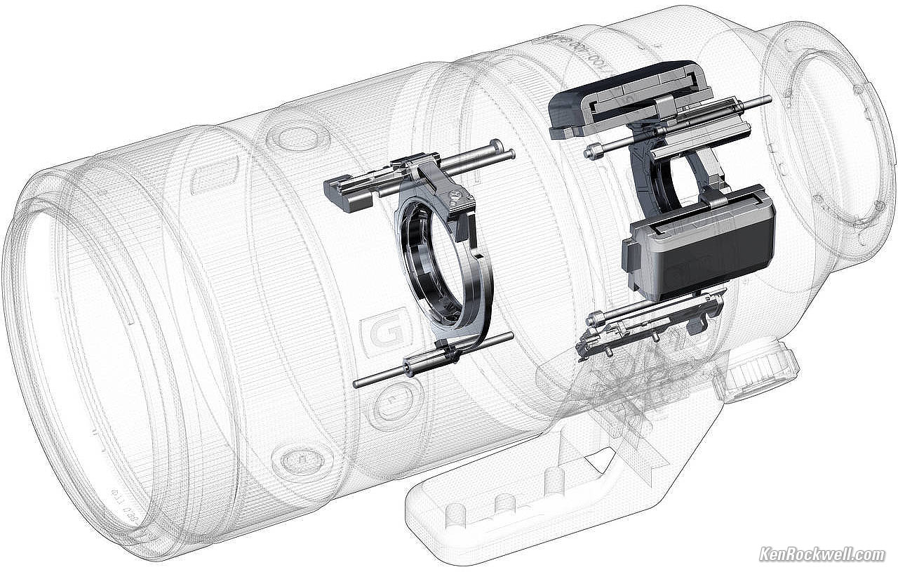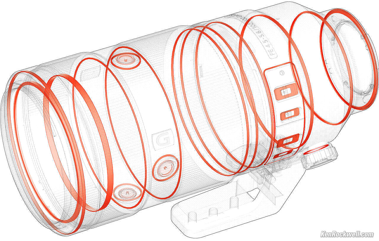 OpticsSony 100-400mm construction. Super ED and ED elements. bigger. 22 elements in 16 groups. 2 ED extra-low dispersion elements and 1 "Super ED" extra-low dispersion element. "Nano" anti reflection coating. Fluorine front coating to resist dirt and fingerprints. Focus is internal. Pumper zoom; the front extends a lot when zoomed longer.