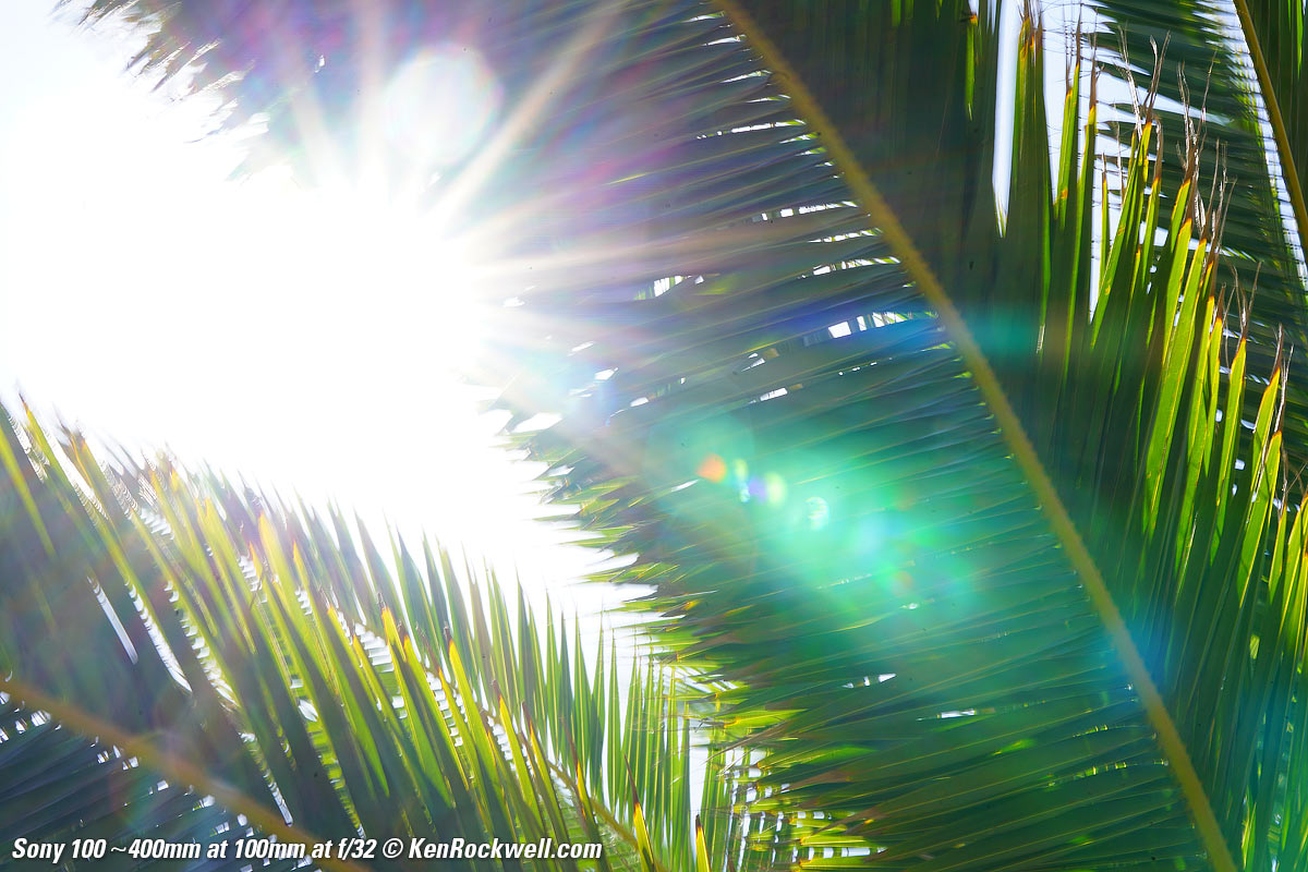 SunstarsEven with rounded diaphragm blades, this 100-400 makes some pretty good sunstars on brilliant points of light if you stop it way down. Sun in Palm, August 2017. Sony A9, Sony 100-400mm f/4.5-5.6 GM at 100mm at f/25 at Auto ISO 100. bigger.