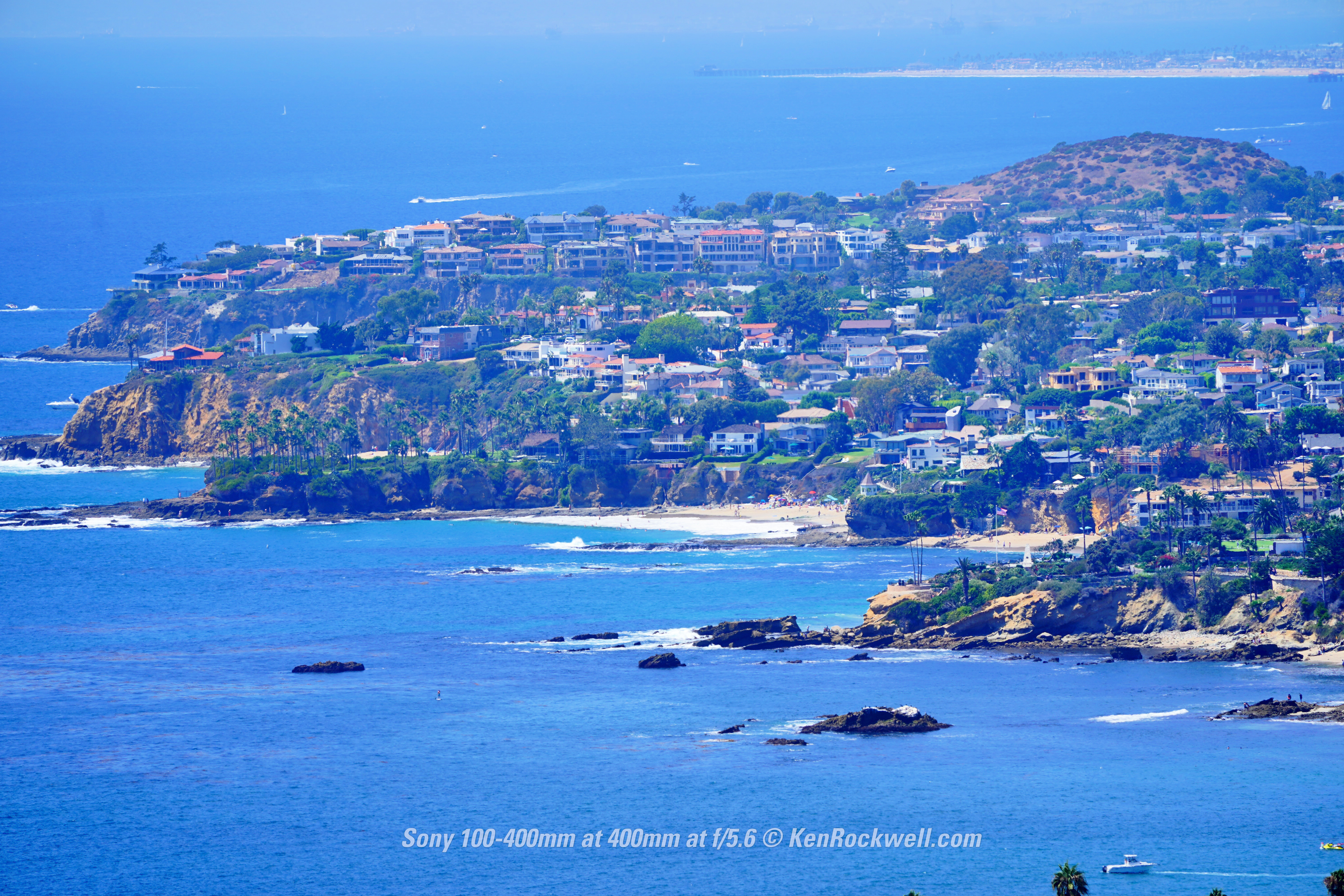 Ultra-sharp edge-to-edge wide-open at 100mm: Coastline Looking North from Laguna Beach, 20 August 2017. Sony A9, Sony 100-400mm f/4.5-5.6 GM at 100mm wide-open at f/4.5 at 1/500 at Auto ISO 100, Perfectly Clear. bigger or camera-original © file.