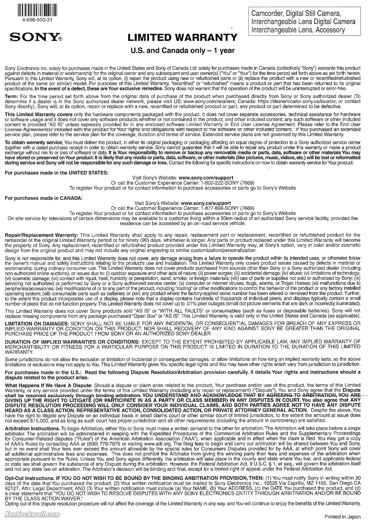 In the USA, along with whatever else is in your box, be sure you get a folded USA Warranty slip like this that says "U.S. and Canada only" and has the (800) 222-SONY phone number: Sony USA Warranty. bigger. If not, you got ripped off with a gray market version from another country. This is why I never buy anyplace other than from my personally approved sources. You just can't take the chance of buying elsewhere, especially at any retail store, because non-USA versions have no warranty in the USA. If a gray market version saves you $800 it may be worth it, but for $300 or less I wouldn't risk having no warranty or support. Always be sure to check your paperwork while you can still return it, or just don't buy from unapproved sources or at retail so you'll be able to have your lens serviced as needed. US versions like mine may also include manuals in extra languages and extra foreign warranty cards; so long as you have an English manual and a USA warranty slip, you're good. Just to keep things interesting, you'll notice that this lens now has a much larger and longer warranty sheet than before, no longer just a card, because this warranty has many more exclusions and limitations than ever before. It specifically adds, about halfway down, that even if you have all this paperwork, if you didn't get your lens from an approved (by Sony) dealer, then the warranty doesn't apply. You'll need some sort of proof of purchase, like your receipt from an approved dealer. Get yours from the same places I do and you won't have a problem, but if you take the risk of getting yours elsewhere, be sure to check everything while you still can return it.