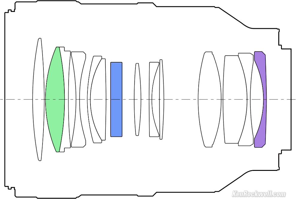 OpticsSony 100 2.8 STF internal construction. Aspherical and ED elements. The blue flat is the dark-edged "apodization" filter. bigger. 13 elements in 10 groups. One ED extra-low dispersion element to help reduce secondary axial chromatic aberration. 1 aspherical element. Mutlicoated. Nano coated.