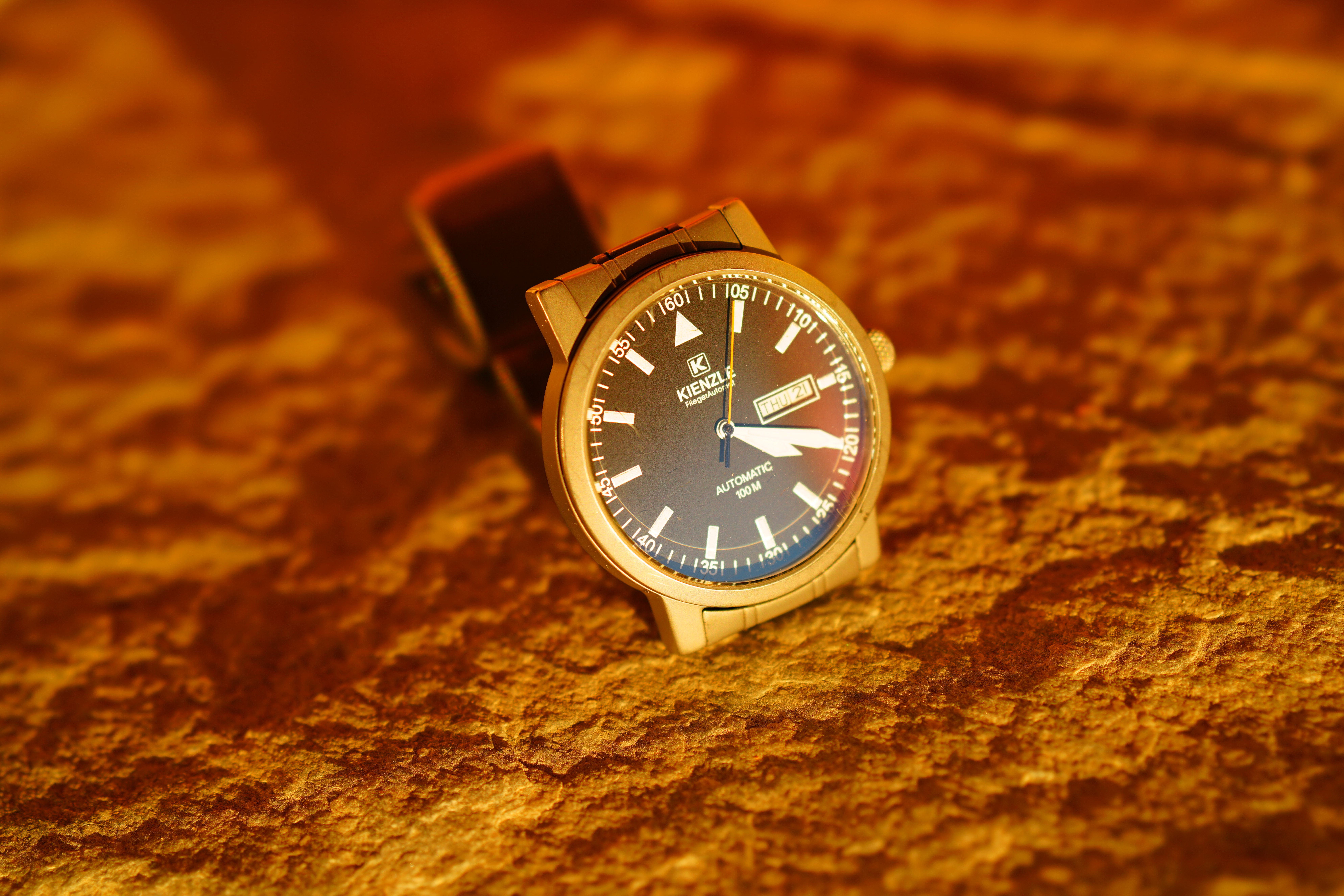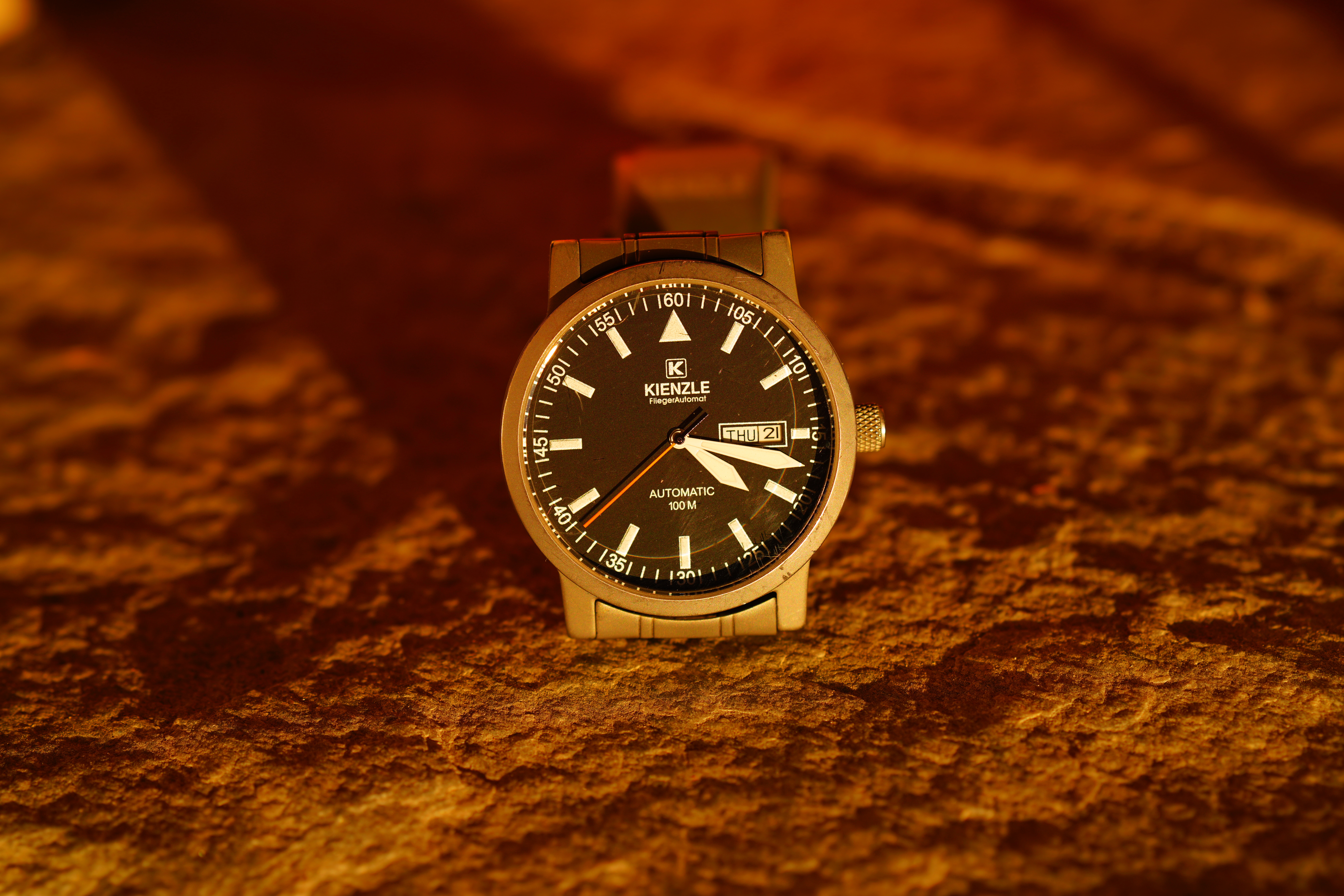 MacroIt gets reasonably close; much closer than typical 85mm to 105mm portrait lenses do. Anything not in perfect focus may have color fringes due to spherochromatism; this is normal and goes away when in perfect focus. Kienzle Flieger Automat 800/2843 in last light, 4:18 PM, 21 December 2017. Full-frame Sony A7R III,at f/6.3 at 1/125 at close focus distance at Auto ISO 100. bigger or camera-original © file to explore on your computer (mobile devices rarely display full resolution images properly).