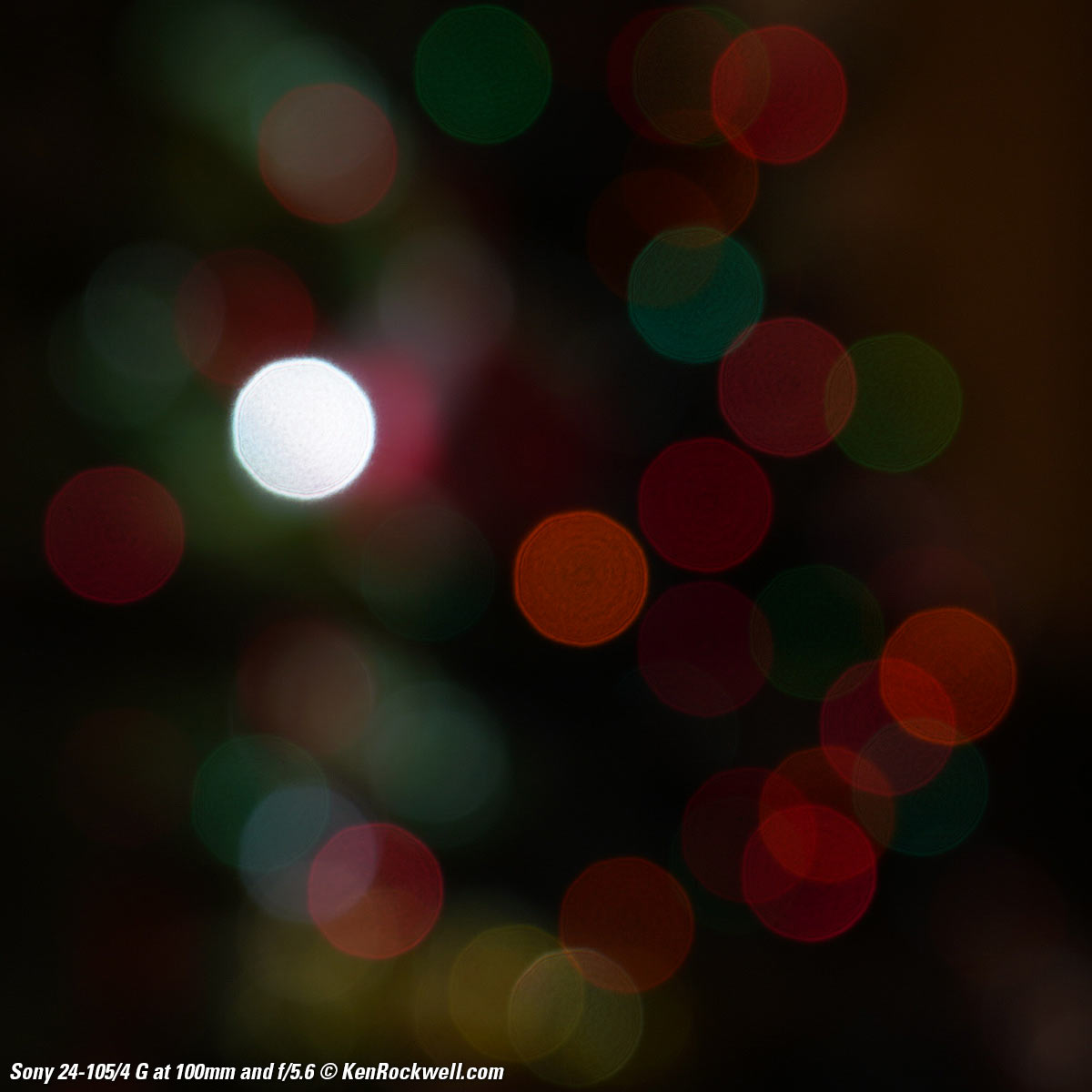 This Sony FE 100mm STF "Smooth Trans Focus" is a special lens designed for the smoothest possible out-of-focus backgrounds. This lens is ultra-sharp when in focus, and renders out-of-focus backgrounds more softly than regular lenses. It has a special permanently-installed "apodization" filter near the diaphragm. In spite of the fancy name it's simply a clear filter that gets progressively darker towards its edges. What this filter does at maximum aperture is turn out-of-focus points of light into soft-edged blobs instead of hard-edged circular discs as most lenses do. In other words, all lenses tend to render out-of-focus points of light as the same shape as the diaphragm, but if you add a special filter inside the lens to darken those edges, then the out-of-focus discs have darker edges than the centers, which turns the circular discs of regular lenses into softer blobs. This is easier to show than describe. Here are two defocused shots of points of light. The lights are at 2m (6 feet) and each lens was focussed at 0.6m (2 feet): Shot with conventional 24-105mm lens at 100mm. bigger.