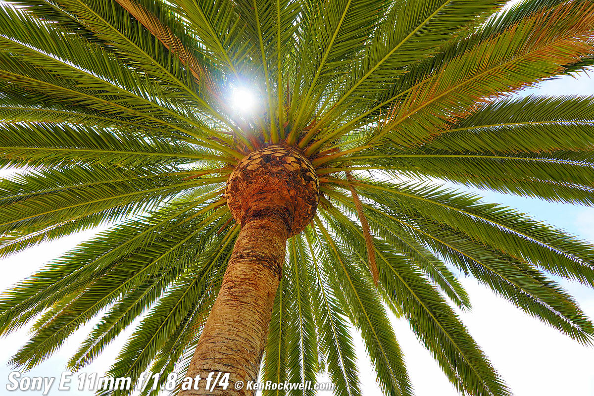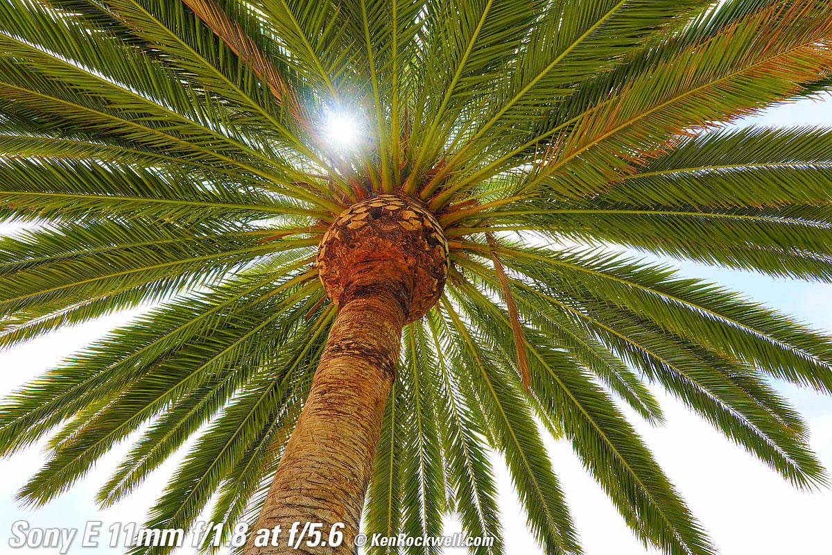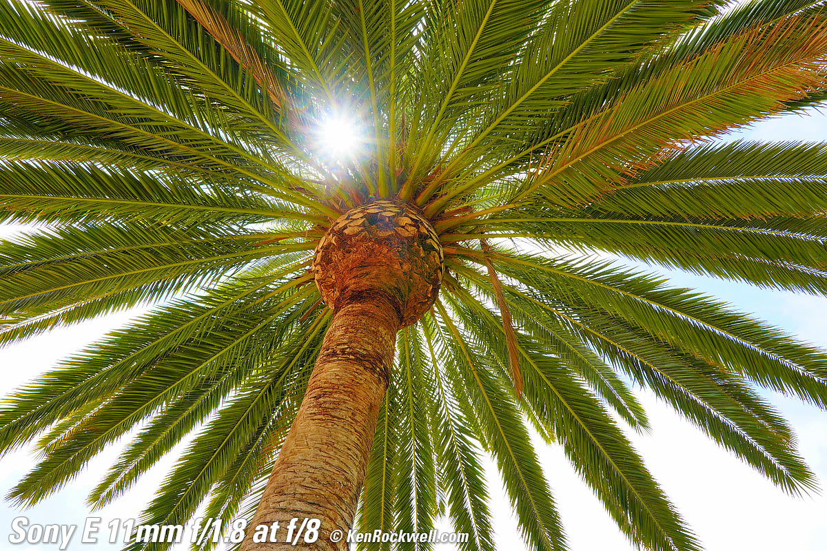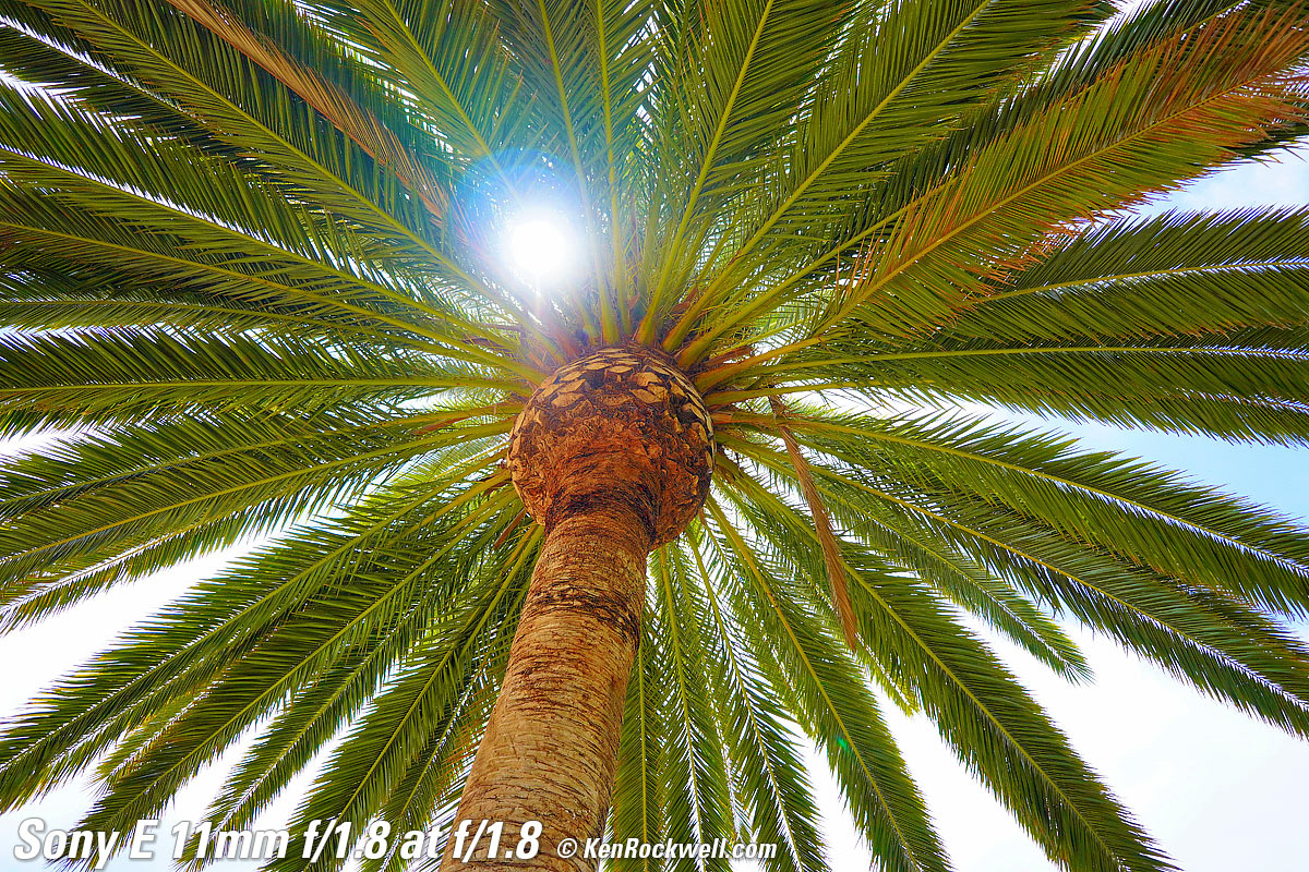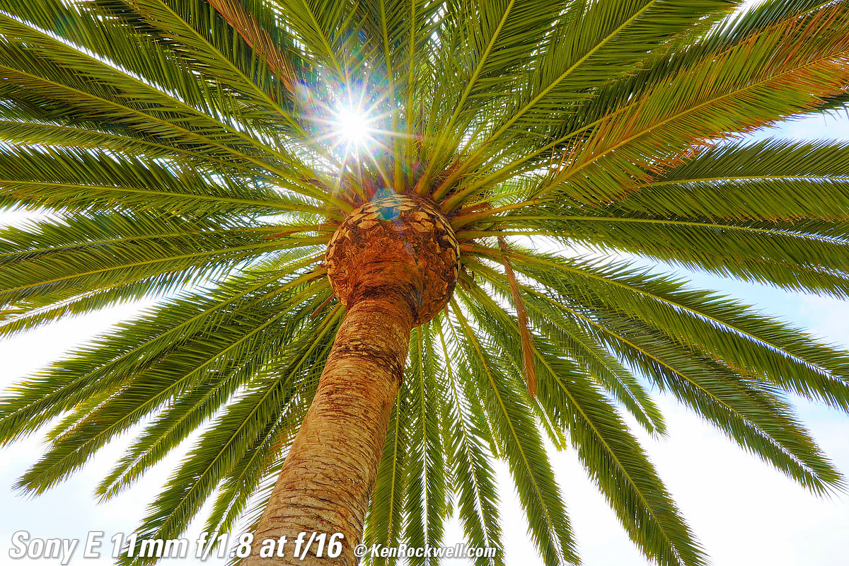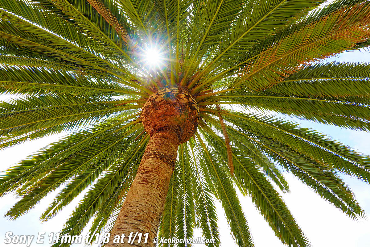 Sunstars performance topWith a 7-bladed rounded diaphragm, I get very good 14-pointed sunstars on brilliant points of light at the small apertures. Ignore the vertical smear at large apertures, this is a sensor artifact called interline transfer smear and not a lens defect. Ignore the crazy rainbow dots at small apertures; these are sensor artifacts caused by taking a picture directly of the sun and exposing for the dark underside of a huge palm tree, and using that same palm tree to hide the sky to accentuate the stars. Click any to enlarge: Click any to enlarge.