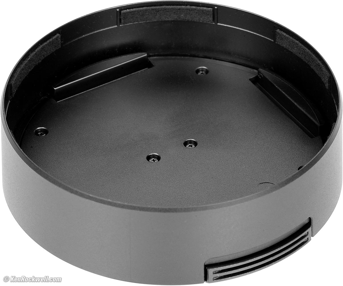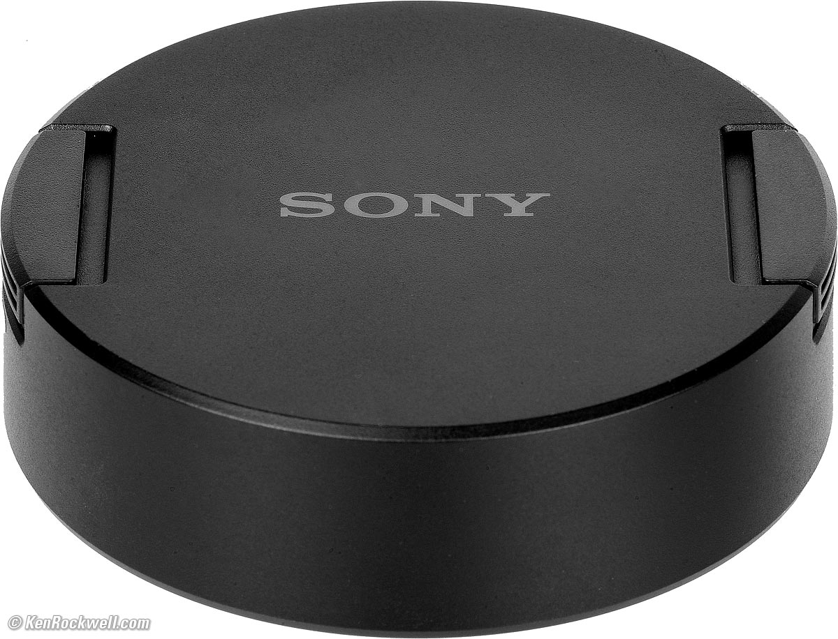 Other than being huge and having no ability to use front filters to protect the glass of your $3,000 lens, everything is mostly where you want it, except that Sony put their ( G ) vanity logo where the AF/MF slide switch is supposed to be, so you have to do gymnastics to reach down a couple of inches to reach it. Poo. Zoom is the usual direct-coupled mechanical ring, while focus is entirely electronic. There is a programmable control button. As I covered at the Introduction, the front cap is the best in the industry — by far. A rubber nub on the bottom keeps the front of the lens from getting worn when your camera is set down on flat surfaces. The lens-mounting index is a tiny little white ball which is just about invisible and hard to feel. Poo!