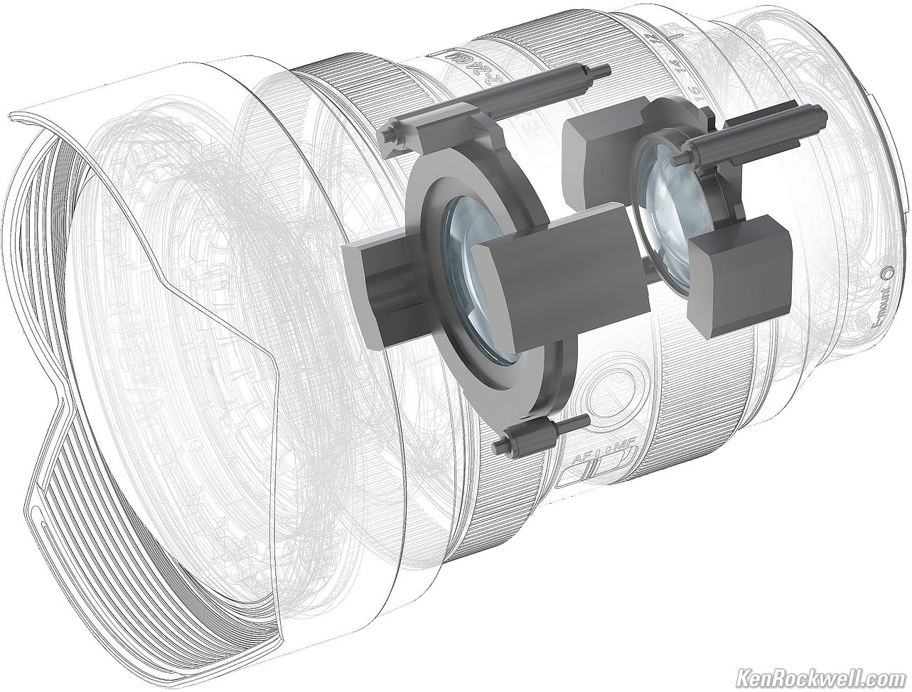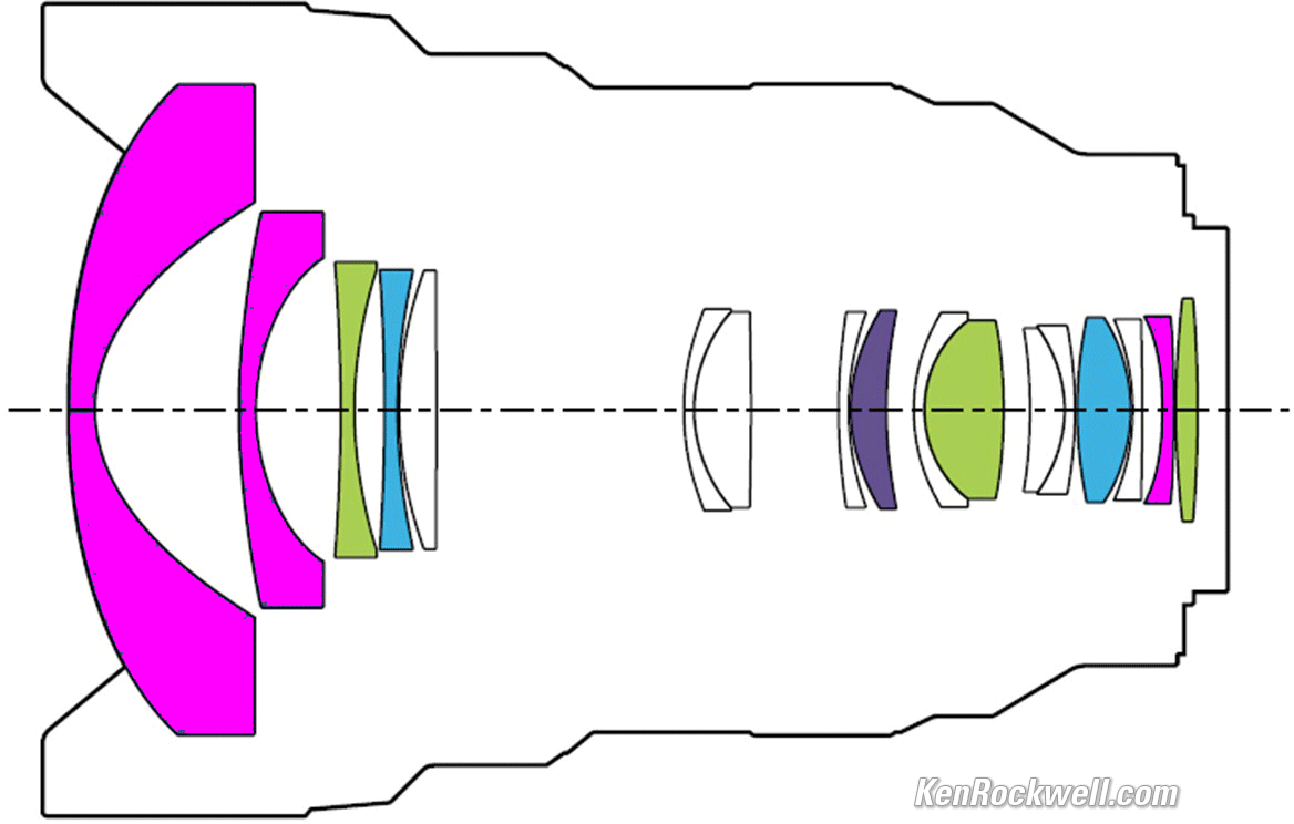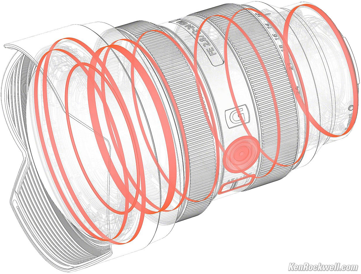 Optics specifications topSony FE 12-24mm f/2.8 GM internal optical construction. Extreme Aspherical ("XA"), Aspherical, Super ED and ED elements. bigger. 17 elements in 14 groups. Three Extreme Aspherical ("XA") elements. These are so precisely curved that they eliminate the "onion ring" effect seen in blur circles (bokeh) in other aspherical lenses. One Aspherical element. Two Super ED elements. Three ED elements. Fluorine front (only) coating to resist dirt and smudges. New Nano AR Coating II used on the rear of the insanely curved front element. This coating addresses the color shift problems all coatings have when addressed at different angles. What makes it interesting is that it's applied with the same thickness in all places; in older times manufacturers had to vary coating thicknesses away from the center to keep the color transmission (rendition) the same in the corners. It's an in-barrel pumper zoom: the front and rear groups both move in and out inside the barrel as zoomed.