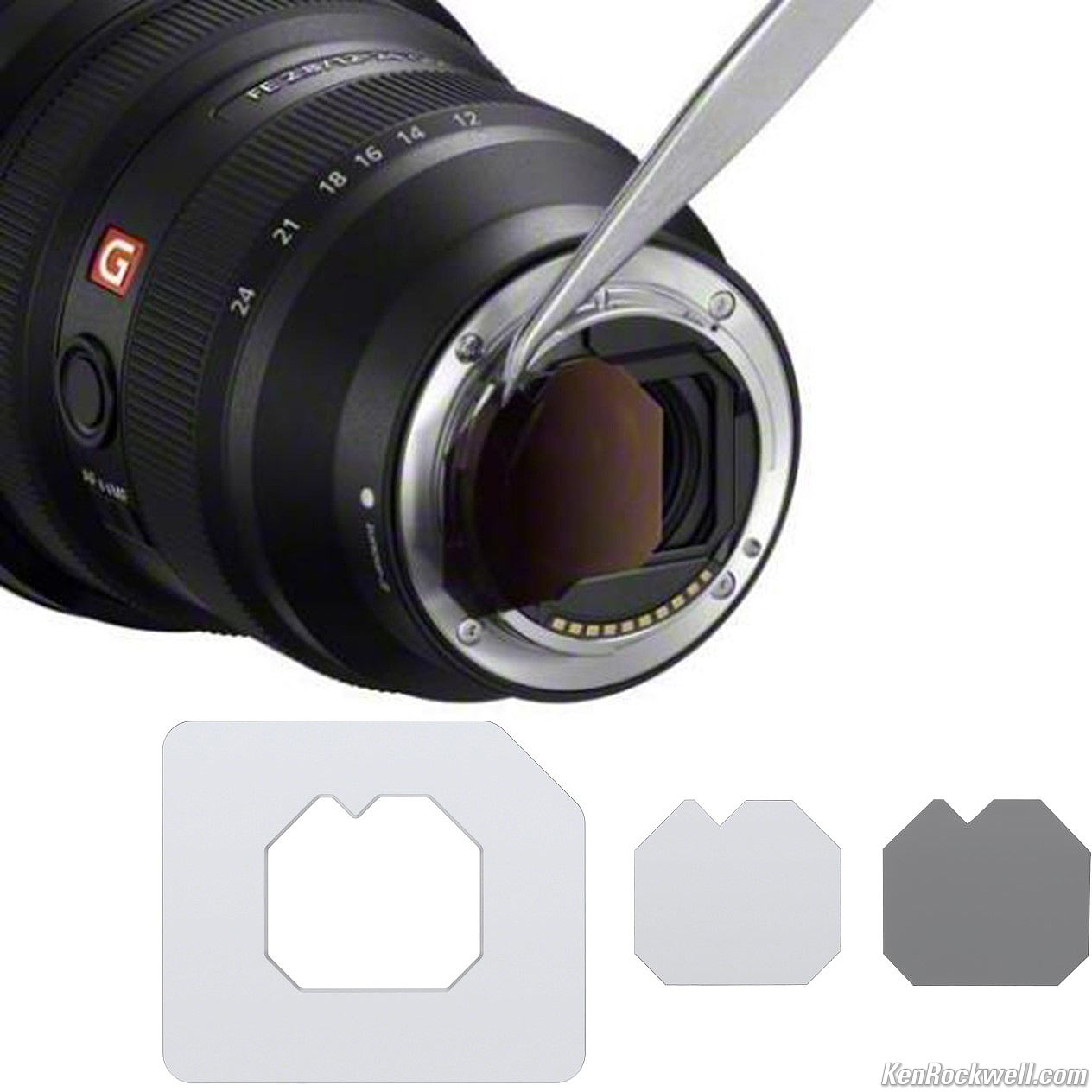 Sony 12-24mm f/2.8 Filter Usage user's guide topCut a "gel" (gelatine) filter to the correct shape, then slip it in the rear slot with the lens off the camera. I haven't tried, but I don't like seeing tweezers; I'm used to gels being cut into much simpler shapes and carefully using my fingers: Sony 12-24mm f/2.8 rear gel filter holder. Use Kodak Wratten gelatine filters, the laboratory reference for optical quality and flatness for over a hundred years — better than glass. That's why they are so expensive. Be careful, they are delicate and a fingerprint or moisture will destroy them. Avoid Lee gel and Rosco Cinegel filters. They are inexpensive plastic (not gelatin) sheet filters for use over lighting; they aren't optically flat. Lee and Rosco filters are tough heat-resistant filters not intended to be used with lenses. Feel free to try them (some samples are pretty good), but if you don't like the results, you've been warned. You can get small swatchbooks very inexpensively which are big enough to cut-down to use here. Even if you cut polarizing material to fit, don't use polarizers on ultrawide lenses because the sky's natural polarization will appear as a dark band across the sky.