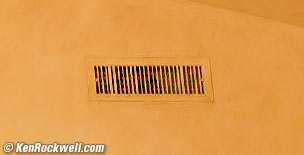 Spanish Home Interior, 9:02 PM, 17 July 2020. Sony A9 II, Sony FE 12‑24mm f/2.8 GM at 12mm wide-open at f/2.8 at 1/3 second at ISO 100 (LV 4.6), Perfectly Clear. bigger, full resolution or camera-original © JPG file. Ultra-sharp corner to corner wide-open at f/2.8, and no problems with color-shift in the corners. I'd never actually shoot an interior at f/2.8; I'd shoot it at f/8 or f/11 to get more than just the midfield in focus. I shot this at f/2.8 as a torture-test for you folks who want to see how well this lens performs when it's used at its least sharp aperture. For those of you with really sharp eyes, you'll notice in the full resolution file that the Sony FE 12‑24mm f/2.8 is so sharp, even wide-open, that there is some aliasing on the HVAC vent grille above and to the right of the fireplace! Crop from above the the fireplace, right side. These are shot as Standard JPGs; no FINE JPGs or RAW files were used or needed. The camera-original © JPG files for both these images look dark because I expose deliberately for the highlights and then bring up the shadows in Photoshop CS6 in my Mac Pro with Perfectly Clear. Yes, I always shoot JPG and do all this from the JPG files. Introduction topSample Images Intro Compatibility Specifications Performance Compared