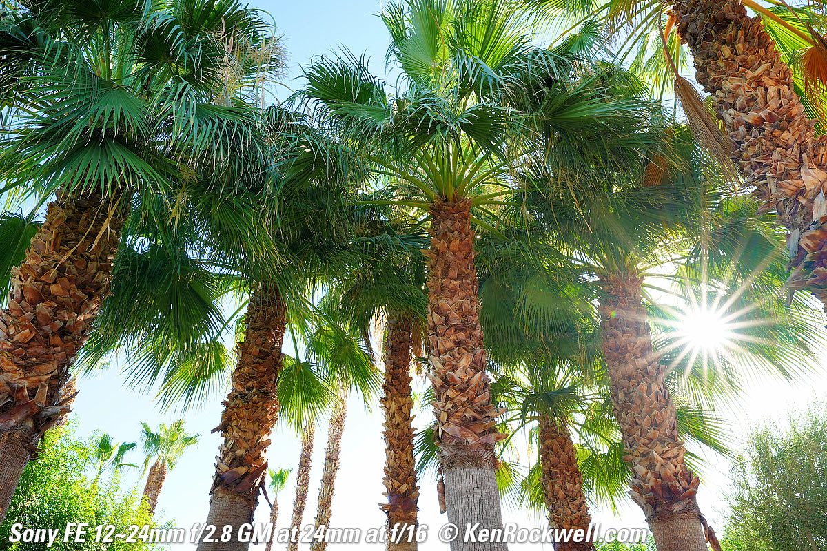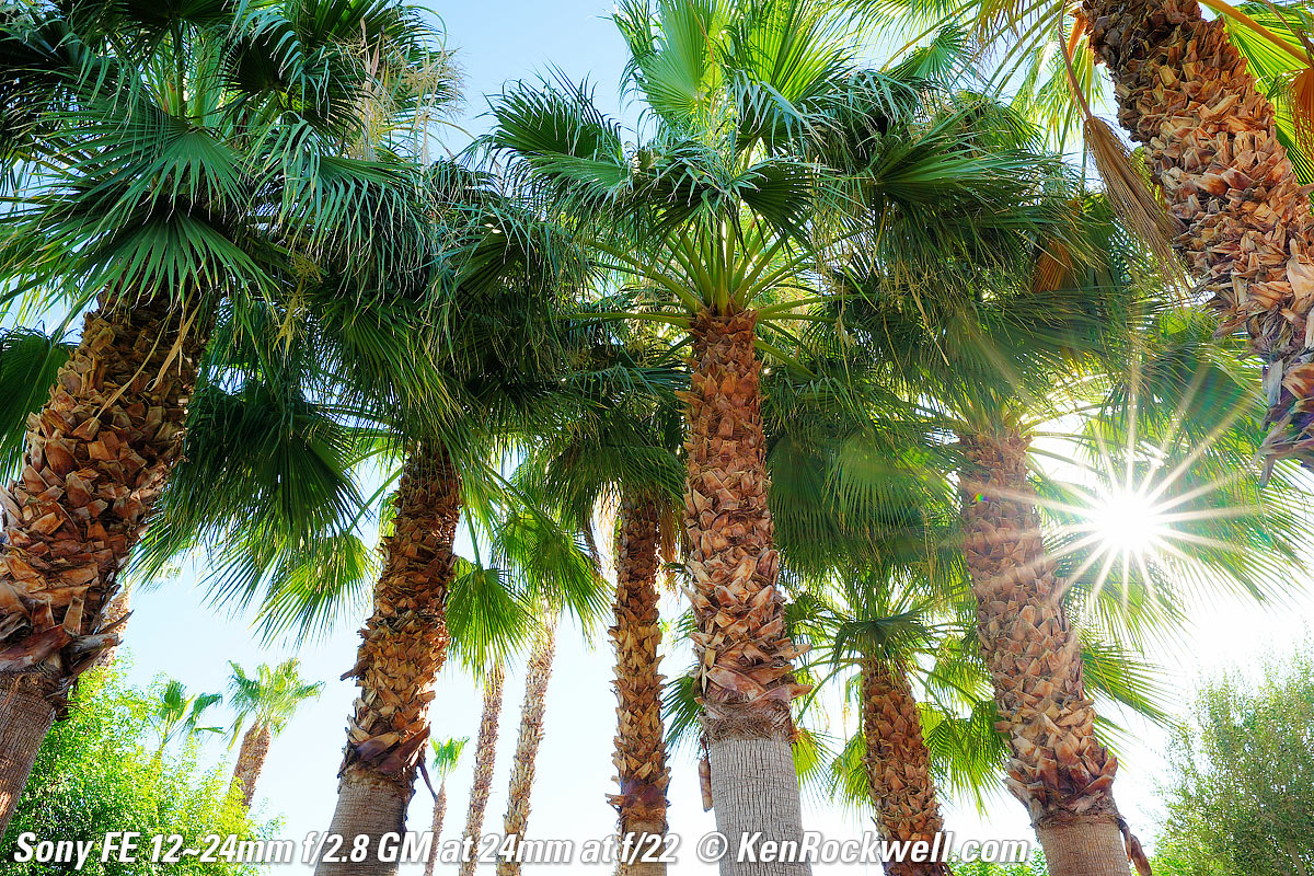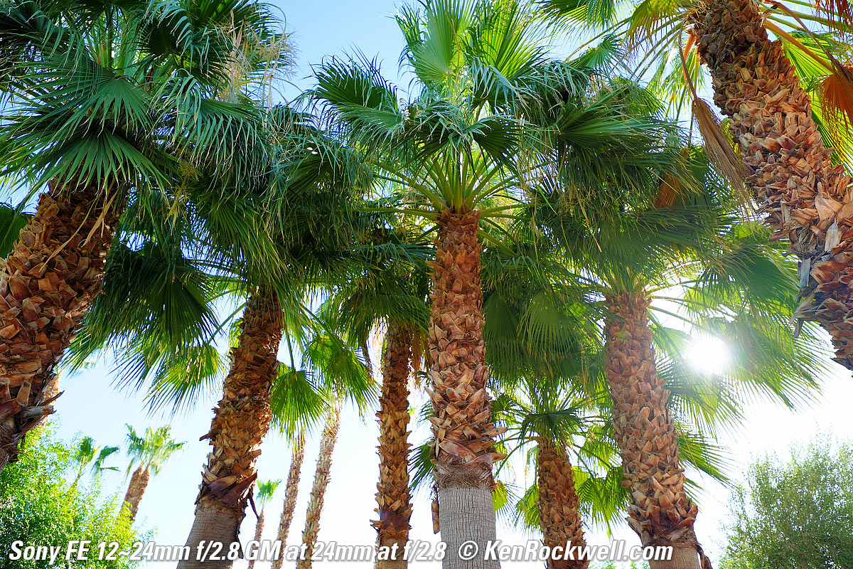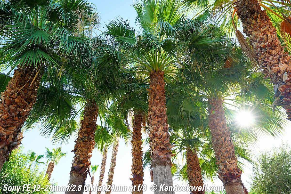 Sample Images topSample Images Intro Compatibility Specifications Performance Compared These are just snapshots and there are many more throughout the review; my real work is in my Gallery. Seven Palms Oasis, La Quinta, California, by Starlight, 9:07 PM, 24 July 2020. Sony A9 II, Sony FE 12‑24mm f/2.8 GM at 12mm wide-open at f/2.8 for 30 seconds at ISO 200 (LV -2.9), Tungsten white balance to keep sky blue, Perfectly Clear. bigger, full resolution or camera-original © JPG file. This is ultrasharp corner-to-corner wide-open at f/2.8, remembering of course that I'm focused at about 5 meters and closer or farther-away things aren't in focus. The fronds are all blurry because they're blowing around in the wind and the stars are moving in this half-minute time exposure, and yes, I got a sunstar even shot here at f/2.8 — bravo Sony!