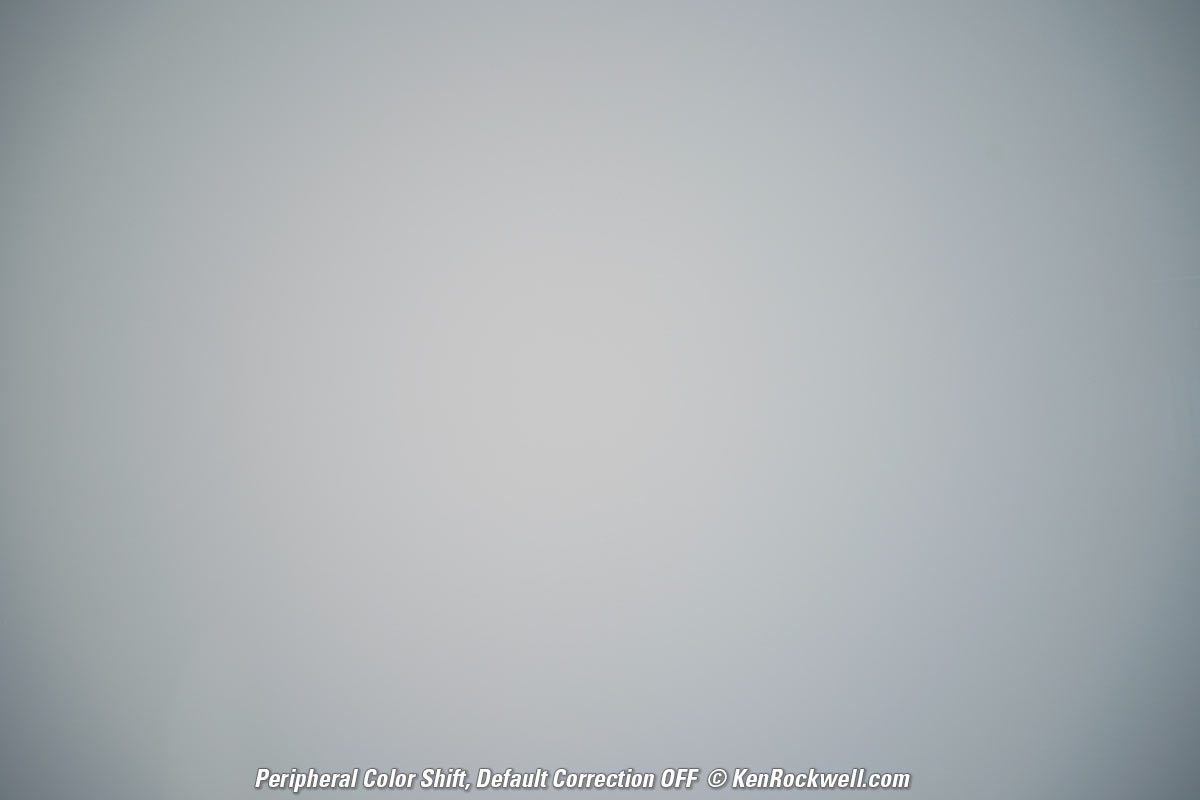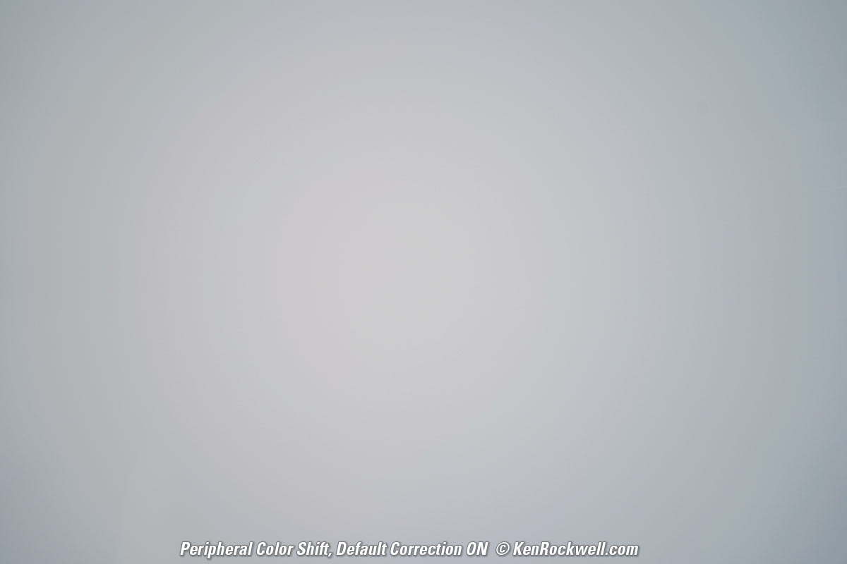 Peripheral Color Shifts performance topUltra-ultrawide lenses shift color in the corners because anti-reflection coatings work differently at different colors at different angles. As you know, anti-reflection coatings work by taking advantage of interferences at various wavelengths, and the effective wavelengths change as the effective coating thicknesses change as seen from different angles. This isn't an issue with ordinary lenses, but with lenses like this where the sides of the pictures are looking more hard right or left than in front of you, it matters. Luckily I've never seen this in normal photos with this lens, even if I can exaggerate it by shooting blank plates below. Oddly Sony's default falloff correction doesn't correct completely for peripheral color: Sony 12-24mm f/2.8 Peripheral Color Shift at 12mm at f/5.6. bigger.