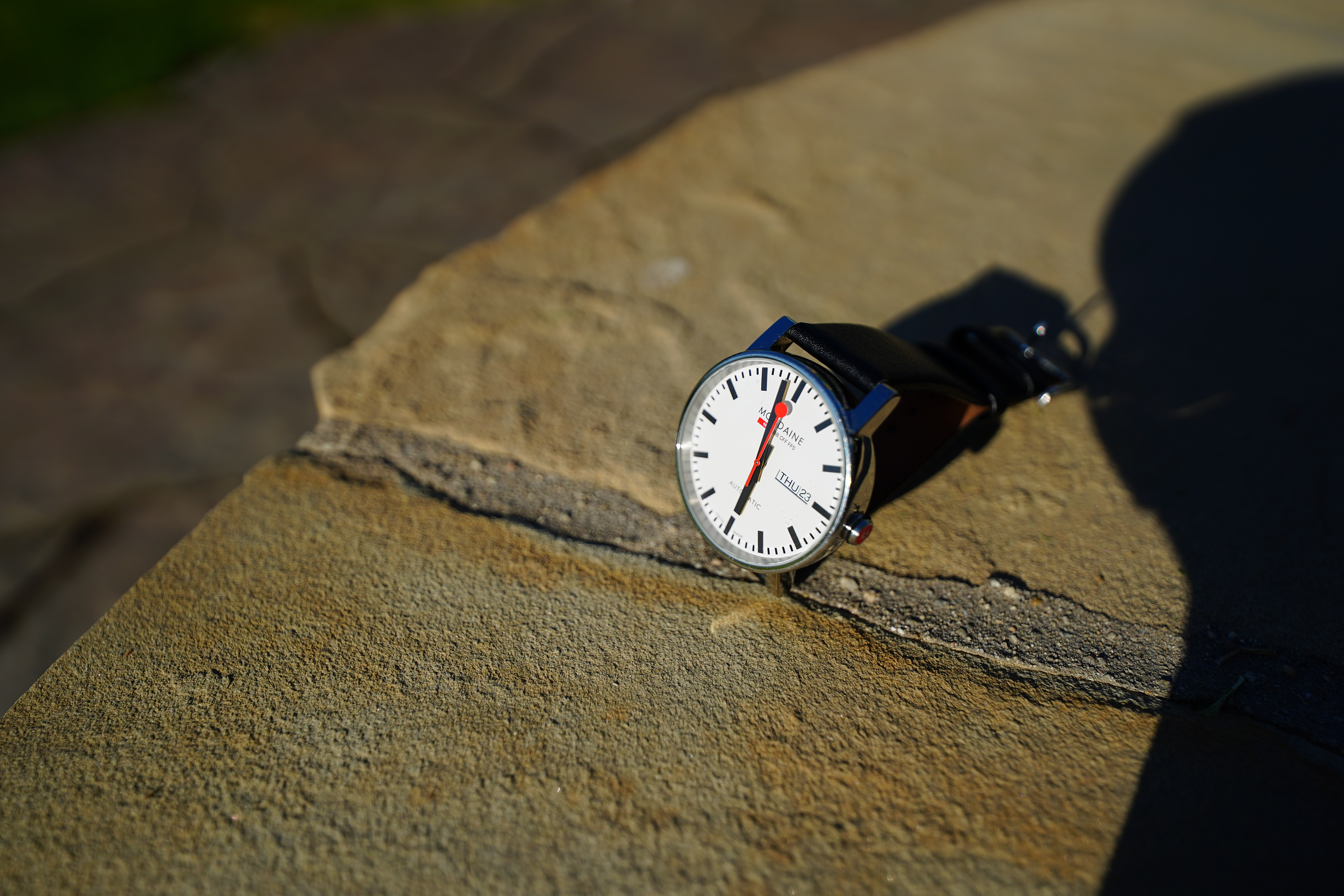 Spherochromatism performance topSpherochromatism, also called secondary spherical chromatic aberration or "color bokeh," is an advanced form of spherical and chromatic aberration in a different dimension than lateral chromatic aberration. It happens mostly in fast normal and tele lenses when spherical aberration at the ends of the color spectrum are corrected differently than in the middle of the spectrum. Spherochromatism can cause colored fringes on out-of-focus highlights, usually seen as green fringes on backgrounds and magenta fringes on foregrounds. Spherochromatism is common in fast lenses of moderate focal length when shooting contrasty items at full aperture. It goes away as stopped down. Ultrawides usually don't suffer from spherochromatism, and luckily this 12-24 has no spherochromatism worth worrying about: Mondaine A132.30348.11SBB at close-focus distance at f/2.8 at 24mm, 23 July 2020. bigger or camera-original © file.