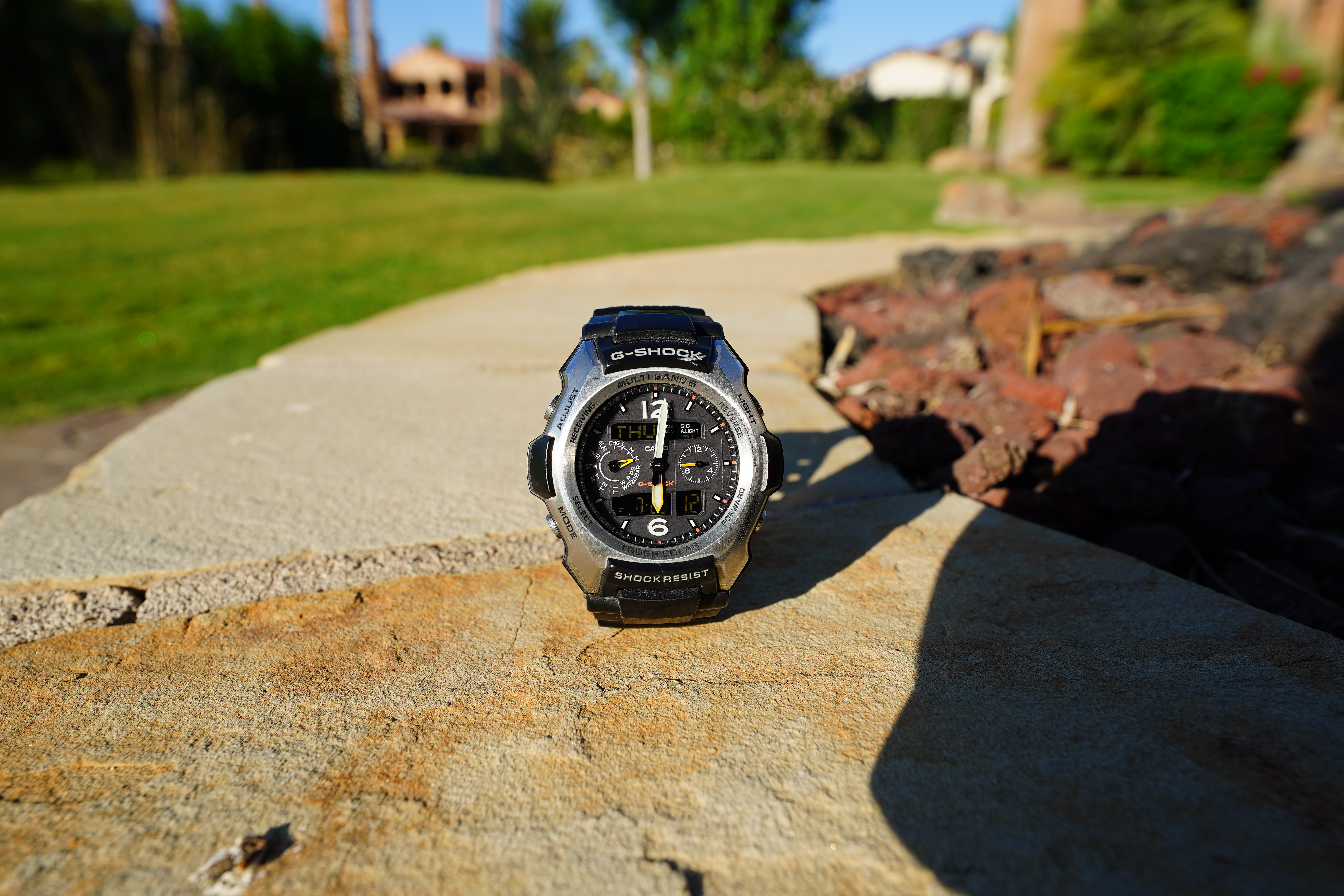 At f/8It's even sharper at f/8: Casio G-Shock Solar Atomic Watch at close-focus distance, 23 July 2020. bigger or camera-original © file. 1,200 × 900 pixel crop from above. bigger or camera-original © file. If this 1,200 × 900 pixel crop is about 3" (7.5cm) wide on your screen, then the complete image printed at this same large magnification would be about 10 × 15" (25 × 38cm). If this 1,200 × 900 pixel crop is about 6" (15cm) wide on your screen, then the complete image printed at this same extreme magnification would be about 20 × 30" (50 × 75cm). If this 1,200 × 900 pixel crop is about 12" (30cm) wide on your screen, then the complete image printed at this same insanely high magnification would be about 40 × 60" (1 × 1.5 meters).