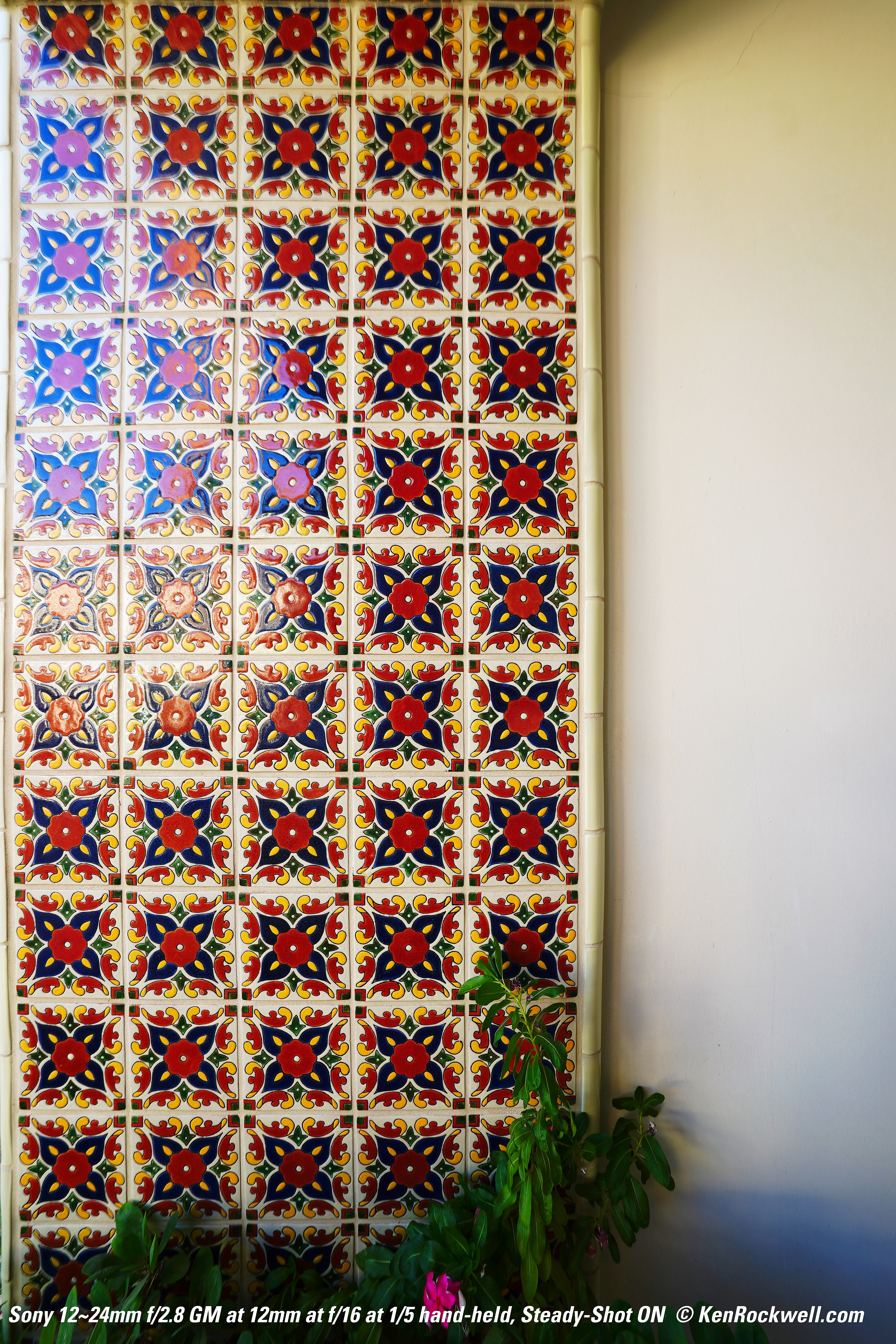Image Stabilization performance topThis lens has no Optical Image Stabilization, instead hoping you have a camera with sensor-shift stabilization. Sadly sensor-shift stabilization only works well in the center of the image for ultrawide lenses; for it to work well in the corners your sensor would have to be made of rubber and move about twice as far (1/(cos(122º/2)) in the corners to correct as well as it does in the center. Since the sensor-shift system moves the sensor so the center is corrected the best, it nulls-out camera shake in the center, but can't do much for the corners. You'll see the center is sharp in these images whether hand-held or tripod-mounted, while the corners suffer from camera-shake in the hand-held versions. I left Steady-Shot ON even when I was on the tripod, and as you can see it's smart enough not to muck-up anything. Full images: