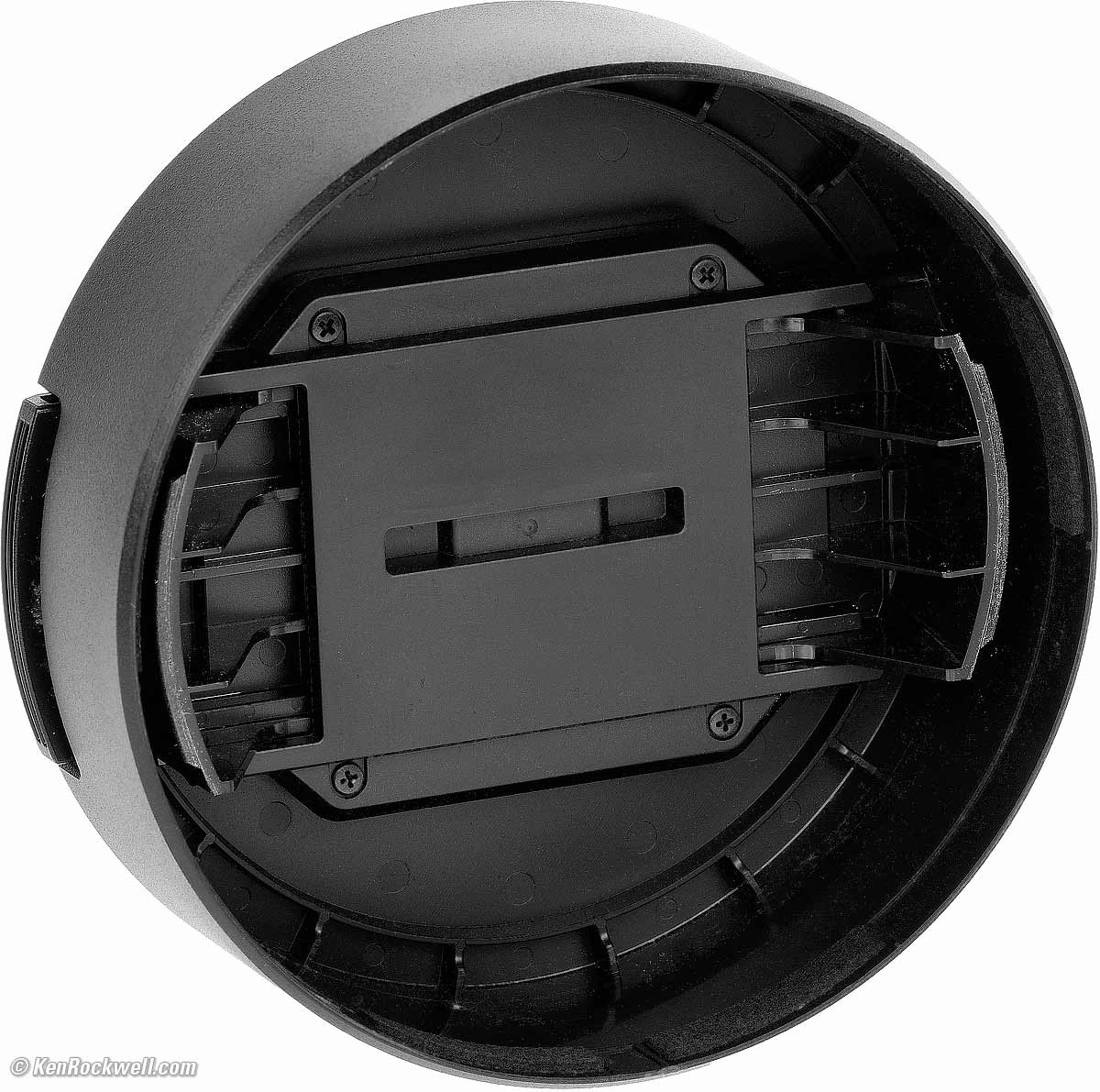 Inside front cap, Sony FE 12-24mm f/4 G. bigger. This dedicated plastic front cap goes on at any angle, and seals much better than Canon's cap for it's ultra-ultrawides. The Sony front cap "catches" on a ridge around the front element and holds on very well; you have to press both releases to get it off. The Sony cap also covers the entire front of the lens, not letting any part lie open as Canon's caps do, and the Sony cap has six sections of synthetic felt to ensure that the cap doesn't wear the outside of the lens, as Canon's and Nikon's caps do. Here's the awful cap Canon includes with the11-24mm, the garbagy one included with the Canon 14/2.8 L II and Nikon's sad excuse for the cap included with the 14-24mm f/2.8 ED.
