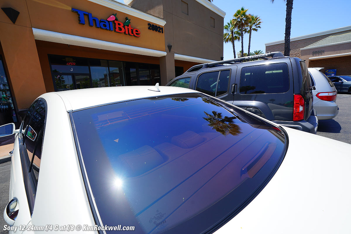 FormatTop Sample Images Intro Format I'd get mine at Adorama, at Amazon, at B&H or at Crutchfield, or get it used if you know How to Win at eBay. This is a full-frame lens and I'm reviewing it as such. It works great on APS-C cameras and you may make the usual inferences for them. This full-frame ultra-ultrawide lens is foolish to use on APS-C because you're paying a huge premium in size and money for this full frame ultrawide, which on APS-C is simply a unstabilized wide zoom. 56% of its image area is simply wasted with the cropped sensors of APS-C cameras. For APS-C cameras, an APS-C lens is the best idea. This 12-24 offers no image quality advantage over an APS-C lens of the same focal length.