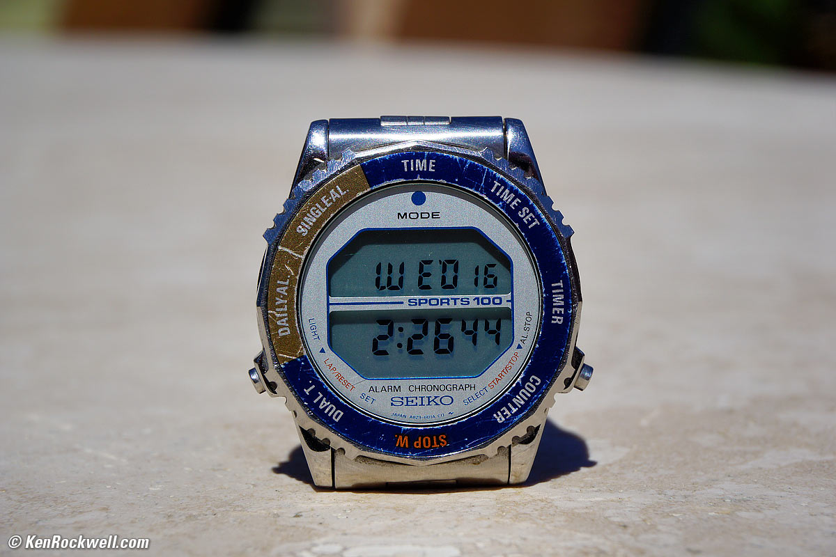 Crop from above at 100%. If this is about 6" (15cm) on your screen, printing the complete image at this same high magnification would result in a 40 x 60" (3.5 x 5 feet or 1 x 1.5 meter) print! This is super-sharp; what looks like grain is the actual finish of the watch, not noise in the camera.