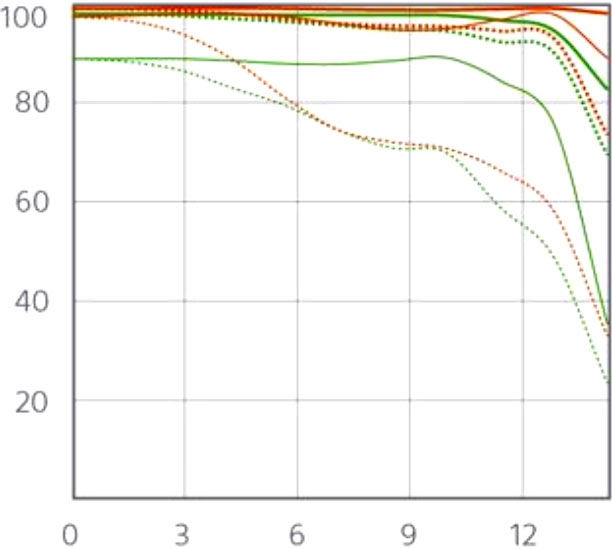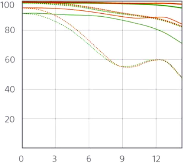 Image Stabilization (OSS)Optical Image Stabilization (OSS or Optical Steady Shot) works extremely well. I can almost always shoot at 1/15 at the long end and 1/8 at the wide end and get perfect sharpness. "Percent Perfectly Sharp Shots" are the percentage of frames with 100% perfect tripod-equivalent sharpness. Hand tremor is a random occurrence, so at marginal speeds some frames will be perfectly sharp with others in various stages of blur — all at the same shutter speed. This rates how many shots are perfectly sharp, not how sharp all the frames are.