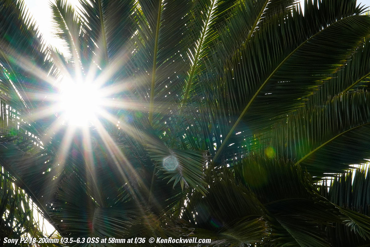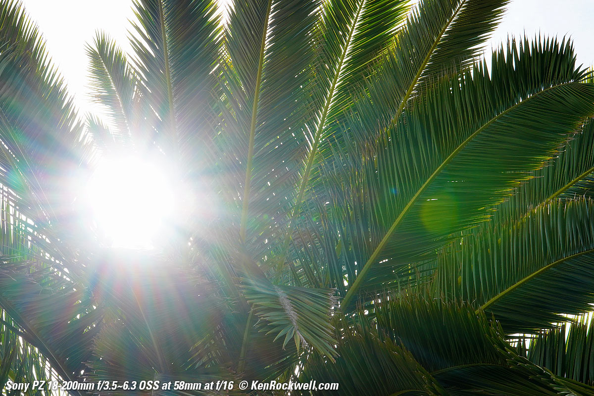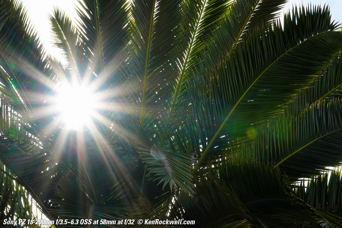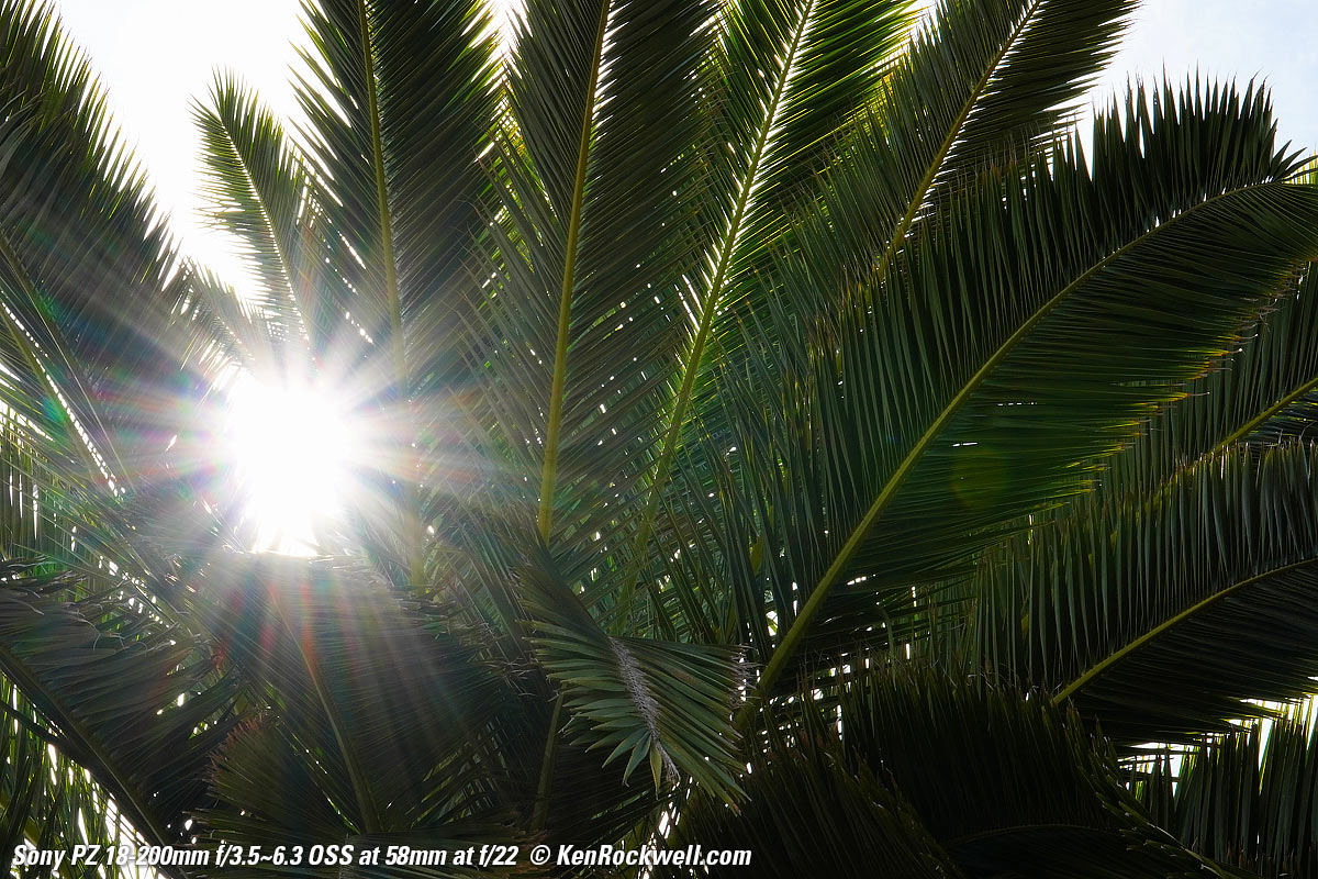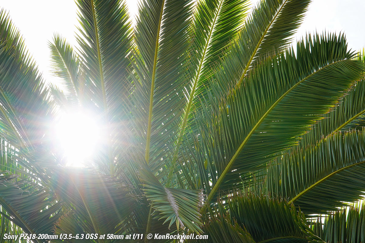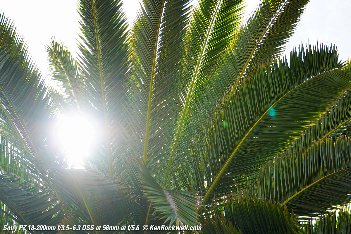 Sony E 18-200mm OSS PZAPS-C E-Mount (2013-)Sony: A9 III A1 II A1 A9 II A7R V A7R IV A7 V A7 IV A7 III A7S III A7CR A7C II A7c FX3 FX2 ZV-E1 A6700 A6600 A6400 ZV-E10 II ZV-E10 ZV-1 II RX1R III RX10/4 RX100/7 Flash Lenses Sony E 18-200mm f/3.5-5.6 OSS PZ (APS-C, 67mm filters, 22.9 oz./648g, 1'/0.3m (@18mm) ~ 1.6'/0.5m (@200mm) close focus, get it used if you know How to Win at eBay or check at Amazon). bigger. This 100% all-content, junk-free website's biggest source of support is when you use those or any of these links to my personally-approved sources when you get anything, regardless of the country in which you live. Sony does not seal its boxes in any way, so never buy at retail or any other source not on my personally approved list since you'll have no way of knowing if you're missing accessories, getting a defective, damaged, returned, store demo or used lens. Buy only from the approved sources I use myself for the best prices, service, return policies and selection. Thanks for helping me help you! Ken. Hot March 2019 Sony Sony Lenses Zeiss Nikon Canon Fuji LEICA All Reviews Sample ImagesTop Sample Images Intro Format These are all shot hand-held as Standard JPGs; no RAW or FINE JPGs or tripods were used or needed. Palm Trunk, 7:13AM, 14 March 2019. Sony A6400, Sony 18-200mm PZ at 37mm, f/8 at 1/160 at Auto ISO 100, Perfectly Clear. bigger, full-resolution or camera-original © file.