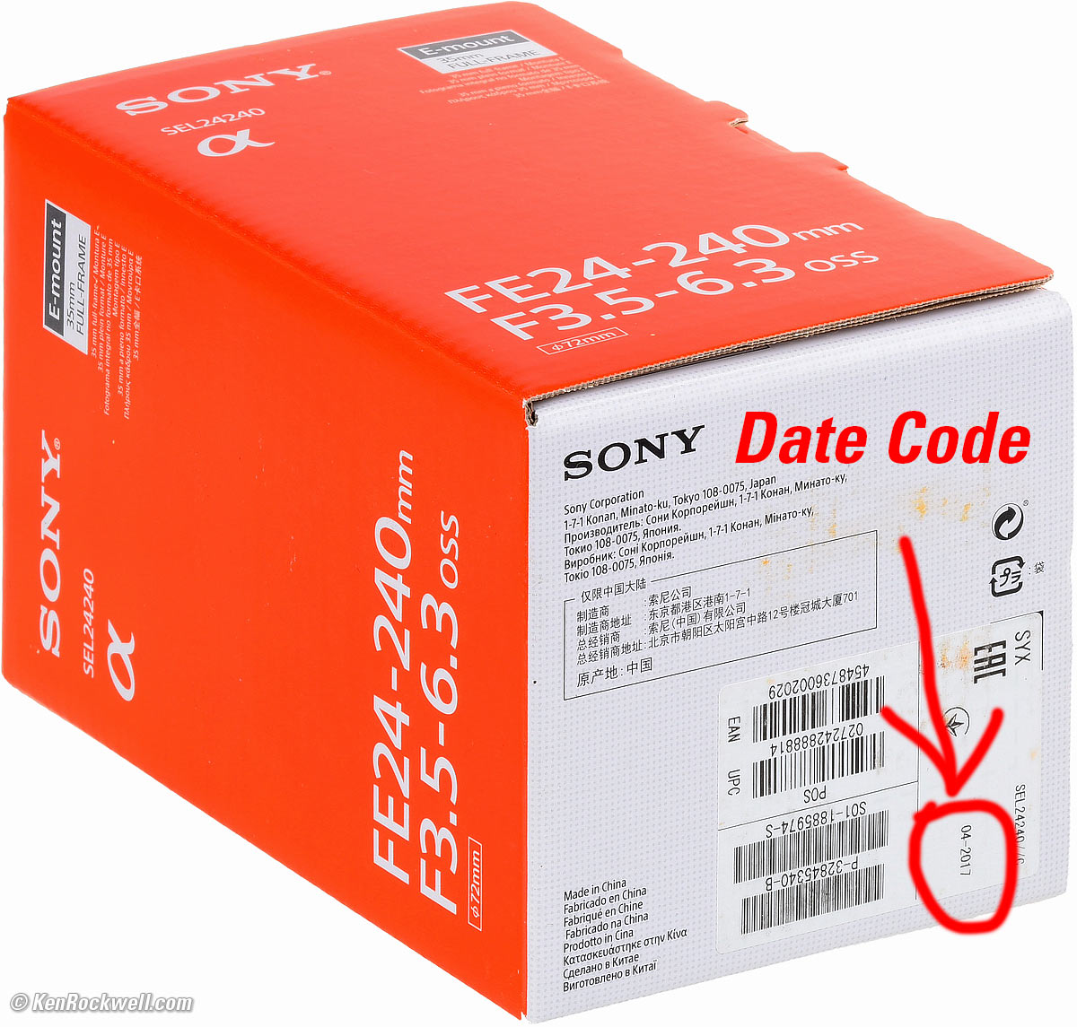 Date CodeNone found on lens, but it is marked on the box: Sony FE 24-240mm f/3.5-6.3 OSS. bigger.