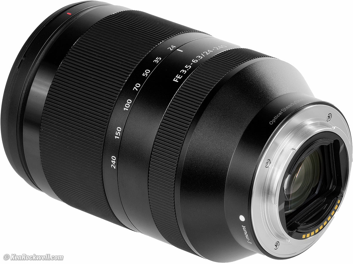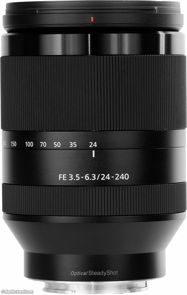 Sony 24-240mmE-Mount Full-Frame FE OSSSample Images Intro Format Compatibility Specifications USA Version Performance Sony: A9 III A1 II A1 A9 II A7R V A7R IV A7 V A7 IV A7 III A7S III A7CR A7C II A7c FX3 FX2 ZV-E1 A6700 A6600 A6400 ZV-E10 II ZV-E10 ZV-1 II RX1R III RX10/4 RX100/7 Flash Lenses Sony FE 24-240mm f/3.5-6.3 OSS (covers full-frame and APS-C, 72mm filters, 27.5 oz./780g, 2'/0.6m close focus, $1,048) bigger. I got mine at B&H. I'd also get it at Adorama, at Amazon or at Crutchfield, or get it used at eBay (How to Win at eBay). This all-content, junk-free website's biggest source of support is when you use those or any of these links to my personally-approved sources when you get anything, regardless of the country in which you live. Sony does not seal its boxes in any way, so never buy at retail or any other source not on my personally approved list since you'll have no way of knowing if you're missing accessories, getting a defective, damaged, returned, non-USA, store demo or used lens. Get yours only from the approved sources I use myself for the best prices, service, return policies and selection. Thanks for helping me help you! Ken.