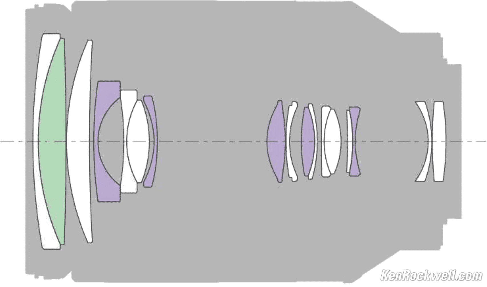 Optics24-240 internal construction. Aspherical and ED elements. bigger. 17 elements in 12 groups. 1 ED extra-low dispersion element, which helps reduce secondary axial chromatic aberration. 5 aspherical elements. Pumper zoom; the front extends as zoomed longer. Internal focus.