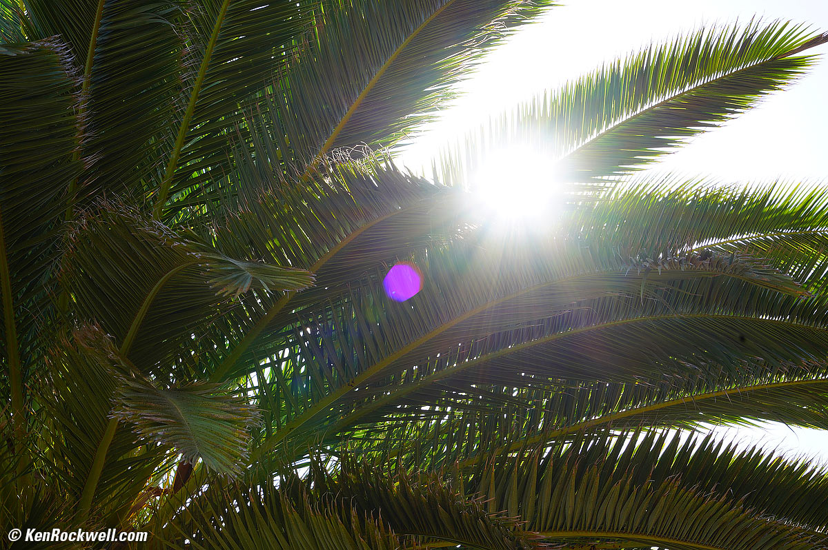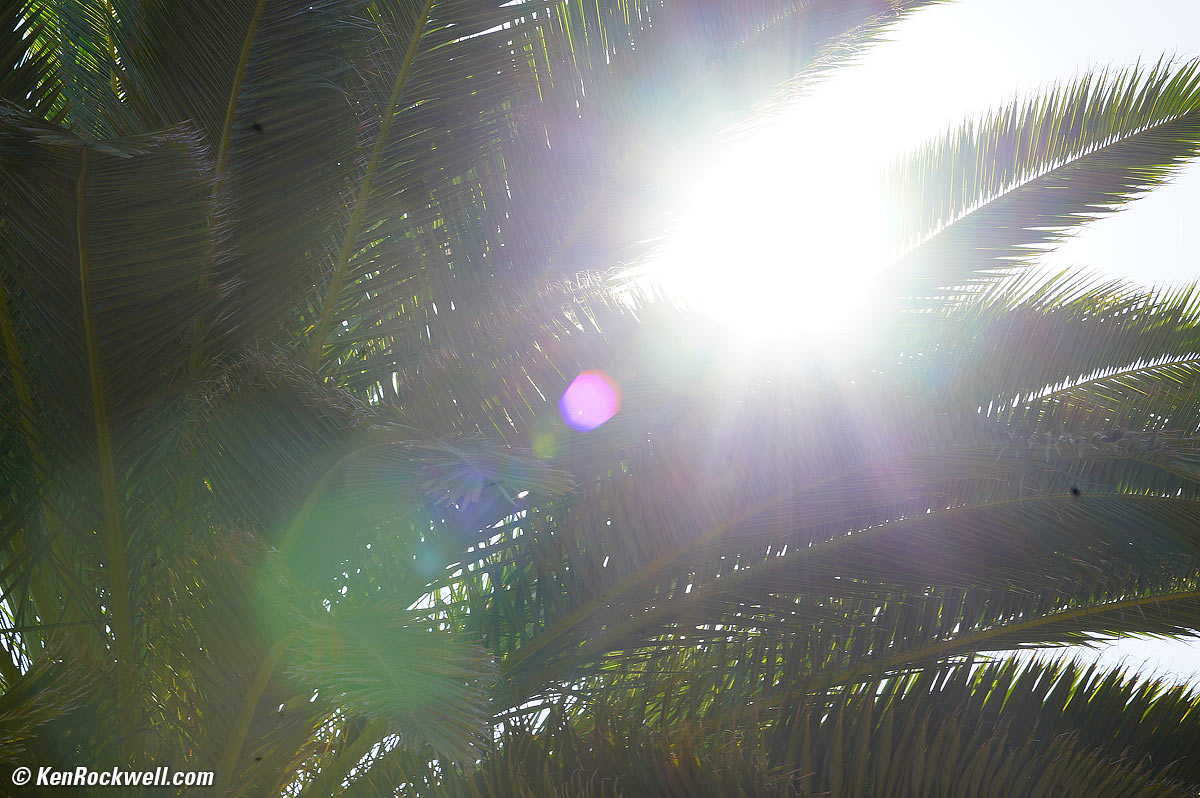 Flare & GhostsThe Sony 24 240 is quite resistant to ghosts. This is about as bad as you can get: Sun behind palm, no filter, 09 August 2017. Sony A9, Sony 24-240mm at 100mm at f/16 at 1/30 at Auto ISO 100. bigger. Of course if you use a dirty or single-coated filter, you will get more flare from the filter: Sun behind palm as shot with a simple single-coated filter, 09 August 2017. Sony A9, Sony 24-240mm at 100mm at f/16 at 1/50 at Auto ISO 100. bigger. The dark dot on the right is from Sony A9 sensor dirt.