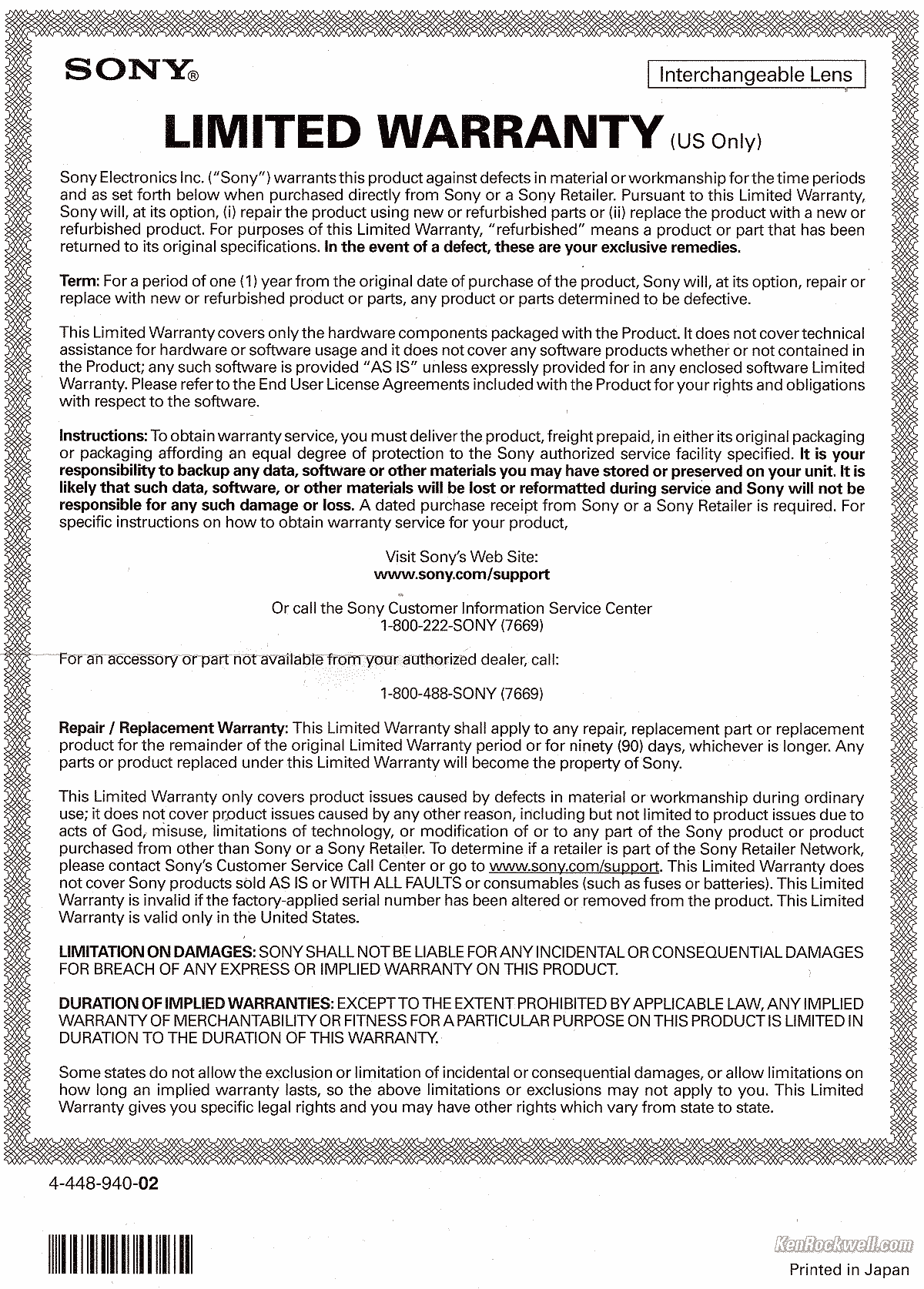 Getting a Legal USA Version(applies in USA only) Top Sample Images Intro Format In the USA, along with whatever else is in your box, be sure you get a folded USA Warranty slip like this that says "US Only" and has the (800) 222-SONY number: Sony USA Warranty slip. bigger. If not, you got ripped off with a gray market version from another country. This is why I never buy anyplace other than from my personally approved sources. You just can't take the chance of buying elsewhere, especially at any retail store, because non-USA versions have no warranty in the USA. If a gray market version saves you $300 it may be worth it, but for $200 or less I wouldn't risk having no warranty or support. Always be sure to check your paperwork while you can still return it, or just don't buy from unapproved sources or at retail so you'll be able to have your lens serviced as needed. US versions like mine may also include manuals in extra languages and extra foreign warranty cards; so long as you have an English manual and a US Only warranty card, you're good. Get yours from the same places I do and you won't have a problem, but if you take the risk of getting yours elsewhere, be sure to check everything while you still can return it.