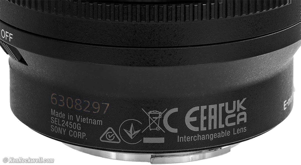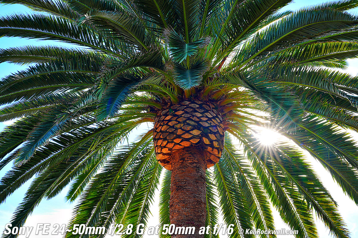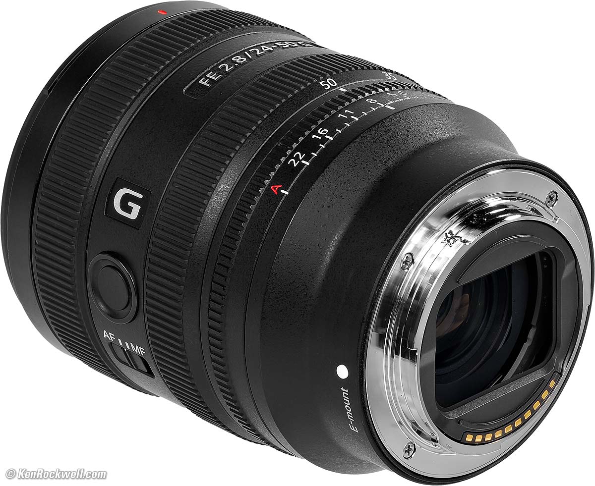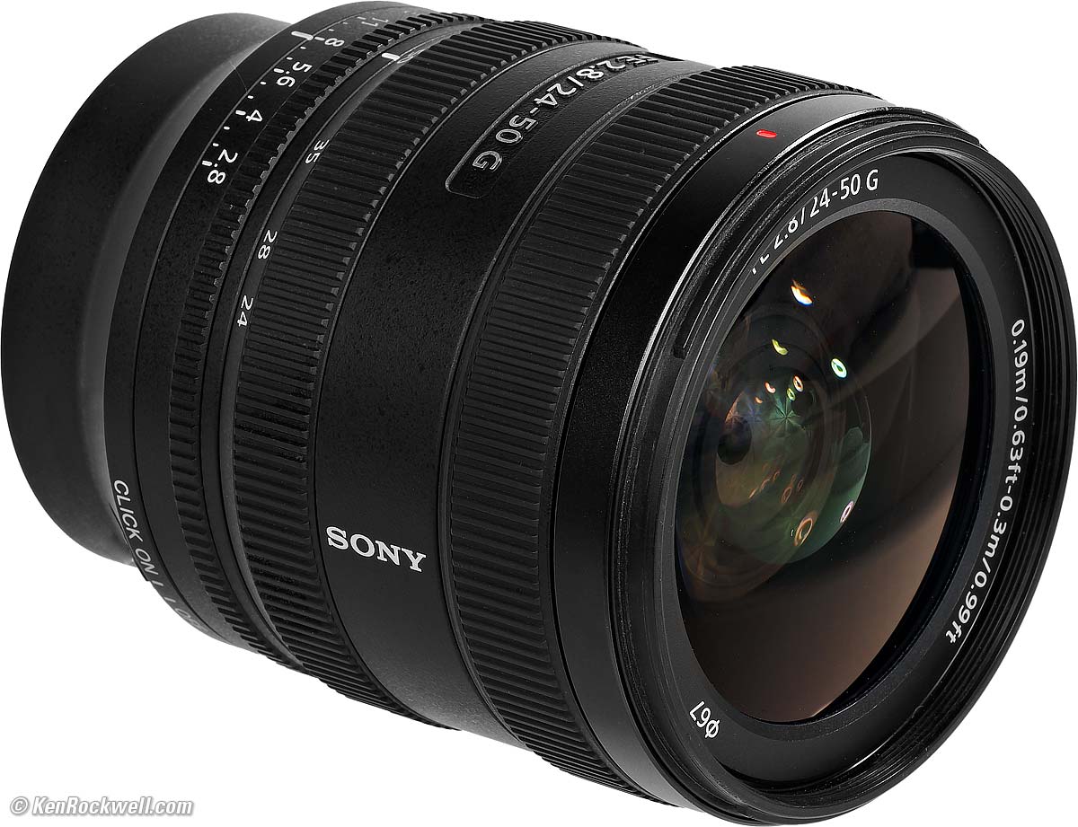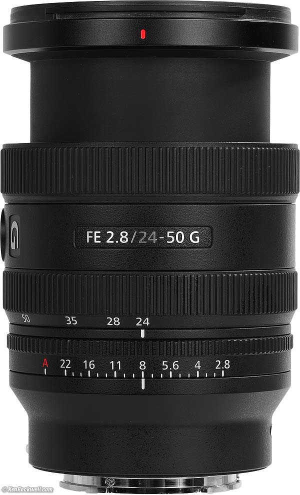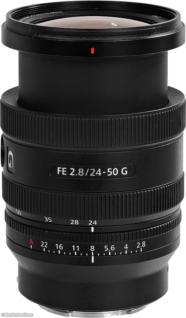 Sony FE 24-50mm f/2.8 GFull-Frame Ultrawide (2024 ~ today)Sample Images Intro New Good Bad Missing Specifications Performance Recommendations Sony: A9 III A1 II A1 A9 II A7R V A7R IV A7 V A7 IV A7 III A7S III A7CR A7C II A7c FX3 FX2 ZV-E1 A6700 A6600 A6400 ZV-E10 II ZV-E10 ZV-1 II RX1R III RX10/4 RX100/7 Flash Lenses Sony FE 24-50mm f/2.8 G (67mm filters, 15.5 oz./440g, 0.8'/0.25m close focus, 0.3× macro ratio, $1,298). bigger. I'd get mine at B&H, at Adorama, at Amazon or at Crutchfield, or get it used at eBay (How to Win at eBay), or get it used at KEH. This 100% all-content, junk-free website's biggest source of support is when you use those or any of these links to my personally approved sources I've used myself for way over 100 combined years when you get anything, regardless of the country in which you live — but I receive nothing for my efforts if you take the chance of getting it elsewhere. Sony does not seal its boxes in any way, so never buy at retail or any other source not on my personally approved list since you'll have no way of knowing if you're missing accessories, getting a defective, damaged, returned, dropped, incomplete, gray-market, store demo or used lens — and my personally approved sources allow for 100% cash-back returns for at least 30 days if you don't love your new lens. I've used many of these sources since the 1970s because I can try it in my own hands and return it if I don't love it, and because they ship from secure remote warehouses where no one gets to touch your new lens before you do. Buy only from the approved sources I've used myself for decades for the best prices, service, return policies and selection.