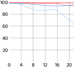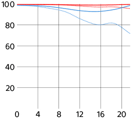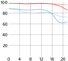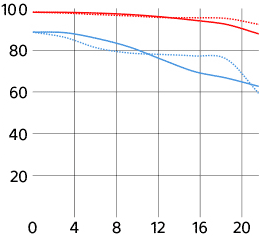 Sony's MTF at 10 cyc/mm and 30 cyc/mm. Sagittal (radial) shown as solid lines. Meridional (tangential) shown as dashed lines. While it's usually valid to compare rated MTFs between different lenses of similar vintage from the same maker, every maker measures or simply calculates MTF very differently, and therefore one cannot compare these curves between brands. For instance, Sony seems to ignore diffraction and simply calculate overly optimistic MTFs that hug 100%, which no real lens can do at f/8, while other brands are more realistic and include diffraction. Only Canon offers any insight on how they arrive at their curves. See also my article on MTF and Canon's article on MTFs.