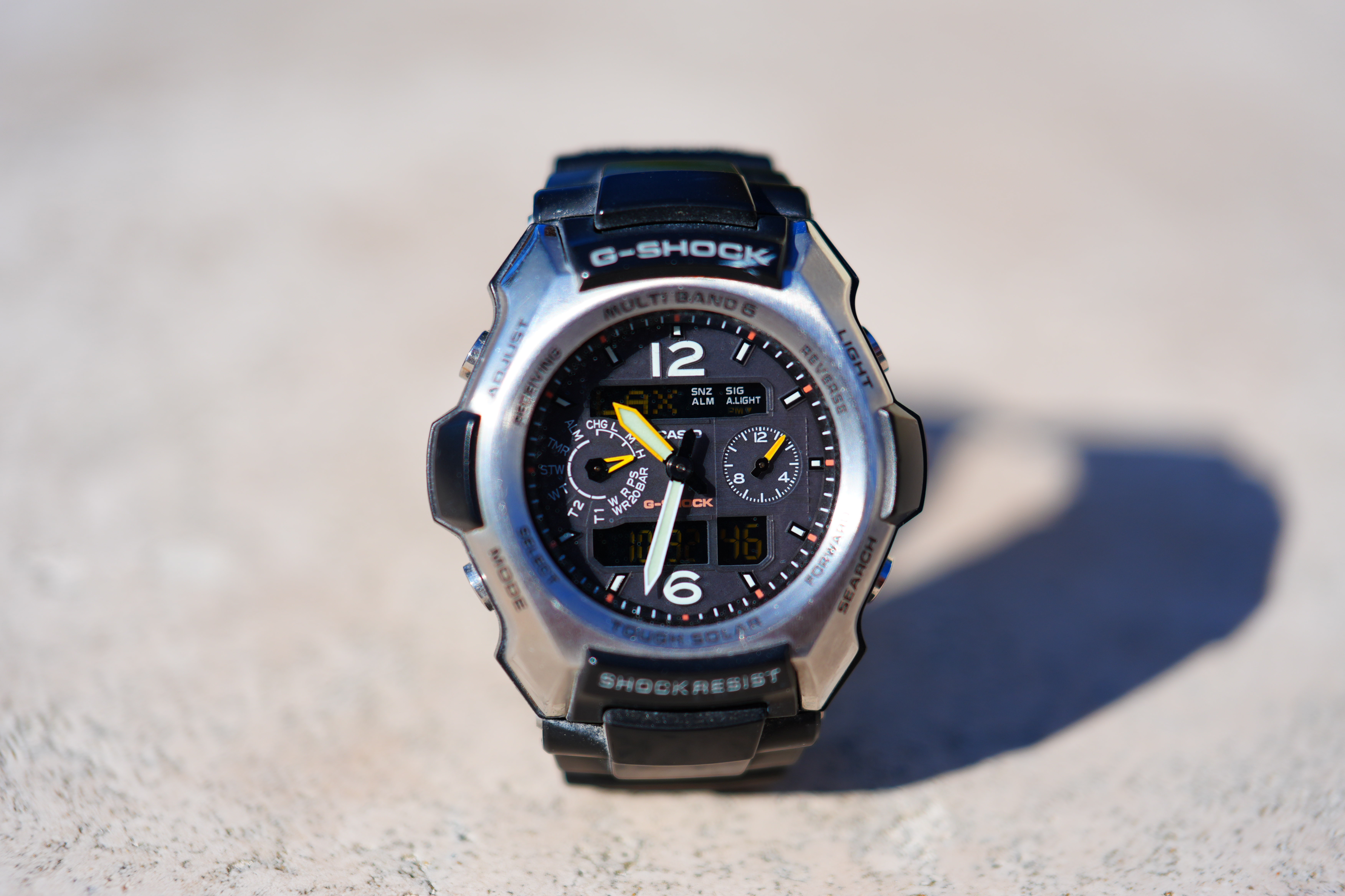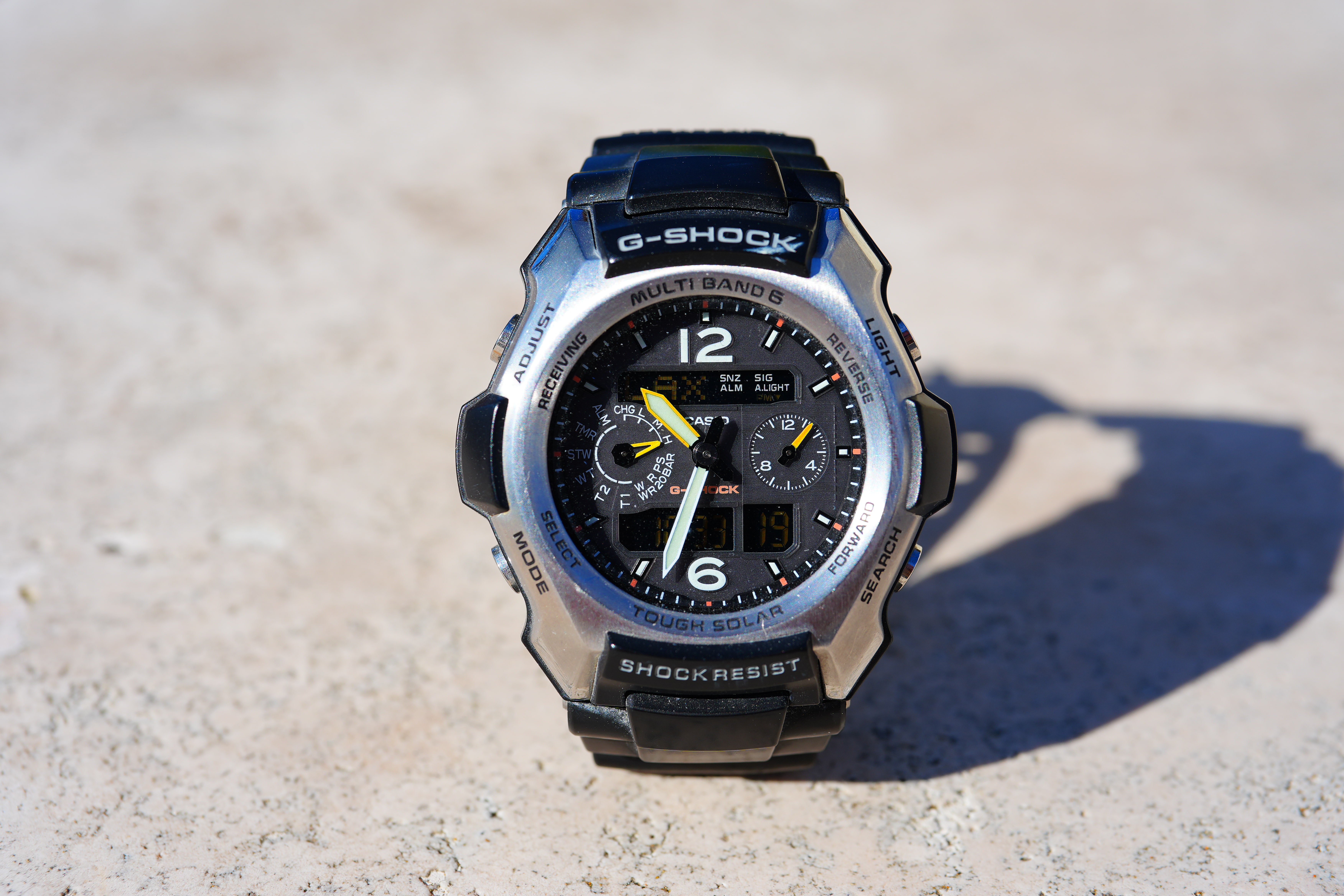 At f/8As with all lenses, it's super sharp at f/8: Casio G-Shock Solar Atomic Watch at close-focus distance, 10:33 AM, Sunday, 21 December 2025. Sony A7 V, FE 24-50mm f/2.8 G at 50mm at f/8 at 1/320 at Auto ISO 100, +0.3 stops exposure compensation (LV 14.3). bigger or camera-original © file.